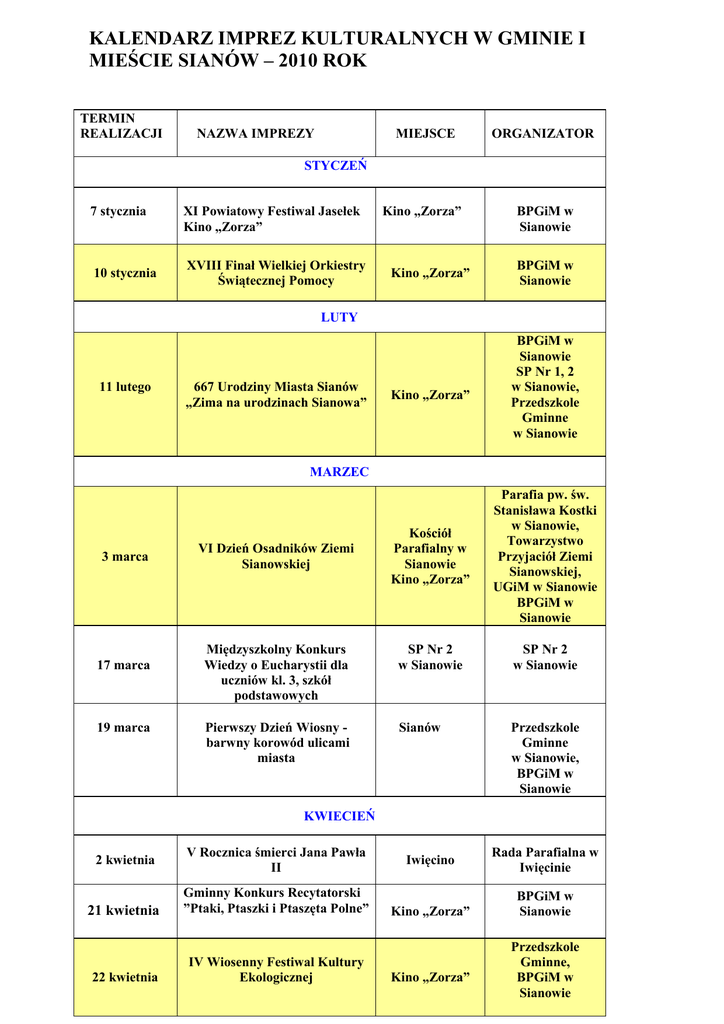KALENDARZ IMPREZ KULTURALNYCH W GMINIE I MIEŚCIE SIANÓW – 2010 ROK TERMIN REALIZACJI NAZWA IMPREZY MIEJSCE ORGANIZATOR Kino „Zorza” BPGiM w Sianowie STYCZEŃ 7 stycznia 10 stycznia XI Powiatowy Festiwal Jasełek Kino „Zorza” XVIII Finał Wielkiej Orkiestry Świątecznej Pomocy Kino „Zorza” BPGiM w Sianowie LUTY 11 lutego 667 Urodziny Miasta Sianów „Zima na urodzinach Sianowa” Kino „Zorza” BPGiM w Sianowie SP Nr 1, 2 w Sianowie, Przedszkole Gminne w Sianowie MARZEC 3 marca 17 marca 19 marca Kościół Parafialny w Sianowie Kino „Zorza” Parafia pw. św. Stanisława Kostki w Sianowie, Towarzystwo Przyjaciół Ziemi Sianowskiej, UGiM w Sianowie BPGiM w Sianowie Międzyszkolny Konkurs Wiedzy o Eucharystii dla uczniów kl. 3, szkół podstawowych SP Nr 2 w Sianowie SP Nr 2 w Sianowie Pierwszy Dzień Wiosny barwny korowód ulicami miasta Sianów Przedszkole Gminne w Sianowie, BPGiM w Sianowie VI Dzień Osadników Ziemi Sianowskiej KWIECIEŃ 2 kwietnia V Rocznica śmierci Jana Pawła II 21 kwietnia Gminny Konkurs Recytatorski ”Ptaki, Ptaszki i Ptaszęta Polne” 22 kwietnia IV Wiosenny Festiwal Kultury Ekologicznej Iwięcino Kino „Zorza” Kino „Zorza” Rada Parafialna w Iwięcinie BPGiM w Sianowie Przedszkole Gminne, BPGiM w Sianowie MAJ 3 maja I dekada maja 2 - 3 maja Obchody Święta Konstytucji 3 Maja, Odpust, Święto Strażaka VIII Majówka z Gimnazjum IV Grand Prix Skibno Tydzień bibliotek Iwięcino Gimnazjum Gminne im. Ireny Sendlerowej w Sianowie Rada Sołecka, OSP Iwięcino, SP w Iwięcinie, Rada Parafialna w Iwięcinie Gimnazjum Gminne im. Ireny Sendlerowej w Sianowie Dworek w Skibnie JKS Dako-Galant Skibno UGiM w Sianowie 8 - 15 maja „Słowa, obrazy, dźwięki” BPGiM w Sianowie BPGiM w Sianowie 6 maja Święto Szkoły Podstawowej Nr 1 - II urodziny patrona szkoły SP Nr 1 SP Nr 1 8 maja 65 rocznica zakończenia II Wojny Światowej Kino „Zorza” Park Miejski w Sianowie BPGiM w Sianowie UGiM w Sianowie 14 maja Nadanie imienia ZS w Dąbrowie Zespół Szkół w Dąbrowie Zespół Szkół w Dąbrowie Kino „Zorza” BPGiM w Sianowie 17 maja Gminny konkurs plastyczny „Podania i legendy z Suchej Koszalińskiej oraz najbliższej okolicy” 22 maja VI Festyn Rodzinny „Wszystko dla zdrowia” Przytok 27 maja Gminny Konkurs Matematyczny dla uczniów szkół podstawowych SP Nr 2 w Sianowie 28-30 maja XXIII Dni Ziemi Sianowskiej 29 maja Odpustowy Festyn Parafialny Sianów 28 maja IX Wojewódzki Konkurs Twórczości Karola Wojtyły Jana Pawła II Kino „Zorza” Sianów Przedszkole Gminne w Sianowie SP Nr 2 w Sianowie BPGiM w Sianowie UGiM w Sianowie Rada Parafialna w Sianowie Gimnazjum Gminne im. Ireny Sendlerowej w Sianowie CZERWIEC 5 czerwca XIII Ogólnopolski Bieg Uliczny im. Ryszarda Targaszewskiego Połączony z festynem z okazji Dnia Dziecka Sianów BPGiM w Sianowie UGiM w Sianowie 7 czerwca IX Gminny Sejmik Ekologiczny SP w Iwięcinie SP w Iwięcinie 11 czerwca II Festyn Rodzinny Sucha Koszalińska SP w Suchej Koszalińskiej 12 czerwca XIV Międzynarodowy Turniej Judo pamięci E.L. Krause Zespół Szkół w Dąbrowie 19 czerwca III „Proekologiczny Jarmark u Podnóża Góry Chełmskiej” w Kędzierzynie Gospodarstwo Agroturystyczne „Zaścianek” 26 czerwca IV Odpustowy Festyn Św. Piotra i Pawła Węgorzewo Rada Sołecka w Węgorzewie BPGiM w Sianowie UKS „Tori” im. Ewy Larysy Krause przy ZS w Dąbrowie UGiM Sianów, Gospodarstwo Agroturystyczne „Zaścianek” LIPIEC 2 lipca Rozpoczęcie lata Park Miejski w Sianowie 4 lipca II Targ Cysterski w Iwięcinie Iwięcino 5 -19 lipca Wakacje na wodzie Iwięcino Stowarzyszenie na Rzecz Rozwoju Wsi Iwięcino Klub sportowy „Wanta” Kino „Zorza” BPGiM w Sianowie 01.07.- 15.09. 2010 r. Gminny konkurs fotograficzny „Lato w Twoim Obiektywie” SIERPIEŃ 8 sierpnia XI Jarmark w Wiosce Hobbitów Wioska Hobbitów Sierakowo Sł. Stowarzyszenie Hobbiton 21 sierpnia III Sianowski Jarmark Wśród Przyjaciół „Orlik 2012” w Sianowie Radni Rady Miejskiej w Sianowie WRZESIEŃ 1 września Obchody 71 rocznicy wybuchu II wojny światowej SP Nr 1 w Sianowie 4 września „Dzień Latawca” Mielno-Łazy 11 września Europejskie Dni Dziedzictwa „Od pomysłu do przemysłu” 17 września Obchody 71 rocznicy napaści na Polskę 18 września XIV Dożynki Gminne XII Dożynki Powiatowe w Sianowie Sianów SP Nr 1 w Sianowie Sianów SP Nr 1 w Sianowie Zarządy Rad Osiedla Nr 1, 2, 3 UGiM w Sianowie SP Nr 1 w Sianowie BPGiM w Sianowie, UGiM Sianów Starostwo Powiatowe w Koszalinie PAŹDZIERNIK 4 października Gminny konkurs „Mistrzowie Pięknego Czytania” Kino „Zorza” BPGiM w Sianowie 16 października 18 października X Dzień Papieski Kościół Parafialny pw. Św. St. Kostki. w Sianowie Parafialny Oddział Akcji Katolickiej w Sianowie III Gminny Konkurs ” Pisanie przy świata sprzątaniu” SP w Iwięcinie SP w Iwięcinie Gimnazjum Gminne im. Ireny Sendlerowej w Sianowie Gimnazjum Gminne im. Ireny Sendlerowej w Sianowie LISTOPAD 30 listopada VII "Kropla Ciepła od Ciebie" warsztaty artystyczne dla nauczycieli i mieszkańców gminy 11 listopada Obchody 92 Dnia Niepodległości Kino „Zorza” 13 listopada IV Imieniny Miasta Kino „Zorza” Gimnazjum Gminne im. Ireny Sendlerowej w Sianowie BPGiM w Sianowie GRUDZIEŃ 10 grudnia II Gminny Konkurs na Kartkę świąteczną 17 grudnia XI Gminny Przegląd Jasełek Gimnazjum Gminne im. Ireny Sendlerowej w Sianowie Kino „Zorza” Gimnazjum Gminne im. Ireny Sendlerowej w Sianowie BPGiM w Sianowie 20 grudnia IX Świąteczne Spotkanie z Gimnazjum Gimnazjum Gminne im. Ireny Sendlerowej w Sianowie Gimnazjum Gminne im. Ireny Sendlerowej w Sianowie 22 - 23 grudnia V Dziewczynki z Zapałkami Kino „Zorza”, Miasto Sianów BPGiM w Sianowie Sporządziła – Agnieszka Lewczuk