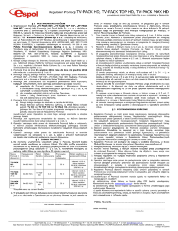 Regulamin Promocji TV-PACK HD, TV-PACK TOP HD, TV-PACK MAX HD prowadzonej przez Espol Kable Sp. z o.o. z siedzibą w Szczecinie § 1 POSTANOWIENIA OGÓLNE 1. Organizatorem Promocji „TV-PACK HD”, „TV-PACK TOP HD”, „TV-PACK MAX HD” zwanej dalej Promocją, jest Espol Kable Sp. z o. o. z siedzibą w Szczecinie przy ul. Sowińskiego 78, o kapitale zakładowym w wysokości 273 000.00 zł, wpisana do Krajowego Rejestru Sądowego prowadzonego przez Sąd Rejonowy Szczecin - Centrum w Szczecinie, XIII Wydział Gospodarczy pod nr 0000611763 i Korbank Media Cyfrowe Sp. z o.o. z siedzibą we Wrocławiu, przy ul. Nabycińskiej 19, 53-677 Wrocław, zarejestrowaną w Sądzie Rejonowym we Wrocławiu, VI Wydział Gospodarczy KRS: 0000263862, NIP: 8971721120 REGON: 020373926, z kapitałem zakładowym w wysokości 50 000 zł oraz Polska Telewizja Szerokopasmowa Spółką z o. o. z siedzibą we Wrocławiu przy ul. Nabycińskiej 19 zarejestrowaną w Sądzie Rejonowym we Wrocławiu, VI Wydział Gospodarczy Krajowego Rejestru Sądowego, KRS: 0000497167, NIP: 897-17-96-371, REGON: 022348499, z kapitałem zakładowym w wysokości 5000 zł, zwaną dalej PTSZ, łącznie zwani Operatorem. 2. Usługa stałego dostępu do Internetu świadczona jest przez Espol Kable sp. z o.o. natomiast Usługa Platformy Cyfrowej świadczona jest przez Espol Kable Sp. z o.o. wspólnie z Korbank Media Cyfrowe Sp. z o.o oraz Polska Telewizja Szerokopasmowa Spółka z o.o. 3. Promocja trwa od dnia 01 grudnia 2016 roku do dnia 31 grudnia 2016 roku włącznie z zastrzeżeniem § 1 ust. 8. 4. Promocja dotyczy jednego Pakietu Promocyjnego wybranego przez Abonenta: „TV-PACK HD”, „TV-PACK TOP HD”, „TV-PACK MAX HD”. Wybrana Promocja oznaczona jest w Umowie o Świadczenie Usług Telekomunikacyjnych. 5. Promocja jest przeznaczona dla wszystkich pełnoletnich osób fizycznych, będących konsumentami, które spełniają jednocześnie poniższe warunki: a) przystąpią do Promocji poprzez zawarcie z Operatorem Umowy o Świadczenie Usług Telekomunikacyjnych opisanych w § 1 ust. 6, na warunkach i w okresie trwania Promocji, b) nie posiadają zaległości płatniczych wobec Operatora, c) żadna z Usług świadczonych przez Operatora na rzecz Abonenta nie jest zablokowana z winy Abonenta. 6. Promocja dotyczy łącznie dwóch Usług: a) Usługi stałego dostępu do internetu w taryfie do 80 Mb/s, b) Usługi telewizji cyfrowej Platforma Cyfrowa, w skład której wchodzi pakiet: TV HD lub TV TOP HD lub TV MAX HD, dzierżawa sprzętu – jednego Set Top Box-a HD (wykaz programów dostępnych dla danego pakietu załączony jest do Regulaminu Promocji) świadczonych przez Operatora na rzecz tego samego Abonenta w obrębie jednego lokalu. 7. Promocja jest ograniczona terytorialnie do obszaru, na którym Operator świadczy jednocześnie dwie Usługi wskazane w § 1 ust. 6. 8. Operator zastrzega sobie prawo do stosowania Promocji tylko w miejscach, w których posiada infrastrukturę telekomunikacyjną spełniającą warunki techniczne umożliwiające równoczesne świadczenie wszystkich Usług objętych Promocją. 9. Operator zastrzega sobie prawo do zakończenia Promocji w terminie wcześniejszym niż oznaczony § 1 ust. 3, jeżeli z przyczyn technicznych nie będzie miał możliwości podłączenia nowych Abonentów. § 2 ZASADY PROMOCJI 1. Do momentu uruchomienia wszystkich Usług w Pakiecie, Abonent będzie ponosił opłatę cząstkową za wybrane Usługi. Wszystkie profity przynależne Abonentowi w tej Promocji przysługują proporcjonalnie od dnia uruchomienia poszczególnych Usług opisanych w § 1 ust. 6. Abonament miesięczny za wybrany pakiet Usług na czas określony 24 miesięcy wynosi: Nazwa Promocji i Abonament Przepustowość internetu Pakiet Opłata Kanałów aktywacyjna Promocyjna opłata instalacyjna Opłaty cząstkowe za poszczególne Usługi TV-PACK HD 49 zł Do 80 Mb/s TV HD 5 zł 50 zł Internet 14,10 zł, Pakiet kanałów 29,90 zł, dzierżawa STB HD 5 zł TV-PACK TOP HD 79 zł Do 80 Mb/s TV TOP HD 5 zł 50 zł Internet 14,10 zł, Pakiet kanałów 59,90 zł, dzierżawa STB HD 5 zł TV-PACK MAX HD 99 zł Do 80 Mb/s TV MAX HD 5 zł 50 zł Internet 14,10 zł, Pakiet kanałów 79,90 zł, dzierżawa STB HD 5 zł Wszystkie ceny są cenami brutto. 2. W przypadku gdy Umowa dotycząca danej Usługi telekomunikacyjnej zawierana jest przez Abonenta z Operatorem po raz pierwszy Umowa ta jest zawarta na ................................................................................................. 3. 4. 5. 6. 7. 8. okres 24 miesięcy licząc od dnia jej zawarcia. W przypadku gdy w ramach Promocji ulega przedłużeniu dotychczasowa Umowa z Abonentem, Umowa podpisana w ramach Promocji zostaje zawarta na okres kolejnych 24 pełnych miesięcy licząc od pierwszego dnia miesiąca następującego po miesiącu, w którym Abonent przystąpił do Promocji. Czas trwania Umowy o Świadczenie Usług opisanej w § 1 ust. 6, która została zawarta przez Abonenta z Operatorem przed przystąpieniem do niniejszej Promocji, zostaje zmieniony na okres 24 pełnych miesięcy licząc od pierwszego dnia miesiąca następującego po miesiącu przystąpienia do niniejszej Promocji według nowej zawartej z Operatorem Umowy. Abonent w okresie, o którym mowa w § 2 ust. 2, nie może dokonać zmiany Pakietu Usług objętych niniejszą Promocją na Pakiet o niższej opłacie abonamentowej oraz zawieszać świadczenia tych Usług. W przypadku jednostronnego rozwiązania Umowy zawartej na warunkach niniejszej Promocji przez Abonenta lub przez Operatora z winy Abonenta przed upływem okresu, o którym mowa w § 2 ust. 2, Abonent zobowiązany będzie do zapłaty na rzecz Operatora: a) zryczałtowanych kosztów uruchomienia Usług w ramach niniejszej Promocji w kwocie będącej różnicą pomiędzy wniesioną promocyjną opłatą za instalację Usług, a opłatą za instalację każdej z Usług określoną w Cennikach Usług – tj. 550,00 zł brutto, b) z