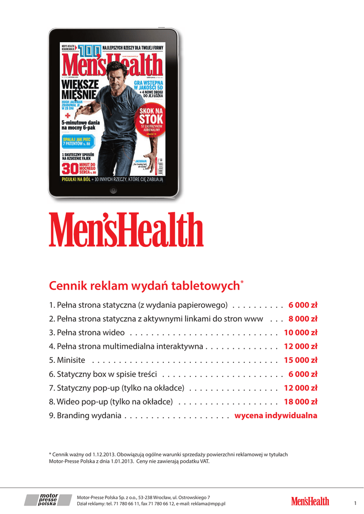 Cennik reklam wydań tabletowych* 1. Pełna strona statyczna (z wydania papierowego) . . . . . . . . . . . 6 000 zł 2. Pełna strona statyczna z aktywnymi linkami do stron www . . . . 8 000 zł 3. Pełna strona wideo . . . . . . . . . . . . . . . . . . . . . . . . . . . . . 10 000 zł 4. Pełna strona multimedialna interaktywna. . . . . . . . . . . . . . . 12 000 zł 5. Minisite . . . . . . . . . . . . . . . . . . . . . . . . . . . . . . . . . . . . 15 000 zł 6. Statyczny box w spisie treści . . . . . . . . . . . . . . . . . . . . . . . . 6 000 zł 7. Statyczny pop-up (tylko na okładce) . . . . . . . . . . . . . . . . . . 12 000 zł 8. Wideo pop-up (tylko na okładce) . . . . . . . . . . . . . . . . . . . . 18 000 zł 9. Branding wydania . . . . . . . . . . . . . . . . . . . . . wycena indywidualna * Cennik ważny od 1.12.2013. Obowiązują ogólne warunki sprzedaży powierzchni reklamowej w tytułach Motor-Presse Polska z dnia 1.01.2013. Ceny nie zawierają podatku VAT. Motor-Presse Polska Sp. z o.o., 53-238 Wrocław, ul. Ostrowskiego 7 Dział reklamy: tel. 71 780 66 11, fax 71 780 66 12, e-mail: [email protected] 1 Specyfikacja techniczna reklam do wydania tabletowego Tabletowe wydanie polskiej edycji magazynu Men’s Health dostępne jest na tablety iPad (system iOS). Magazyn ma orientację pionową i jest w pełni multimedialną i interaktywną aplikacją wykonaną w technologii Adobe Digital Publishing Suite. Dystrybucja wydania tabletowego odbywa się za pośrednictwem sklepu internetowego AppStore (iPad). Publikacja zawiera treści wydania papierowego wzbogacone o dodatkowe materiały, multimedia i elementy interaktywne. Ukazuje się co miesiąc równolegle z wydaniem papierowym. 1. Pełna strona statyczna (z wydania papierowego) – statyczna kreacja umieszczona na całej stronie wydania w ustalonym miejscu e-publikacji. Materiał powinien zostać przygotowany w jednym z formatów: PSD, TIFF, JPEG, PNG, PDF (72 ppi, RGB) o wymiarach 1536 x 2048 px. Czcionki w pliku PDF powinny być osadzone lub zamienione na krzywe. Dla tej wersji reklamy może być zastosowana reklama do wydania papierowego. Na etapie przygotowanie e-wydania, wzbogacona zostanie o aktywne buttony do wskazanej strony www, lub innego miejsca w aplikacji. Pola aktywne nie są szczególnie oznaczane. 2. Pełna strona statyczna z aktywnymi linkami do stron www – statyczna kreacja umieszczona na całej stronie wydania w ustalonym miejscu e-publikacji. Materiał powinien zostać przygotowany w jednym z formatów: PSD, TIFF, JPEG, PNG, PDF (72 ppi, RGB) o wymiarach 1536 x 2048 px. Czcionki w pliku PDF powinny być osadzone lub zamienione na krzywe. Dla tej wersji reklamy może być zastosowana reklama do wydania papierowego. Na etapie przygotowanie e-wydania, wzbogacona zostanie o aktywne buttony do wskazanej strony www, lub innego miejsca w aplikacji. Pola aktywne nie są szczególnie oznaczane. 3. Pełna strona wideo – reklama wideo umieszczona na całej stronie wydania w ustalonym miejscu e-publikacji. Materiał wideo odtwarza się automatycznie po wyświetleniu strony niezależnie od dostępu do internetu. Optymalny format pliku wideo: 1536 x 2048 px, kodowanie H.264, 25 fps; audio: Main Profile level 3.1 with AAC-LC, 128 kbps per channel, 44 kHz; rozszerzenie pliku: .m4v, .mp4 lub .mov. Jeden spot wideo przygotowany do e-publikacji nie powinien przekraczać 10 MB. Publikację tego formatu należy skonsultować z redakcją, gdyż w jednym e-wydaniu istnieje możliwość umieszczenia tylko czterech materiałów wideo. 4. Pełna strona multimedialna interaktywna – reklama umieszczona na jednej całej stronie wydania w ustalonym miejscu e-publikacji. Oprócz rozbudowanej interakcji można tu zamieścić dźwięk, wideo, galerie zdjęć, linki do internetu, bardziej zaawansowane to gry, ankiety, animacje etc. Technologia produkcji: a) Adobe Indesign, Adobe Digital Publishing Suite (projektowanie przycisków, nowych warstw, odtwarzania audio i wideo, galerii zdjęć, scrolli, odsyłaczy do www). b) HTML5 i JavaScript (zaawansowane interakcje np. ankiety, gry, animacje etc.). Materiał powinien mieć wymiary 1536 x 2048 px w rozdzielczości 72 ppi. Motor-Presse Polska Sp. z o.o., 53-238 Wrocław, ul. Ostrowskiego 7 Dział reklamy: tel. 71 780 66 11, fax 71 780 66 12, e-mail: [email protected] 2 5. Minisite – połączenie kilku stron wydania w interaktywny minisite, na którym oprócz rozbudowanej interakcji można zamieścić materiały wideo, audio, galerie zdjęć, quizy, ankiety czy proste gry poświęcone produktowi. Minisite może składać się z kilku multimedialnych i interaktywnych stron (o wymiarze 768x1024 px (1536x2048 dla ekranu Retina) lub jednej długiej strony (długość jest wielokrotnością strony jednego screenu, czyli 1024 px (2048 px dla ekranu Retina). Technologia produkcji: a) Adobe Indesign, Adobe Digital Publishing Suite (elementy interaktywne, odtwarzanie audio i wideo, galerie zdjęć, linki do www) b) HTML5 i JavaScript (zaawansowane interakcje np. ankiety, gry, animacje etc.) Materiał powinien mieć wymiary 1536 x 2048 px (1 strona) w rozdzielczości 72 ppi. Czcionki powinny być zamienione na krzywe lub dołączone w pakiecie razem z grafiką. 6. Statyczny box w spisie treści – Możliwe jest również umieszczenie linka do reklamy (pełna strona lub minisite) w layoucie spisu treści. Reklama taka może mieć formę normalnej pozycji w spisie treści lub być grafiką. Jest to reklama offline. Plik graficzny powinien mieć wymiary 260x325 px (format JPEG, 72 ppi, RGB). 7. Statyczny pop-up (tylko na okładce) – statyczna reklama wyświetlana na okładce magazynu w momencie otwierania wydania. Warstwa, na której jest wyświetlana reklama, zakrywa całą okładkę. W prawym górnym rogu powinien znaleźć się widoczny „close button”, który posłuży czytelnikowi do wyłączenia reklamy. Materiał powinien zostać przygotowany w formacie TIFF, JPEG, PNG, PDF (72 ppi, RG