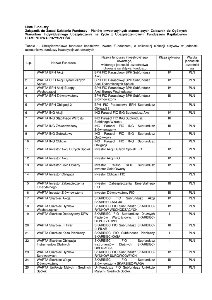 Lista Funduszy Załącznik do Zasad Działania Funduszy i Planów Inwestycyjnych stanowiących Załącznik do Ogólnych Warunków Indywidualnego Ubezpieczenia na Życie z Ubezpieczeniowym Funduszem Kapitałowym DIAMENTOWA PRZYSZŁOŚĆ Tabela 1. Ubezpieczeniowe fundusze kapitałowe, zwane Funduszami, o całkowitej alokacji aktywów w jednostki uczestnictwa funduszy inwestycyjnych otwartych L.p. Nazwa Funduszu 1 WARTA BPH Akcji 2 4 WARTA BPH Akcji Dynamicznych Spółek WARTA BPH Akcji Europy Wschodzącej WARTA BPH Zrównoważony 5 WARTA BPH Obligacji 2 6 WARTA ING Akcji 7 WARTA ING Stabilnego Wzrostu 8 WARTA ING Zrównoważony 9 WARTA ING Gotówkowy 10 WARTA ING Obligacji 11 3 Nazwa funduszu inwestycyjnego otwartego, w którego jednostki uczestnictwa lokowane są aktywa Funduszu BPH FIO Parasolowy BPH Subfundusz Akcji BPH FIO Parasolowy BPH Subfundusz Akcji Dynamicznych Spółek BPH FIO Parasolowy BPH Subfundusz Akcji Europy Wschodzącej BPH FIO Parasolowy BPH Subfundusz Zrównoważony BPH FIO Parasolowy BPH Subfundusz Obligacji 2 ING Parasol FIO ING Subfundusz Akcji WARTA Investor Akcji Dużych Spółek ING Parasol FIO ING Subfundusz Stabilnego Wzrostu ING Parasol FIO ING Subfundusz Zrównoważony ING Parasol FIO ING Subfundusz Gotówkowy ING Parasol FIO ING Subfundusz Obligacji Investor Akcji Dużych Spółek FIO 12 WARTA Investor Akcji Investor Akcji FIO 13 WARTA Investor Gold Otwarty Investor Parasol SFIO Investor Gold Otwarty 14 WARTA Investor Obligacji Investor Obligacji FIO 15 WARTA Investor Zabezpieczenia Emerytalnego Investor FIO 16 WARTA Investor Zrównoważony 17 WARTA Skarbiec Akcja 18 19 WARTA Skarbiec Rynków Wschodzących WARTA Skarbiec Depozytowy DPW 20 WARTA Skarbiec III Filar 21 WARTA Skarbiec Kasa Pieniężny 22 WARTA Skarbiec Obligacja Instrumentów Dłużnych 23 WARTA Skarbiec Rynków Surowcowych WARTA Skarbiec Waga Zrównoważony WARTA UniAkcje Małych i Średnich Spółek 24 25 Klasa aktywów IV Waluta jednostek uczestnict wa PLN IV PLN IV PLN III PLN II PLN IV PLN 1 III III PLN I PLN II PLN IV PLN IV PLN IV PLN II PLN III PLN Investor Zrównoważony FIO III PLN SKARBIEC FIO Subfundusz Akcji SKARBIEC-AKCJA SKARBIEC FIO Subfundusz SKARBIECRYNKÓW WSCHODZĄCYCH SKARBIEC FIO Subfundusz Dłużnych Papierów Wartościowych SKARBIECDEPOZYTOWY SKARBIEC FIO Subfundusz SKARBIECIII FILAR SKARBIEC FIO Subfundusz Pieniężny SKARBIEC-KASA SKARBIEC FIO Subfundusz Instrumentów Dłużnych SKARBIECOBLIGACJA SKARBIEC FIO Subfundusz SKARBIECRYNKÓW SUROWCOWYCH SKARBIEC FIO Subfundusz Zrównoważony SKARBIEC-WAGA UniFundusze FIO Subfundusz UniAkcje Małych i Średnich Spółek IV PLN IV PLN I PLN III PLN I PLN II PLN IV PLN III PLN IV PLN Zabezpieczenia Subfundusz Emerytalnego 26 WARTA UniAkcje Nowa Europa 27 WARTA UniAkcje Wzrostu 28 WARTA UniKorona Akcje 29 WARTA UniKorona Obligacje 30 WARTA UniKorona Pieniężny 31 WARTA UniKorona Zrównoważony 32 WARTA UniObligacje Aktywny 33 WARTA UniStabilny Wzrost 34 WARTA JPM Global Strategic Bond D WARTA JPM Emerging Markets Opportunities D UniFundusze FIO Subfundusz UniAkcje: Nowa Europa UniFundusze FIO Subfundusz UniAkcje Wzrostu UniFundusze FIO Subfundusz UniKorona Akcje UniFundusze FIO Subfundusz UniKorona Obligacje UniFundusze FIO Subfundusz UniKorona Pieniężny UniFundusze FIO Subfundusz UniKorona Zrównoważony UniFundusze SFIO Subfundusz UniObligacje Aktywny UniFundusze FIO Subfundusz UniStabilny Wzrost JPM Global Strategic Bond D (acc) - PLN (hedged) JPM Emerging Markets Opportunities D (acc) - PLN 36 WARTA JPM ASEAN Equity D 37 39 WARTA JPM Highbridge US STEEP D WARTA JPM Global High Yield Bond D KBC Akcji Małych i Średnich Spółek 40 KBC Akcyjny 41 KBC Papierów Dłużnych 42 KBC Stabilny 35 38 IV PLN IV PLN IV PLN II PLN I PLN III PLN II PLN III PLN II PLN IV PLN JPM ASEAN Equity D (acc) - PLN IV PLN JPM Highbridge US STEEP D (acc) - PLN (hedged) JPM Global High Yield Bond D (acc) PLN (hedged) KBC Parasol FIO KBC Subfundusz Akcji Małych i Średnich Spółek KBC Parasol FIO KBC Subfundusz Akcyjny KBC Parasol FIO KBC Subfundusz Papierów Dłużnych KBC Parasol FIO KBC Subfundusz Stabilny IV PLN II PLN IV PLN IV PLN II PLN III PLN Użyte powyżej w Tabeli skróty oznaczają: FIO – Fundusz Inwestycyjny Otwarty, SFIO – Specjalistyczny Fundusz Inwestycyjny Otwarty. Tabela 2. Ubezpieczeniowe fundusze kapitałowe o alokacji aktywów zgodnie z § 3 – 6 Zasad Działania Funduszy i Planów Inwestycyjnych stanowiących Załącznik do Ogólnych Warunków Indywidualnego Ubezpieczenia na Życie z Ubezpieczeniowym Funduszem Kapitałowym DIAMENTOWA PRZYSZŁOŚĆ 1 L.p. Nazwa Funduszu Klasa aktywów Waluta jednostek uczestnictwa 1 WARTA Aktywny III PLN 2 WARTA Bezpieczny II PLN 3 WARTA Stabilnego Wzrostu III PLN Tabela 3. Ubezpieczeniowe fundusze kapitałowe, zwane Planami o alokacji aktywów zgodnie z § 7 – 10 Zasad Działania Funduszy i Planów Inwestycyjnych stanowiących Załącznik do Ogólnych Warunków Indywidualnego Ubezpieczenia na Życie z Ubezpieczeniowym Funduszem Kapitałowym DIAMENTOWA PRZYSZŁOŚĆ 1 L.p. Nazwa Funduszu Klasa aktywów Waluta jednostek uczestnictwa 1 Plan Dłużny Aktywny II PLN 2 Plan Bezpieczny Aktywny III PLN 3 Plan Aktywnej Alokacji III PLN 4 Plan Akcyjny Aktywny IV PLN 1 Klasa aktywów Funduszy i Planów: I - gotówkowe i rynku pieniężnego II - dłużne III - mieszane, absolutnego zwrotu i nieruchomości IV - akcyjne i surowcowe Ubezpieczyciel może tworzyć nowe Fundusze, Plany i likwidować Fundusze, Plany zgodnie z § 2 ust. 3 - 6 Zasad Działania Funduszy i Planów Inwestycyjnych stanowiących Załącznik do Ogólnych Warunków Indywidualnego Ubezpieczenia na Życie z Ubezpieczeniowym Funduszem Kapitałowym DIAMENTOWA PRZYSZŁOŚĆ Lista Funduszy, Planów została zatwierdzona Uchwałą nr 27/2014 Zarządu TUnŻ „WARTA” S.A. i wprowadzona w życie z dniem 28 stycznia 2014r. wraz ze zmianami dokonanymi Zarządzeniem nr 38/PU/2014 Wiceprezesa Zarządu TUnŻ „WARTA” S.A. z dnia 25 sierp