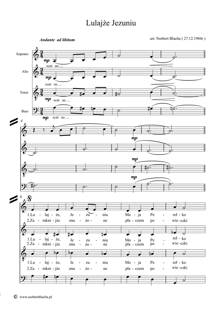 Lulajże Jezuniu arr. Norbert Blacha ( 27.12.1984r ) Andante ad libitum Soprano Alto scat: uu .... mp mp Tenor 4 Bass mp scat: uu .... scat: uu .... mp scat: uu .... 9 1.Lu - laj - że, 2.Za - mkni - jże niu ne 1.Lu - laj - że, 2.Za - mkni - jże www.norbertblacha.pl zu żo - 1.Lu - laj - że, 2.Za - mkni - jże Je znu - zu żo - Je znu - mp Je znu - mp Mo - ja pła - czem Mo - ja pła - czem zu żo - niu ne Mo - ja pła - czem mp niu ne Pe po - Pe po - Pe po - reł - ko wie - czki reł - ko wie - czki reł - ko wie - czki 2 13 Lu U - Lu U - Lu - U laj tu lu ze - bio - ne mdlo - ne laj tu u lże laj tu u lże - - Lu laj - alto tenor bass lu ze - lu ze - ści u że Je - glis - ści u me pie - ści łka - niem u scat : uu ... me pie łka - niem bio - ne mdlo - ne me pie łka - niem bio - ne mdlo - ne Refr. 17 soprano u lże - - - - de - łko ste - czki de - łko ste - czki de - łko ste - czki zu s. - niu 19 Lu Lu Lu - laj - - www.norbertblacha.pl laj laj - - - że lu że lu że lu - - - laj A ty go Ma - tu laj A ty go laj A ty go Ma - tu Ma - tu - - lu lu - lu 3 23 1. w w w pła - czu utu pła - czu pła - czu utu utu Coda 27 - laj. - laj. w pła - czu utu - w pła - czu utu - czu utu - w pła - laj. laj. mf scat : mm ... mf scat : mm ... scat : mm ... scat : mm ... aa..... aa..... uu... uu... mf uu... mf mf mf laj. aa..... mf - laj. 30 2. dal a tempo ... mf rall .....