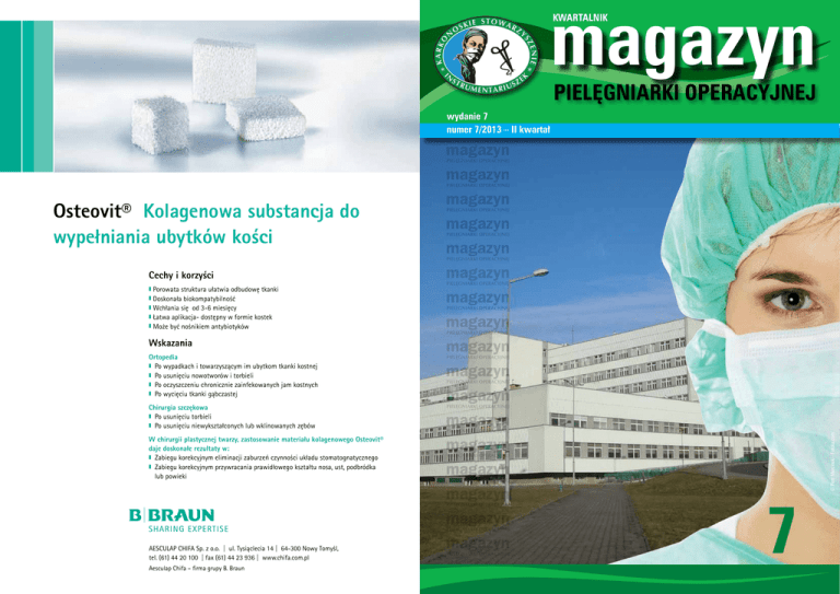 magazyn KWARTALNIK PIELĘGNIARKI OPERACYJNEJ wydanie 7 numer 7/2013 – II kwartał Osteovit® Kolagenowa substancja do wypełniania ubytków kości Cechy i korzyści Porowata struktura ułatwia odbudowę tkanki Doskonała biokompatybilność z Wchłania się od 3-6 miesięcy z Łatwa aplikacja- dostępny w formie kostek z Może być nośnikiem antybiotyków z z Wskazania Ortopedia z Po wypadkach i towarzyszącym im ubytkom tkanki kostnej z Po usunięciu nowotworów i torbieli z Po oczyszczeniu chronicznie zainfekowanych jam kostnych z Po wycięciu tkanki gąbczastej Chirurgia szczękowa Po usunięciu torbieli z Po usunięciu niewykształconych lub wklinowanych zębów W chirurgii plastycznej twarzy, zastosowanie materiału kolagenowego Osteovit® daje doskonałe rezultaty w: z Zabiegu korekcyjnym eliminacji zaburzeń czynności układu stomatognatycznego z Zabiegu korekcyjnym przywracania prawidłowego kształtu nosa, ust, podbródka lub powieki AESCULAP CHIFA Sp. z o.o. | ul. Tysiąclecia 14 | 64-300 Nowy Tomyśl, tel. (61) 44 20 100 | fax (61) 44 23 936 | www.chifa.com.pl Aesculap Chifa – firma grupy B. Braun 7 © Piotr Marcinski - Fotolia.com z magazyn KWARTALNIK PIELĘGNIARKI OPERACYJNEJ wydanie 7 numer 7/2013 – II kwartał SPIS TREŚCI 1. Zawód/specjalność – pielęgniarka/pielęgniarz operacyjny – mgr Ewa Grabowska 2. Ból w życiu pacjenta – dr n. med. Izabela Wróblewska 7. Procedura przygotowania pola operacyjnego Ewa Grabowska – mgr Mirosława Malara 9. Chirurgiczne leczenie zatoki włosowej – lek. med. Oskar Pelzer 12. C oś drgnęło w pielęgniarstwie operacyjnym w Polsce – mgr Barbara Dąbrowska 15. Debata o rozwoju zawodowym pielęgniarstwa operacyjnego – mgr Barbara Dąbrowska Szanowni Państwo W siódmym wydaniu naszego Magazynu Pielęgniarki Operacyjnej prezentujemy kolejne artykuły z wybranych dla Państwa dziedzin medycyny zabiegowej, pielęgniarstwa operacyjnego i etyki. 17. Kontrola biologiczna procesu sterylizacji – gwarancja bezpieczeństwa pacjentów – Aleksandra Jaguś 19. II Ogólnopolska konferencja 3M. Bezpieczny szpital. Bezpieczny pacjent – Łukasz Witczak Szczególne miejsce zajmuje w nim pielęgniarka/pielęgniarz operacyjny, których cechy chciałabym podkreślić w sposób szczególny. W tym artykule skupiłam swoją wiedzę i doświadczenie zawodowe, jednocześnie kierując słowa w stronę zarówno adeptów do tego zawodu jak też osób pracujących, chcąc uzmysłowić lub przypomnieć, jak ważną rolę spełnia m.in. osobowość, która w znacznej mierze wpływa na sprawność sensoryczną, zdolności i umiejętności, tak bardzo nam dziś potrzebne do wykonywania tego zawodu. W następnym numerze wiele ciekawych wiadomości. Zachęcam Państwa do pisania swoich artykułów do naszego Magazynu Pielęgniarki Operacyjnej. Życzę Państwu wielu sukcesów zawodowych. Redaktor naczelna: mgr Ewa Grabowska Wydawca: Karkonoskie Stowarzyszenie Instrumentariuszek, www.ksi.jgora.pl Współpraca: dr n. med. Izabela Wróblewska dr n. med. Ryszard Kędra lek. med. Oskar Pelzer mgr Magdalena Kulczycka Pielęgniarki operacyjne WCSKJ – założycielki KSI Z wyrazami szacunku mgr Ewa Grabowska Informacji udziela: 3M Poland Sp. z o.o., Al. Katowicka 117, Kajetany, 05-830 Nadarzyn, Tel. 22 739 60 00, Fax 22 739 60 01, www.3m.pl/produktymedyczne 3M Ioban są znakami towarowymi firmy 3M. © 3M 2013 r. Wszystkie prawa zastrzeżone. 3M/2013/05/Ioban reklama Zawód/specjalność – pielęgniarka/pielęgniarz operacyjny mgr Ewa Grabowska Pielęgniarka oddziałowa bloku operacyjnego – Wojewódzkie Centrum Szpitalne Kotliny Jeleniogórskiej Pielęgniarka/pielęgniarz operacyjny dzisiaj, to bardzo często Tymi istotnymi cechami, jakimi powinni charakteryzować się pielęgniarka/pielęgniarz operacyjny są: • łagodna osobowość, uprzejmość i spokój, • prawdziwa motywacja, aby zostać pielęgniarką/pielęgniarzem, • poczucie odpowiedzialności, • umiejętność współpracy ze wszystkimi członkami zespołu, • umiejętność obserwacji i łatwego wyjaśnienia wątpliwości, • łatwość wypełniania zleceń, • umiejętność akceptowania zmian, • zdrowy, miły wygląd, • pogodne podejście do życia. osoba z wykształceniem wyższym zawodowym, kursem kwalifikacyjnym lub specjalizacją w dziedzinie pielęgniarstwa operacyjnego, regularnie uczestnicząca w szkoleniach kierunkowych lub pokrewnych, badaniach naukowych oraz regularnie czytająca fachową literaturę, w tym publikacje naukowe i szkoląca pielęgniarki rozpoczynające „karierę” operacyjną. Pielęgniarka/pielęgniarz operacyjny, to osoba o ogromnej sile fizycznej, psychicznej, bardzo komunikatywna, nawet bez używania słów, przewidująca i odpowiedzialna za siebie, koleżanki, lekarzy, ekipę sprzątającą, ale głównie za pacjenta. To również osoba szybko przyswajająca wiedzę, która cały czas się zmienia. W medycynie nie można pozwolić sobie na zaległości i pozostawanie w tyle. Czas potrzebny na wykształcenie pielęgniarki/pielęgniarza– specjalisty jest porównywalny z kształceniem na kierunkach Pielęgniarka/pielęgniarz operacyjny powinien wiedzieć, że lekarskich. Lekarz chirurg nie przeprowadzi operacji bez pie- pielęgniarstwo operacyjne nie jest rzemiosłem, lecz nauką lęgniarki operacyjnej. To ona daje mu poczucie bezpieczeń- i sztuką. Z wielu zadań jakie wykonuje w bloku operacyjnym, stwa, pomaga w czasie zabiegu, aby przebiegał sprawnie szczególnie powinny skupić naszą uwagę działania mające i z jak najmniejszym obciążeniem dla pacjenta, a co za tym na celu: idzie niepotrzebnych komplikacji. • uspokojenie chorego, • integracja opieki nad chorym w czasie jego pobytu w bloku Pielęgniarka/pielęgniarz operacyjny są osobami, z którymi pacjent rozmawia tuż przed zabiegiem, co pozwala niejednokrotnie dokonać ostatecznej weryfikacji danych osobowych, operacyjnym, • nabycie odpowiedniej sprawności technicznej