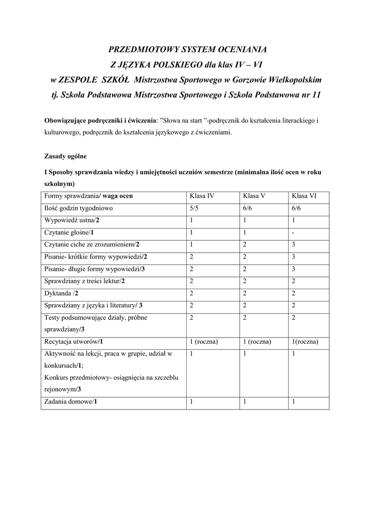 PRZEDMIOTOWY SYSTEM OCENIANIA Z JĘZYKA POLSKIEGO dla klas IV – VI w ZESPOLE SZKÓŁ Mistrzostwa Sportowego w Gorzowie Wielkopolskim tj. Szkoła Podstawowa Mistrzostwa Sportowego i Szkoła Podstawowa nr 11 Obowiązujące podręczniki i ćwiczenia: ”Słowa na start ”-podręcznik do kształcenia literackiego i kulturowego, podręcznik do kształcenia językowego z ćwiczeniami. Zasady ogólne I Sposoby sprawdzania wiedzy i umiejętności uczniów semestrze (minimalna ilość ocen w roku szkolnym) Formy sprawdzania/ waga ocen Klasa IV Klasa V Klasa VI Ilość godzin tygodniowo 5/5 6/6 6/6 Wypowiedź ustna/2 1 1 1 Czytanie głośne/1 1 1 - Czytanie ciche ze zrozumieniem/2 1 2 3 Pisanie- krótkie formy wypowiedzi/2 2 2 3 Pisanie- długie formy wypowiedzi/3 2 2 3 Sprawdziany z treści lektur/2 2 2 2 Dyktanda /2 2 2 2 Sprawdziany z języka i literatury/ 3 2 2 2 Testy podsumowujące działy, próbne 2 2 2 Recytacja utworów/1 1 (roczna) 1 (roczna) 1(roczna) Aktywność na lekcji, praca w grupie, udział w 1 1 1 1 1 1 sprawdziany/3 konkursach/1; Konkurs przedmiotowy- osiągnięcia na szczeblu rejonowym/3 Zadania domowe/1 Testy, sprawdziany, prace klasowe oceniane są według SSO: 1) 100%- 96% punktów możliwych do uzyskania - celujący 2) 95% - 87% - bardzo dobry 3) 86% - 75% - dobry 4) 74% - 56% - dostateczny 5) 55% - 40% - dopuszczający 6) 39% - 0% - niedostateczny Uczniowie otrzymują także „plusy” i „minusy”. „Minus” uczeń może otrzymać za: - brak zadania domowego, brak podręczników, zeszytu, nieprzyniesienie potrzebnych materiałów, niewywiązywanie się z zadań wykonywanych w grupie, brak, niekompletność (tematów, notatek, zadań domowych) w zeszycie przedmiotowym. Trzy „minusy” równe są ocenie niedostatecznej. „Minusy” nauczyciel odnotowuje w dzienniku. „Plus” uczeń może otrzymać za: - nieskomplikowane, krótkie zadania domowe, - przyniesienie dodatkowych materiałów wykorzystanych podczas lekcji, - dobre wywiązanie się z zadań realizowanych w grupie. Pięć „plusów” równa się ocenie bardzo dobrej. „Plusy” nauczyciel odnotowuje w dzienniku. II Uczniowie z dostosowaniem wymagań edukacyjnych i stwierdzoną dysleksją rozwojową Nauczyciel jest zobowiązany dostosować wymagania edukacyjne do indywidualnych potrzeb ucznia, u którego stwierdzono zaburzenia i specyficzne trudności w uczeniu się, zgodnie z zaleceniami Poradni Psychologiczno- Pedagogicznej. W stosunku do uczniów z dostosowaniem wymagań edukacyjnych (stwierdzone i zapisane w opinii wydanej przez poradnię psychologiczno-pedagogiczną) ogólnie stosowane są następujące ułatwienia: - większa tolerancja błędów ortograficznych i interpunkcyjnych przy ocenianiu ćwiczeń redakcyjnych, - możliwość poprawy dyktanda na ocenę dopuszczającą (bezbłędne przepisanie tekstu dyktanda z uwzględnieniem poprawek naniesionych przez nauczyciela). Ponadto nauczyciel uwzględnia przy ocenianiu uczniów indywidualne wytyczne zapisane w poszczególnych opiniach (np. wolne tempo pracy – więcej czasu na sprawdzianach). Umowa: nauczyciel – uczeń I Zasady i kryteria oceniania osiągnięć edukacyjnych 1.Uczeń ma obowiązek prowadzić zeszyt przedmiotowy, posiadać podręcznik i ćwiczenia, przynosić je na każdą lekcję. 2. Uczeń może być nieprzygotowany do lekcji dwa razy w semestrze, przy czym nieprzygotowanie zgłasza przed lekcją. W przypadku niezgłoszenia lub kolejnego nieprzygotowania, otrzymuje ocenę niedostateczną. Nie może zgłaszać nieprzygotowania, jeśli dotyczy to lekcji powtórzeniowych sprawdzianów, prac klasowych, które zostały wcześniej zapowiedziane. Wyjątek stanowią uczniowie, którzy w tych dniach maja obecność usprawiedliwioną. 3.Sprawdziany są obowiązkowe i poprzedzone tygodniową zapowiedzią. Jeżeli z przyczyn losowych uczeń nie może ich napisać z całą klasą, powinien to uczynić w terminie / do 30 dni od daty ocenienia i tylko jednorazowo. 4. Jeżeli uczeń ze sprawdzianu otrzymał ocenę niedostateczną, ma możliwość dokonania jednorazowej poprawy. Obie oceny są wpisane do dziennika z tą samą wagą i brane pod uwagę przy wystawianiu oceny śródrocznej i rocznej. 5.Uczeń, który opuścił lekcję bez usprawiedliwienia, podczas której odbył się sprawdzian, praca klasowa lub test, otrzymuje ocenę niedostateczną. 6. Uczeń, ma obowiązek zaliczyć wszystkie sprawdziany zaplanowane w danym semestrze. Nie przewiduje się dodatkowego zaliczania materiału, wyjątek stanowią przyczyny losowe. 7.Jeśli uczeń nie odda w terminie wypracowania, otrzymuje ocenę niedostateczną wpisaną do dziennika ołówkiem. Zobowiązany jest nadrobić zaległości i oddać pracę pisemną na następnej lekcji. Uczeń jest zobowiązany do rzetelnej poprawy wszelkich prac pisemnych, zgodnie ze wskazówkami nauczyciela. 8. Omówione i poprawione prace pisane przez uczniów pozostają w pracowni polonistycznej. 9. Kartkówki, obejmujące trzy ostatnie tematy, nie będą zapowiadane. 10.Obowiązkiem ucznia, który nie uczęszczał na lekcje jest uzupełnienie notatek i zadań Wszelkie braki i zaległości w ocenach na koniec semestru(roku) są traktowane przez nauczyciela jako oceny niedostateczne. 11.Każdy uczeń ma prawo do zdobycia dodatkowych ocen za prace nadobowiązkowe zlecone przez nauczyciela, bądź podjęte z własnej inicjatywy. 12. Uczeń, który ma szansę uzyskać na semestr czy koniec roku oceny celującej, powinien potwierdzić swój wysoki poziom wiedzy i umiejętności poprzez udział i osiąganie zadawalających wyników w konkursach(turniejach, przeglądach itp.) różnego szczebla. 13.Ocena semestralna i roczna nie jest średnią arytmetyczną ocen cząstkowych. Na ocenę końcową większy wpływ mają oceny cząstkowe z prac klasowych, testów i sprawdzianów obejmujących większą partię materiału, oceny z dyktand, odpowiedzi, kartkówek, wypracowań redagowanych na lekcji, czytania cichego ze zrozu