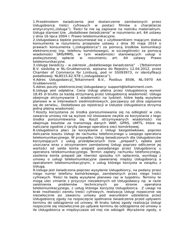 1.Przedmiotem świadczenia jest dostarczenie zamówionych przez Usługobiorcę treści cyfrowych w postaci filmów o charakterze erotycznym(„Usługa”). Treści te nie są zapisane na nośniku materialnym. Usługa stanowi tzw. „dodatkowe świadczenie” w rozumieniu art. 64 ustawy z dnia 16 lipca 2004 r. Prawo telekomunikacyjne. 2.Usługodawca będzie porozumiewał się z użytkownikiem mającym status konsumenta w rozumieniu przepisów ustawy z dnia 30 maja 2014 o prawach konsumenta („Usługobiorca”) za pomocą środków komunikacji elektronicznej (np. telefonu komórkowego), w szczególności za pomocą wiadomości SMS/MMS, w tym wiadomości stanowiących usługi o podwyższonej opłacie w rozumieniu art. 64 ustawy Prawo telekomunikacyjne. 3.Usługę świadczy – w zakresie „dodatkowego świadczenia” - [Teltainment B.V. siedzibą w NL-Grubbenvorst, wpisana do Rejestru 12.04.2012, przez Chamber of Commerce for Limburg, pod nr 55093973, nr identyfikacji podatkowej: NL8515.62.978 („Usługodawca”), 4.Adres Usługodawcy[_Teltainment B.V., Postbus 8506, NL-5970 AA Grubbenvorst. 5.Adres poczty elektronicznej Usługodawcy: [email protected]. 6.Usługa jest odpłatna. Cena Usługi płatna przez Usługobiorcę wynosi 18,45 zł brutto za każdą otrzymaną przez Usługobiorcę wiadomość. Usługa obejmuje otrzymywanie 1 wiadomości na tydzień, które będą wysyłane planowo w w interwałach siedmiodniowych, począwszy od dnia zapisania się do serwisu.. Dodatkowo po rejestracji w Usłudze Usługobiorca otrzyma jedną płatną wiadomość. 7.Koszty korzystania ze środka porozumiewania się na odległość w celu zawarcia umowy nie są wyższe niż stosowane zwykle za korzystanie z tego środka porozumiewania się. Koszt otrzymywanych wiadomości nie obejmuje kosztów za transmisję danych WAP, GPRS, UMTS, które są naliczane zgodnie z taryfą danego operatora sieci komórkowej. 8.Usługobiorca płaci za korzystanie z Usługi bezgotówkowo, poprzez doliczanie kosztu Usługi do rachunku telefonicznego u swojego operatora telekomunikacyjnego. W przypadku Usług świadczonych dla Usługobiorców korzystających z usług przedpłaconych (tzw. „prepaid”), opłata jest uiszczana wraz z otrzymaniem zamówionej Usługi poprzez odliczenie jej wartości od salda konta prepaid posiadanego przez Usługobiorcę u operatora telekomunikacyjnego. Termin zapłaty rachunku telefonicznego, zasilenia konta prepaid jak również sposoby ich opłacenia, wynikają z umowy o usługi telekomunikacyjne zawieranej między Usługobiorcą a operatorem telekomunikacyjnym, z usług którego korzysta w związku z Usługą. 9.Usługa jest świadczona poprzez wysyłanie Usługobiorcy, na podany przez niego numer telefonu komórkowego, zamówionych przez niego treści cyfrowych. Treści te będą wysyłane planowo raz w tygodniu. Terminy te mogą ulec zmianie z przyczyn niezależnych od Usługodawcy np. w razie zaistnienia problemów technicznych po stronie operatora telekomunikacyjnego, z usług którego korzysta Usługobiorca. Z uwagi na brak możliwości zwrotu treści cyfrowych, realizacja Usługi rozpocznie się niezwłocznie po zawarciu umowy pod warunkiem udzielenia przez Usługobiorcę zgody na rozpoczęcie spełniania świadczenia przed upływem terminu do odstąpienia od umowy. W braku takiej zgody realizacja Usługi rozpocznie się niezwłocznie po upływie terminu do odstąpienia od umowy o ile Usługobiorca w międzyczasie od niej nie odstąpił. Wyrażenie zgody, o której mowa powyżej oznacza utratę prawa do odstąpienia od umowy przez Usługobiorcę. 10.Reklamacje można kierować drogą: wiadomości poczty elektronicznej na adres [email protected], pocztową na adres [Teltainment B.V., Postbus 8506, NL-5970 AA Grubbenvorst (list z dopiskiem „Reklamacja”) lub telefonicznie na nr telefonu 0223974315. Reklamacje są rozpatrywane (a w przypadku zgłaszania ich telefonicznie również przyjmowane) w dni robocze, od poniedziałku do piątku w godz. 10.00-15.00. Termin rozpatrzenia reklamacji wynosi 4 dni roboczych od dnia jej wpływu do Usługodawcy. Termin ten może ulec zmianie jeżeli do rozpatrzenia reklamacji konieczne okaże się uzyskanie informacji od operatorów telekomunikacyjnych lub podmiotów współpracujących z Usługodawcą przy świadczeniu Usługi albo też dodatkowych informacji od Usługobiorcy. Usługodawca może domagać się od wnoszącego reklamację podania dodatkowych informacji o ile są one niezbędne do rozpatrzenia tej reklamacji. W takim przypadku czasu oczekiwania na podanie takich dodatkowych informacji nie uwzględnia się w czasie rozpatrywania reklamacji. O wyniku rozpatrzenia reklamacji Usługobiorca zostanie poinformowany pisemnie, drogą wiadomości poczty elektronicznej lub telefonicznie. Negatywne rozpatrzenie reklamacji wymaga uzasadnienia. 11.Usługobiorcy przysługuje prawo odstąpienia od umowy bez podawania jakiejkolwiek przyczyny w terminie 14 dni od dnia jej zawarcia. Odstąpienie od umowy polega na złożeniu przez Usługobiorcę na adres: [Teltainment B.V., Postbus 8506, NL-5970 AA Grubbenvorst jednoznacznego oświadczenia o odstąpieniu od umowy. Można przy tym skorzystać z wzoru takiego oświadczenia stanowiącego załącznik nr 2 do ustawy z dnia 30 maja 2014 r. o prawach konsumenta. Skorzystanie z tego wzoru nie jest jednak obowiązkowe. Aby zachować termin do odstąpienia od umowy wystarczy wysłać oświadczenie o takim odstąpieniu przed upływem terminu do tego odstąpienia. W przypadku odstąpienia od niniejszej umowy Usługodawca zwraca Usługobiorcy wszystkie otrzymane od Usługobiorcy płatności, niezwłocznie, a w każdym przypadku nie później niż 14 dni od dnia, w którym Usługodawca został poinformowany o wykonaniu prawa odstąpienia od umowy przez Usługobiorcę. Zwrot płatności zostanie dokonany przy użyciu takich samych sposobów płatności, jakie zostały przez Usługobiorcę użyte w pierwotnej transakcji, 
