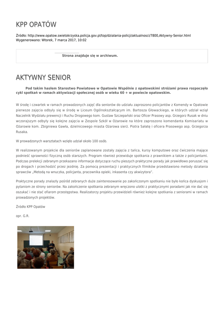 KPP OPATÓW Źródło: http://www.opatow.swietokrzyska.policja.gov.pl/top/dzialania-policji/aktualnosci/7800,Aktywny-Senior.html Wygenerowano: Wtorek, 7 marca 2017, 10:02 Strona znajduje się w archiwum. AKTYWNY SENIOR Pod takim hasłem Starostwo Powiatowe w Opatowie Wspólnie z opatowskimi stróżami prawa rozpoczęło cykl spotkań w ramach aktywizacji społecznej osób w wieku 60 + w powiecie opatowskim. W środę i czwartek w ramach prowadzonych zajęć dla seniorów do udziału zaproszono policjantów z Komendy w Opatowie pierwsze zajęcia odbyły się w środę w Liceum Ogólnokształcącym im. Bartosza Głowackiego, w których udział wziął Naczelnik Wydziału prewencji i Ruchu Drogowego kom. Gustaw Szczepański oraz Oficer Prasowy asp. Grzegorz Rusak w dniu wczorajszym odbyły się kolejne zajęcia w Zespole Szkół w Ożarowie na które zaproszono komendanta Komisariatu w Ożarowie kom. Zbigniewa Gawła, dzielnicowego miasta Ożarowa sierż. Piotra Sałatę i oficera Prasowego asp. Grzegorza Rusaka. W prowadzonych warsztatach wzięło udział około 100 osób. W realizowanym projekcie dla seniorów zaplanowane zostały zajęcia z tańca, kursy komputowe oraz ćwiczenia mające podnieść sprawności fizyczną osób starszych. Program również przewiduje spotkania z prawnikiem a także z policjantami. Podczas prelekcji zebranym przekazano informacje dotyczące ruchu pieszych praktyczne porady jak prawidłowo poruszać się po drogach i przechodzić przez jezdnię. Za pomocą prezentacji i praktycznych filmików przedstawiono metody działania sprawców „Metodą na wnuczka, policjanta, pracownika opieki, inkasenta czy akwizytora”. Praktyczne porady znalazły pośród zebranych duże zainteresowanie po zakończonym spotkaniu nie było końca dyskusjom i pytaniom ze strony seniorów. Na zakończenie spotkania zebranym wręczono ulotki z praktycznymi poradami jak nie dać się oszukać i nie stać ofiarom przestępstwa. Realizatorzy projektu przewidzieli również kolejne spotkania z seniorami w ramach prowadzonych projektów. Źródło KPP Opatów opr. G.R. Ocena: 0/5 (0) Tweetnij