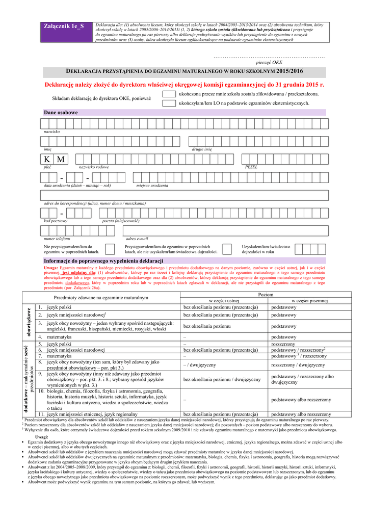 Deklaracja dla: (1) absolwenta liceum, który ukończył szkołę w latach 2004/2005–2013/2014 oraz (2) absolwenta technikum, który ukończył szkołę w latach 2005/2006–2014/2015i (1, 2) którego szkoła została zlikwidowana lub przekształcona i przystępuje do egzaminu maturalnego po raz pierwszy albo deklaruje podwyższanie wyników lub przystąpienie do egzaminu z nowych przedmiotów oraz (3) osoby, która ukończyła liceum ogólnokształcące na podstawie egzaminów eksternistycznych Załącznik 1e_S …………………………………………………… pieczęć OKE DEKLARACJA PRZYSTĄPIENIA DO EGZAMINU MATURALNEGO W ROKU SZKOLNYM 2015/2016 Deklarację należy złożyć do dyrektora właściwej okręgowej komisji egzaminacyjnej do 31 grudnia 2015 r. Składam deklarację do dyrektora OKE, ponieważ ukończona przeze mnie szkoła została zlikwidowana / przekształcona. ukończyłam/łem LO na podstawie egzaminów eksternistycznych. Dane osobowe nazwisko imię drugie imię K M płeć nazwisko rodowe - PESEL - data urodzenia (dzień – miesiąc – rok) miejsce urodzenia adres do korespondencji (ulica, numer domu / mieszkania) kod pocztowy poczta (miejscowość) numer telefonu Nie przystępowałem/łam do egzaminu w poprzednich latach. adres e-mail Przystępowałem/łam do egzaminu w poprzednich latach, ale nie uzyskałem/łam świadectwa dojrzałości. Uzyskałem/łam świadectwo dojrzałości w roku Informacje do poprawnego wypełnienia deklaracji Uwaga: Egzamin maturalny z każdego przedmiotu obowiązkowego i przedmiotu dodatkowego na danym poziomie, zarówno w części ustnej, jak i w części pisemnej, jest odpłatny dla: (1) absolwentów, którzy po raz trzeci i kolejny deklarują przystąpienie do egzaminu maturalnego z tego samego przedmiotu obowiązkowego lub z tego samego przedmiotu dodatkowego oraz dla (2) absolwentów, którzy deklarują przystąpienie do egzaminu maturalnego z tego samego przedmiotu dodatkowego, który w poprzednim roku lub w poprzednich latach zgłaszali w deklaracji, ale nie przystąpili do egzaminu maturalnego z tego przedmiotu (por. Załącznik 26a). dodatkowe – maksymalnie sześć przedmiotów obowiązkowe Przedmioty zdawane na egzaminie maturalnym Poziom 1. język polski w części ustnej bez określania poziomu (prezentacja) 2. język mniejszości narodowej1 bez określania poziomu (prezentacja) podstawowy 3. język obcy nowożytny – jeden wybrany spośród następujących: angielski, francuski, hiszpański, niemiecki, rosyjski, włoski bez określania poziomu podstawowy – – bez określania poziomu (prezentacja) – podstawowy rozszerzony podstawowy / rozszerzony2 podstawowy 3 / rozszerzony – / dwujęzyczny rozszerzony / dwujęzyczny bez określania poziomu / dwujęzyczny podstawowy / rozszerzony albo dwujęzyczny – podstawowy albo rozszerzony bez określania poziomu (prezentacja) podstawowy albo rozszerzony 4. 5. 6. 7. 8. matematyka język polski język mniejszości narodowej matematyka język obcy nowożytny (ten sam, który był zdawany jako przedmiot obowiązkowy – por. pkt 3.) 9. język obcy nowożytny (inny niż zdawany jako przedmiot obowiązkowy – por. pkt. 3. i 8.; wybrany spośród języków wymienionych w pkt. 3.) 10. biologia, chemia, filozofia, fizyka i astronomia, geografia, historia, historia muzyki, historia sztuki, informatyka, język łaciński i kultura antyczna, wiedza o społeczeństwie, wiedza o tańcu 11. język mniejszości etnicznej, język regionalny w części pisemnej podstawowy 1 Przedmiot obowiązkowy dla absolwentów szkół lub oddziałów z nauczaniem języka danej mniejszości narodowej, którzy przystępują do egzaminu maturalnego po raz pierwszy. 2 Poziom rozszerzony dla absolwentów szkół lub oddziałów z nauczaniem języka danej mniejszości narodowej; dla pozostałych – poziom podstawowy albo rozszerzony do wyboru. 3 Wyłącznie dla osób, które otrzymały świadectwo dojrzałości przed rokiem szkolnym 2009/2010 i nie zdawały egzaminu maturalnego z matematyki jako przedmiotu obowiązkowego. Uwagi: Egzamin dodatkowy z języka obcego nowożytnego innego niż obowiązkowy oraz z języka mniejszości narodowej, etnicznej, języka regionalnego, można zdawać w części ustnej albo w części pisemnej, albo w obu tych częściach. Absolwenci szkół lub oddziałów z językiem nauczania mniejszości narodowej mogą zdawać przedmioty maturalne w języku danej mniejszości narodowej. Absolwenci szkół lub oddziałów dwujęzycznych na egzaminie maturalnym z przedmiotów: matematyka, biologia, chemia, fizyka i astronomia, geografia, historia mogą rozwiązywać dodatkowe zadania egzaminacyjne przygotowane w języku obcym będącym drugim językiem nauczania. Absolwent z lat 2004/2005–2008/2009, który przystąpił do egzaminu z: biologii, chemii, filozofii, fizyki i astronomii, geografii, historii, historii muzyki, historii sztuki, informatyki, języka łacińskiego i kultury antycznej, wiedzy o społeczeństwie, wiedzy o tańcu jako przedmiotu obowiązkowego na poziomie podstawowym lub rozszerzonym, lub do egzaminu z języka obcego nowożytnego jako przedmiotu obowiązkowego na poziomie rozszerzonym, może podwyższyć wynik z tego przedmiotu, deklarując go jako przedmiot dodatkowy. Absolwent może podwyższyć wynik egzaminu na tym samym poziomie, na którym go zdawał, lub wyższym. Załącznik 1e_S Deklaracja dla: (1) absolwenta liceum, który ukończył szkołę w latach 2004/2005–2013/2014 oraz (2) absolwenta technikum, który ukończył szkołę w latach 2005/2006–2014/2015i (1, 2) którego szkoła została zlikwidowana lub przekształcona i przystępuje do egzaminu maturalnego po raz pierwszy albo deklaruje podwyższanie wyników lub przystąpienie do egzaminu z nowych przedmiotów oraz (3) osoby, która ukończyła liceum ogólnokształcące na podstawie egzaminów eksternistycznych 1. Deklaruję przystąpienie do egzaminów obowiązkowych z następujących p