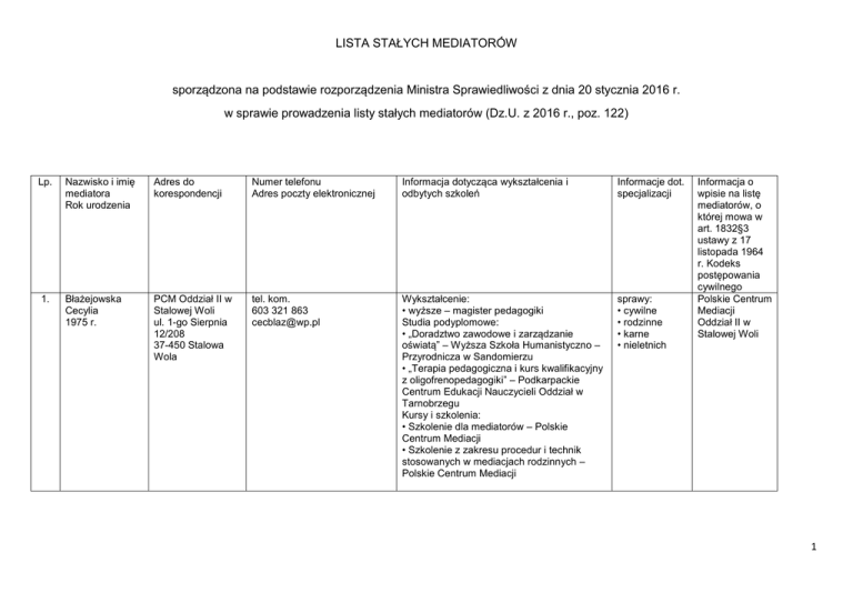 LISTA STAŁYCH MEDIATORÓW sporządzona na podstawie