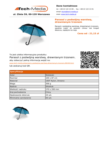 Dane kontaktowe tel. +48 22 122 13 00 , fax. +48 22 122 13 01 email: [email protected] ul. Złota 59, 00-120 Warszawa www: www.tech-media.pl Parasol z podwójną warstwą, drewnianym trzonem Parasol z podwójną warstwą, drewnianym trzonem, spodnia część ze wzorem chmur lub kropel deszczu, zapięcie na rzep Cena od : 21,15 zł To jest ulotka informacyjna produktu: Parasol z podwójną warstwą, drewnianym trzonem , aby zobaczyć pełną informację wejdź na: www.tech-media.pl/parasol,z,podwojna,warstwa,drewnianym,trzonem,09249.html lub zeskanuj kod QR. Specyfikacja Kolor Niebieski Rozmiar 100 x 87 cm Materiał 190T Nylon, Drewno Waga 356 g Nadruk Sitodruk Wielkość nadruku 170 x 200 mm Kraj pochodzenia Chiny Opakowanie zbiorcze 24 szt. Minimalne zamówienie 50 szt.