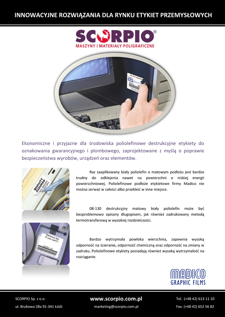 INNOWACYJNE ROZWIĄZANIA DLA RYNKU ETYKIET PRZEMYSŁOWYCH Ekonomiczne i przyjazne dla środowiska poliolefinowe destrukcyjne etykiety do oznakowania gwarancyjnego i plombowego, zaprojektowane z myślą o poprawie bezpieczeostwa wyrobów, urządzeo oraz elementów. Raz zaaplikowany biały poliolefin o matowym podłożu jest bardzo trudny do odklejenia nawet na powierzchni o niskiej energii powierzchniowej. Poliolefinowe podłoże etykietowe firmy Madico nie można zerwad w całości albo przekleid w inne miejsce. 08-130 destrukcyjny matowy biały poliolefin może byd bezproblemowo opisany długopisem, jak również zadrukowany metodą termotransferową w wysokiej rozdzielczości. Bardzo wytrzymała powłoka wierzchnia, zapewnia wysoką odpornośd na ścieranie, odpornośd chemiczną oraz odpornośd na zmiany w zadruku. Poliolefinowe etykiety posiadają również wysoką wytrzymałośd na rozciąganie. SCORPIO Sp. z o.o. ul. Brukowa 28a 91-341 Łódź www.scorpio.com.pl Tel. (+48 42) 613 11 10 [email protected] Fax. (+48 42) 652 56 82 INNOWACYJNE ROZWIĄZANIA DLA RYNKU ETYKIET PRZEMYSŁOWYCH Matowy, biały poliolefin zaprojektowany z myślą o poprawie bezpieczeostwa. Powleczenie Folia Folia: o grubości 72 mikronów, biały, powlekany destrukcyjny poliolefin o matowej powierzchni, oferujący bezproblemowy zadruk technologią termotransferową poprzez transfer taśmą żywiczną oraz technologią druku atramentowego. Klej: P1052 posiada wysoką przylepnośd na powierzchniach o niskiej i wysokiej energii powierzchniowej. P1052 posiada dobrą odpornośd na temperaturę oraz wilgod. Podkład: LR09 o gramaturze 90g/m2 biały satynowany podkład. Satynowany podkład został specjalnie użyty do Podkład Klej dalszego bezproblemowego konfekcjonowania podłoży Opis produktu: Kod: 08-130 – o grubości 72 mikronów, etykietowych. biały, powlekany, poliolefin o matowej powierzchni. Typowe aplikacje: Znakowanie elementów elektronicznych, Posiada właściwości destrukcyjne (kruszące się) stosowane części samochodowych oraz plombowanie wyrobów głównie jako plomby gwarancyjne, aplikowane na różnego Zastosowanie w branżach: RTV i AGD, Motoryzacja, typu powierzchniach. 08-130 odznacza się doskonałą Elektronika i Komputery odpornością na wilgod, promieniowane UV oraz zmiany temperatury. Zaprojektowane z myślą o zadruku Uwaga: Jeżeli etykietę powleczoną powierzchniowo przytnie atramentowym i termotransferowym (taśmą żywiczną lub się w miejscu zadrukowanym farbą utrwaloną UV, może woskowo-żywiczną). Folia 08-130 jest pokryta klejem wystąpid trudnośd z usunięciem podłoża z matrycy. Zalecanie P1052, który wykazuje bardzo dobrą przyczepnośd na jest przetestowanie folii przed zadrukiem. różnego typu powierzchniach. Opisane powyżej właściwości oraz testy wytrzymałościowe powinny byd traktowane jako przykład. Użytkownik powinien wiedzied, czy w jego przypadku środowisko użycia jest zgodne ze specyfikacjami podłoży. Odpowiedzialnośd co do określenia czy podłoże odpowiada środowisku zastosowania, w którym zostanie użyty, leży w gestii użytkownika. SCORPIO Sp. z o.o. ul. Brukowa 28a 91-341 Łódź www.scorpio.com.pl Tel. (+48 42) 613 11 10 [email protected] Fax. (+48 42) 652 56 82