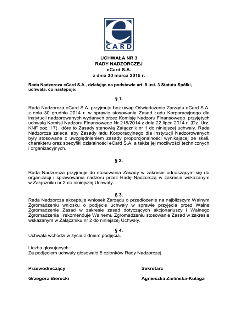 UCHWAŁA NR 3 RADY NADZORCZEJ eCard S.A. z dnia 30 marca 2015 r. Rada Nadzorcza eCard S.A., działając na podstawie art. 9 ust. 3 Statutu Spółki, uchwala, co następuje: § 1. Rada Nadzorcza eCard S.A. przyjmuje bez uwag Oświadczenie Zarządu eCard S.A. z dnia 30 grudnia 2014 r. w sprawie stosowania Zasad Ładu Korporacyjnego dla instytucji nadzorowanych wydanych przez Komisję Nadzoru Finansowego, przyjętych uchwałą Komisji Nadzoru Finansowego Nr 218/2014 z dnia 22 lipca 2014 r. (Dz. Urz. KNF poz. 17), które to Zasady stanowią Załącznik nr 1 do niniejszej uchwały. Rada Nadzorcza zaleca, aby Zasady ładu Korporacyjnego dla Instytucji Nadzorowanych były stosowane z uwzględnieniem zasady proporcjonalności wynikającej ze skali, charakteru oraz specyfiki działalności eCard S.A. a także jej możliwości technicznych i organizacyjnych. § 2. Rada Nadzorcza przyjmuje do stosowania Zasady w zakresie odnoszącym się do organizacji i sprawowania nadzoru przez Radę Nadzorczą w zakresie wskazanym w Załączniku nr 2 do niniejszej Uchwały. § 3. Rada Nadzorcza akceptuje wniosek Zarządu o przedłożenie na najbliższym Walnym Zgromadzeniu wniosku o podjęcie uchwały w sprawie przyjęcia przez Walne Zgromadzenie Zasad w zakresie zasad dotyczących akcjonariuszy i Walnego Zgromadzenia i rekomenduje Walnemu Zgromadzeniu stosowanie Zasad w zakresie wskazanym w Załączniku nr 2 do niniejszej Uchwały. § 4. Uchwała wchodzi w życie z dniem podjęcia. Liczba głosujących: Za podjęciem uchwały głosowało 5 członków Rady Nadzorczej. Przewodniczący Sekretarz Grzegorz Bierecki Agnieszka Zielińska-Kułaga