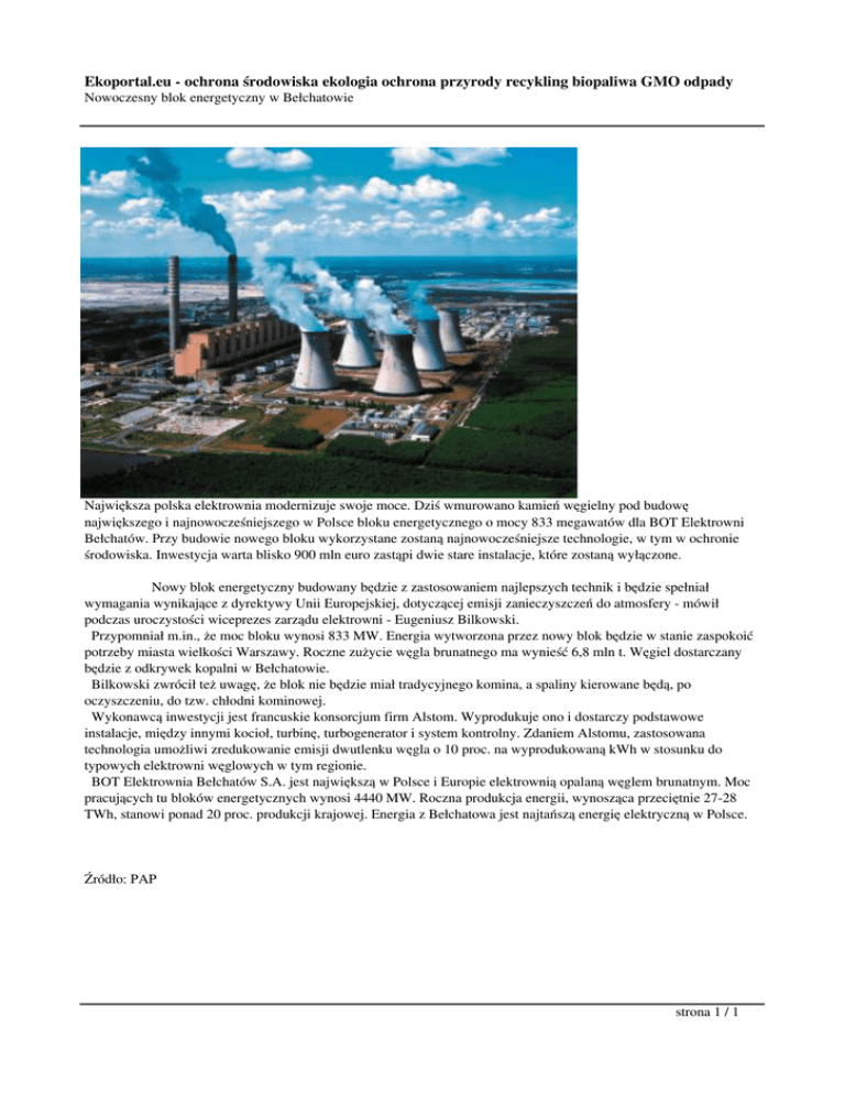 Ekoportal.eu - ochrona środowiska ekologia ochrona przyrody recykling biopaliwa GMO odpady Nowoczesny blok energetyczny w Bełchatowie Największa polska elektrownia modernizuje swoje moce. Dziś wmurowano kamień węgielny pod budowę największego i najnowocześniejszego w Polsce bloku energetycznego o mocy 833 megawatów dla BOT Elektrowni Bełchatów. Przy budowie nowego bloku wykorzystane zostaną najnowocześniejsze technologie, w tym w ochronie środowiska. Inwestycja warta blisko 900 mln euro zastąpi dwie stare instalacje, które zostaną wyłączone. Nowy blok energetyczny budowany będzie z zastosowaniem najlepszych technik i będzie spełniał wymagania wynikające z dyrektywy Unii Europejskiej, dotyczącej emisji zanieczyszczeń do atmosfery - mówił podczas uroczystości wiceprezes zarządu elektrowni - Eugeniusz Bilkowski. Przypomniał m.in., że moc bloku wynosi 833 MW. Energia wytworzona przez nowy blok będzie w stanie zaspokoić potrzeby miasta wielkości Warszawy. Roczne zużycie węgla brunatnego ma wynieść 6,8 mln t. Węgiel dostarczany będzie z odkrywek kopalni w Bełchatowie. Bilkowski zwrócił też uwagę, że blok nie będzie miał tradycyjnego komina, a spaliny kierowane będą, po oczyszczeniu, do tzw. chłodni kominowej. Wykonawcą inwestycji jest francuskie konsorcjum firm Alstom. Wyprodukuje ono i dostarczy podstawowe instalacje, między innymi kocioł, turbinę, turbogenerator i system kontrolny. Zdaniem Alstomu, zastosowana technologia umożliwi zredukowanie emisji dwutlenku węgla o 10 proc. na wyprodukowaną kWh w stosunku do typowych elektrowni węglowych w tym regionie. BOT Elektrownia Bełchatów S.A. jest największą w Polsce i Europie elektrownią opalaną węglem brunatnym. Moc pracujących tu bloków energetycznych wynosi 4440 MW. Roczna produkcja energii, wynosząca przeciętnie 27-28 TWh, stanowi ponad 20 proc. produkcji krajowej. Energia z Bełchatowa jest najtańszą energię elektryczną w Polsce. Źródło: PAP strona 1 / 1