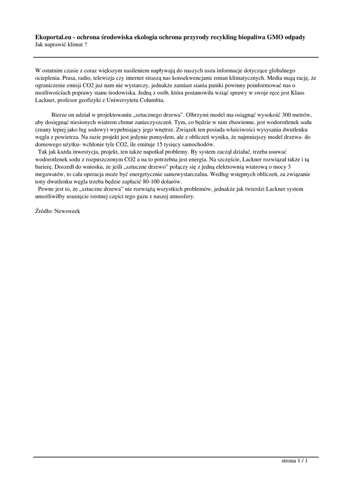 Ekoportal.eu - ochrona środowiska ekologia ochrona przyrody recykling biopaliwa GMO odpady Jak naprawić klimat ? W ostatnim czasie z coraz większym nasileniem napływają do naszych uszu informacje dotyczące globalnego ocieplenia. Prasa, radio, telewizja czy internet straszą nas konsekwencjami zmian klimatycznych. Media mają rację, że ograniczenie emisji CO2 już nam nie wystarczy, jednakże zamiast siania paniki powinny poinformować nas o możliwościach poprawy stanu środowiska. Jedną z osób, która postanowiła wziąć sprawy w swoje ręce jest Klaus Lackner, profesor geofizyki z Uniwersytetu Columbia. Bierze on udział w projektowaniu „sztucznego drzewa”. Olbrzymi model ma osiągnąć wysokość 300 metrów, aby dosięgnąć niesionych wiatrem chmur zanieczyszczeń. Tym, co będzie w nim zbawienne, jest wodorotlenek sodu (znany lepiej jako ług sodowy) wypełniający jego wnętrze. Związek ten posiada właściwości wysysania dwutlenku węgla z powietrza. Na razie projekt jest jedynie pomysłem, ale z obliczeń wynika, że najmniejszy model drzewa- do domowego użytku- wchłonie tyle CO2, ile emituje 15 tysięcy samochodów. Tak jak każda inwestycja, projekt, ten także napotkał problemy. By system zaczął działać, trzeba usuwać wodorotlenek sodu z rozpuszczonym CO2 a na to potrzebna jest energia. Na szczęście, Lackner rozwiązał także i tą barierę. Doszedł do wniosku, że jeśli „sztuczne drzewo” połączy się z jedną elektrownią wiatrową o mocy 3 megawatów, to cała operacja może być energetycznie samowystarczalna. Według wstępnych obliczeń, za związanie tony dwutlenku węgla trzeba będzie zapłacić 80-100 dolarów. Pewne jest to, że „sztuczne drzewa” nie rozwiążą wszystkich problemów, jednakże jak twierdzi Lackner system umożliwiłby usunięcie istotnej części tego gazu z naszej atmosfery. Źródło: Newsweek strona 1 / 1