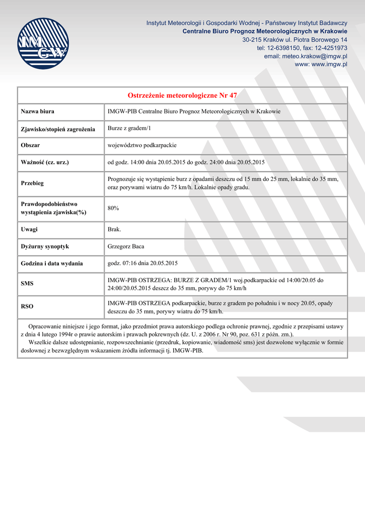 Instytut Meteorologii i Gospodarki Wodnej - Państwowy Instytut Badawczy Centralne Biuro Prognoz Meteorologicznych w Krakowie 30-215 Kraków ul. Piotra Borowego 14 tel: 12-6398150, fax: 12-4251973 email: [email protected] www: www.imgw.pl Ostrzeżenie meteorologiczne Nr 47 Nazwa biura IMGW-PIB Centralne Biuro Prognoz Meteorologicznych w Krakowie Zjawisko/stopień zagrożenia Burze z gradem/1 Obszar województwo podkarpackie Ważność (cz. urz.) od godz. 14:00 dnia 20.05.2015 do godz. 24:00 dnia 20.05.2015 Przebieg Prognozuje się wystąpienie burz z opadami deszczu od 15 mm do 25 mm, lokalnie do 35 mm, oraz porywami wiatru do 75 km/h. Lokalnie opady gradu. Prawdopodobieństwo wystąpienia zjawiska(%) 80% Uwagi Brak. Dyżurny synoptyk Grzegorz Baca Godzina i data wydania godz. 07:16 dnia 20.05.2015 SMS IMGW-PIB OSTRZEGA: BURZE Z GRADEM/1 woj.podkarpackie od 14:00/20.05 do 24:00/20.05.2015 deszcz do 35 mm, porywy do 75 km/h RSO IMGW-PIB OSTRZEGA podkarpackie, burze z gradem po południu i w nocy 20.05, opady deszczu do 35 mm, porywy wiatru do 75 km/h. Opracowanie niniejsze i jego format, jako przedmiot prawa autorskiego podlega ochronie prawnej, zgodnie z przepisami ustawy z dnia 4 lutego 1994r o prawie autorskim i prawach pokrewnych (dz. U. z 2006 r. Nr 90, poz. 631 z późn. zm.). Wszelkie dalsze udostępnianie, rozpowszechnianie (przedruk, kopiowanie, wiadomość sms) jest dozwolone wyłącznie w formie dosłownej z bezwzględnym wskazaniem źródła informacji tj. IMGW-PIB.