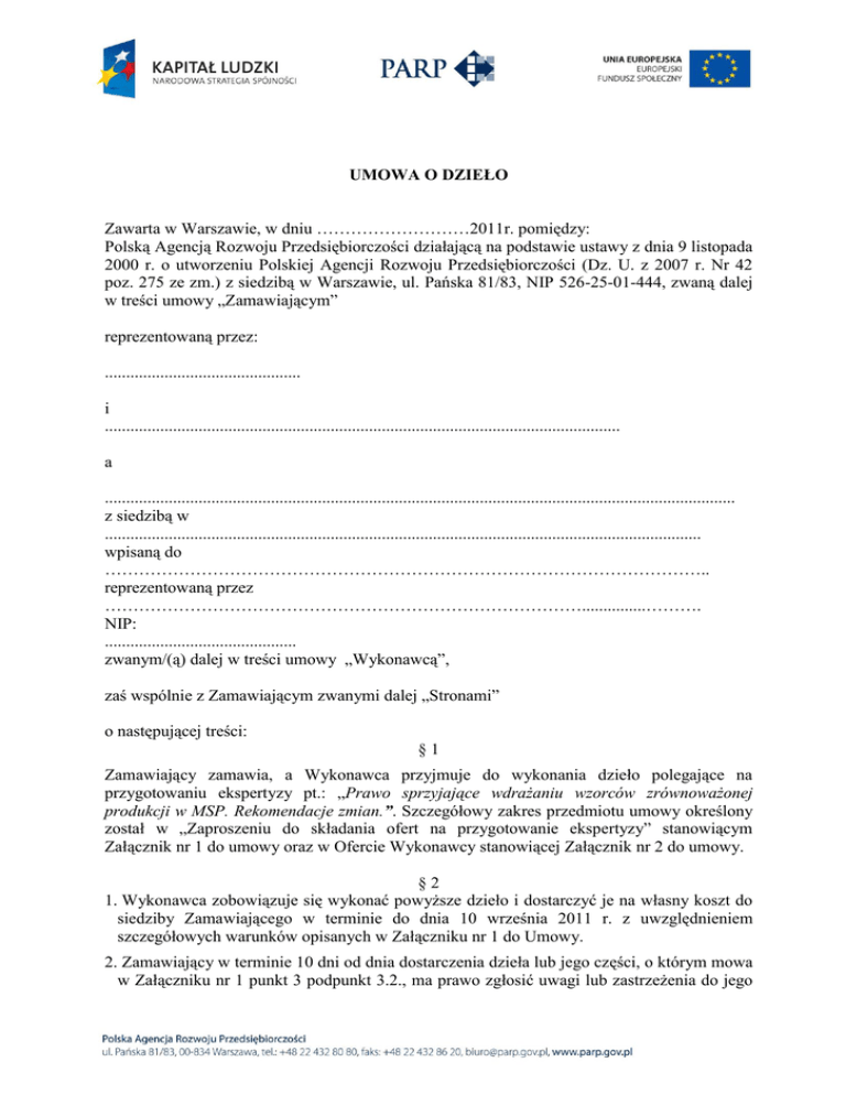 UMOWA O DZIEŁO Zawarta w Warszawie, w dniu ………………………2011r. pomiędzy: Polską Agencją Rozwoju Przedsiębiorczości działającą na podstawie ustawy z dnia 9 listopada 2000 r. o utworzeniu Polskiej Agencji Rozwoju Przedsiębiorczości (Dz. U. z 2007 r. Nr 42 poz. 275 ze zm.) z siedzibą w Warszawie, ul. Pańska 81/83, NIP 526-25-01-444, zwaną dalej w treści umowy „Zamawiającym” reprezentowaną przez: .............................................. i ......................................................................................................................... a .................................................................................................................................................... z siedzibą w ............................................................................................................................................ wpisaną do …………………………………………………………………………………………….. reprezentowaną przez …………………………………………………………………………...............………. NIP: ............................................. zwanym/(ą) dalej w treści umowy „Wykonawcą”, zaś wspólnie z Zamawiającym zwanymi dalej „Stronami” o następującej treści: §1 Zamawiający zamawia, a Wykonawca przyjmuje do wykonania dzieło polegające na przygotowaniu ekspertyzy pt.: „Prawo sprzyjające wdrażaniu wzorców zrównoważonej produkcji w MSP. Rekomendacje zmian.”. Szczegółowy zakres przedmiotu umowy określony został w „Zaproszeniu do składania ofert na przygotowanie ekspertyzy” stanowiącym Załącznik nr 1 do umowy oraz w Ofercie Wykonawcy stanowiącej Załącznik nr 2 do umowy. §2 1. Wykonawca zobowiązuje się wykonać powyższe dzieło i dostarczyć je na własny koszt do siedziby Zamawiającego w terminie do dnia 10 września 2011 r. z uwzględnieniem szczegółowych warunków opisanych w Załączniku nr 1 do Umowy. 2. Zamawiający w terminie 10 dni od dnia dostarczenia dzieła lub jego części, o którym mowa w Załączniku nr 1 punkt 3 podpunkt 3.2., ma prawo zgłosić uwagi lub zastrzeżenia do jego treści lub formy. Wykonawca jest zobowiązany uwzględnić te uwagi w terminie 10 dni od ich otrzymania i przekazać Zamawiającemu dzieło wolne od wad. 3. 1. 2. 3. 4. 5. 6. 7. 8. 9. Brak zastrzeżeń Zamawiającego w terminie, o którym mowa w ust. 2, oznacza, że Zamawiający przyjął dzieło bez zastrzeżeń. §3 Zamawiający zobowiązuje się do zapłaty wynagrodzenia ryczałtowego za wykonanie dzieła i za przeniesienie autorskich praw majątkowych, o których mowa w § 6 w łącznej kwocie ……………….. złotych brutto (słownie: ………………… złotych) Wartość autorskich praw majątkowych, o których mowa w § 6, wynosi …………… złotych brutto (słownie: …………………………………………… ) złotych brutto. Kwota, o której mowa w ust. 1, obejmuje wszystkie koszty związane z realizacją zamówienia. Wynagrodzenie Wykonawcy finansowane będzie ze środków europejskich, wypłacanych przez Bank Gospodarstwa Krajowego i współfinansowania krajowego, wypłacanego przez Zamawiającego. Wypłata wynagrodzenia dokonana zostanie na następujących zasadach: 1) w zakresie środków europejskich, wypłata zostanie zrealizowana przez Bank Gospodarstwa Krajowego - na podstawie wystawionego i przekazanego przez Zamawiającego do Banku Gospodarstwa Krajowego zlecenia płatności; 2) w zakresie środków współfinansowania krajowego, wystawiony zostanie przelew płatności z rachunku bankowego Zamawiającego. Wypłata wynagrodzenia realizowana będzie w następujący sposób: 1) w zakresie środków europejskich wypłacanych za pośrednictwem Banku Gospodarstwa Krajowego, w terminie do 30 dni kalendarzowych od dnia otrzymania prawidłowej faktury VAT Zamawiający jest zobowiązany do sporządzenia i złożenia do Banku Gospodarstwa Krajowego zlecenia płatności; 2) w zakresie środków na współfinansowanie wypłacanych przez Zamawiającego w terminie do 30 dni kalendarzowych od dnia otrzymania prawidłowej faktury VAT, pod warunkiem dostępności środków na finansowanie umowy na rachunku bankowym Zamawiającego. W przypadku naliczenia Wykonawcy kary umownej, płatności na rzecz Wykonawcy, będą dokonywane w terminie, o którym mowa w ust. 6, liczonym od dnia wpływu należnej kwoty kary umownej na rachunek bankowy wskazany przez Zamawiającego w wezwaniu do uiszczenia tej kary. Podstawą do wystawienia faktury VAT jest podpisanie przez Zamawiającego protokołu odbioru dzieła wolnego od wad. Faktura VAT musi być właściwie podpisana i wystawiona na: Polska Agencja Rozwoju Przedsiębiorczości Ul. Pańska 81/83 00-834 Warszawa NIP: 526-25-01-444 oraz wskazywać wartość autorskich praw majątkowych do poszczególnych utworów nabywanych przez Zamawiającego. 2 10. Zamawiający nie ponosi żadnej odpowiedzialności za opóźnienia w przekazywaniu środków na rachunek bankowy Wykonawcy wynikające z przyczyn związanych z obsługą rachunku bankowego przez Bank Gospodarstwa Krajowego. 11. Płatność będzie dokonywana w złotych polskich na rachunek bankowy Wykonawcy wskazany na fakturze VAT. 12. Za dzień dokonania zapłaty uznaje się dzień wydania dyspozycji obciążenia rachunku płatnością na rzecz Wykonawcy. 13. Wynagrodzenie w zakresie środków europejskich wypłacanych za pośrednictwem Banku Gospodarstwa Krajowego będzie wypłacane Wykonawcy zgodnie z Terminarzem płatności środków europejskich na dany rok kalendarzowy, ustalonym przez Ministra Finansów na podstawie umowy z dnia 18 listopada 2009 r. zawartej pomiędzy Ministrem Finansów a Bankiem Gospodarstwa Krajowego. Terminarz płatności środków europejskich na dany rok kalendarzowy jest dostępny na stronie internetowej Banku Gospodarstwa Krajowego www.bgk.com.pl. 14. Zamawiaj