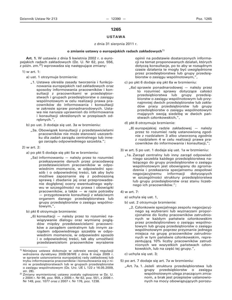 Dziennik Ustaw Nr 213 — 12390 — Poz. 1265 1265 USTA WA z dnia 31 sierpnia 2011 r. o zmianie ustawy o europejskich radach zakładowych1) Art. 1. W ustawie z dnia 5 kwietnia 2002 r. o europejskich radach zakładowych (Dz. U. Nr 62, poz. 556, z późn. zm.2)) wprowadza się następujące zmiany: 1) w art. 1: a) ust. 1 otrzymuje brzmienie: „1. Ustawa określa zasady tworzenia i funkcjonowania europejskich rad zakładowych oraz sposoby informowania pracowników i konsultacji z pracownikami w przedsiębiorstwach i grupach przedsiębiorstw o zasięgu wspólnotowym w celu realizacji prawa pracowników do informowania i konsultacji w zakresie spraw ponadnarodowych. Ustawa nie narusza uprawnień do informowania i konsultacji określonych w przepisach odrębnych.”, b) po ust. 3 dodaje się ust. 3a w brzmieniu: „3a. Obowiązek konsultacji z przedstawicielami pracowników nie może stanowić uszczerbku dla zadań zarządu centralnego lub innego zarządu odpowiedniego szczebla.”; 2) w art. 2: a) po pkt 5 dodaje się pkt 5a w brzmieniu: „5a) informowaniu — należy przez to rozumieć przekazywanie danych przez pracodawcę przedstawicielom pracowników w odpowiednim momencie, w odpowiedni sposób i o odpowiedniej treści, tak aby było możliwe zapoznanie się z podnoszoną sprawą i zbadanie jej oraz przeprowadzenie dogłębnej oceny ewentualnego wpływu w szczególności na prawa i obowiązki pracowników, a także — w razie potrzeby — przygotowanie konsultacji z właściwym organem danego przedsiębiorstwa lub grupy przedsiębiorstw o zasięgu wspólnotowym,”, b) pkt 6 otrzymuje brzmienie: „6) konsultacji — należy przez to rozumieć nawiązywanie dialogu oraz wymianę poglądów między przedstawicielami pracowników a zarządem centralnym lub innym zarządem odpowiedniego szczebla w odpowiednim momencie, w odpowiedni sposób i o odpowiedniej treści, tak aby umożliwić przedstawicielom pracowników wyrażenie 1) Niniejsza ustawa dokonuje w zakresie swojej regulacji wdrożenia dyrektywy 2009/38/WE z dnia 6 maja 2009 r. w sprawie ustanowienia europejskiej rady zakładowej lub trybu informowania pracowników i konsultowania się z nimi w przedsiębiorstwach lub w grupach przedsiębiorstw o zasięgu wspólnotowym (Dz. Urz. UE L 122 z 16.05.2009, str. 28). 2) Zmiany wymienionej ustawy zostały ogłoszone w Dz. U. z 2004 r. Nr 96, poz. 959, z 2005 r. Nr 62, poz. 551, z 2006 r. Nr 149, poz. 1077 oraz z 2007 r. Nr 176, poz. 1238. opinii na podstawie dostarczonych informacji na temat proponowanych działań, których dotyczą konsultacje, po to aby w rozsądnym czasie działania te mogły być uwzględnione przez przedsiębiorstwa lub grupy przedsiębiorstw o zasięgu wspólnotowym,”, c) po pkt 6 dodaje się pkt 6a w brzmieniu: „6a) sprawie ponadnarodowej — należy przez to rozumieć sprawy dotyczące całości przedsiębiorstwa lub grupy przedsiębiorstw o zasięgu wspólnotowym lub przynajmniej dwóch przedsiębiorstw lub zakładów pracy przedsiębiorstw lub grupy przedsiębiorstw o zasięgu wspólnotowym mających swoją siedzibę w dwóch państwach członkowskich,”, d) pkt 8 otrzymuje brzmienie: „8) europejskiej radzie zakładowej — należy przez to rozumieć radę ustanowioną zgodnie z rozdziałem 3 albo utworzoną zgodnie z rozdziałem 4 w celu realizacji prawa pracowników do informowania i konsultacji,”; 3) w art. 5 po ust. 1 dodaje się ust. 1a w brzmieniu: „1a. Zarząd centralny lub inny zarząd odpowiedniego szczebla każdego przedsiębiorstwa należącego do grupy przedsiębiorstw o zasięgu wspólnotowym jest obowiązany do zgromadzenia i przekazania specjalnemu zespołowi negocjacyjnemu informacji dotyczących w szczególności struktury przedsiębiorstwa lub grupy przedsiębiorstw oraz stanu liczebnego ich pracowników.”; 4) w art. 7: a) uchyla się ust. 1, b) ust. 2 otrzymuje brzmienie: „2. Członkowie specjalnego zespołu negocjacyjnego są wybierani lub wyznaczani proporcjonalnie do liczby pracowników zatrudnionych w każdym państwie członkowskim przez przedsiębiorstwo o zasięgu wspólnotowym lub grupę przedsiębiorstw o zasięgu wspólnotowym poprzez przyznanie jednego miejsca na grupę pracowników zatrudnionych w tym państwie członkowskim, reprezentującą 10% liczby pracowników zatrudnionych we wszystkich państwach członkowskich, lub na część tej grupy.”, c) uchyla się ust. 3; 5) po art. 7 dodaje się art. 7a w brzmieniu: „Art. 7a. 1. Jeżeli struktura przedsiębiorstwa lub grupy przedsiębiorstw o zasięgu wspólnotowym ulega znaczącym zmianom, a brak jest przepisów ustanowionych na mocy obowiązujących porozu- Dziennik Ustaw Nr 213 — 12391 — mień dotyczących zmiany porozumienia lub są niezgodności między odpowiednimi przepisami co najmniej dwóch obowiązujących porozumień, zarząd centralny rozpoczyna negocjacje, o których mowa w art. 6 ust. 2, z własnej inicjatywy lub na pisemny wniosek co najmniej 100 pracowników lub ich przedstawicieli w co najmniej dwóch przedsiębiorstwach lub zakładach pracy w co najmniej dwóch państwach członkowskich. 2. W przypadku, o którym mowa w ust. 1, w skład specjalnego zespołu negocjacyjnego, oprócz członków wybranych lub wyznaczonych zgodnie z art. 7 ust. 2, wchodzi co najmniej trzech członków europejskiej rady zakładowej lub każdej z europejskich rad zakładowych. 3. W trakcie negocjacji, o których mowa w ust. 1, europejska rada zakładowa lub europejskie rady zakładowe wykonują swoje uprawnienia zgodnie z warunkami określonymi porozumieniem między europejską radą zakładową lub europejskimi radami zakładowymi a zarządem centralnym.”; Poz. 1265 8) w art. 14: a) ust. 1 otrzymuje brzmienie: „1. W terminie 30 dni od ustalenia składu specjalnego zespołu negocjacyjnego zarząd centralny zwołuje zebranie z jego udziałem w celu zawarcia porozumienia o ustanowieniu europejskiej rady zakładowej lub ustaleniu sposobu informowania pracowników