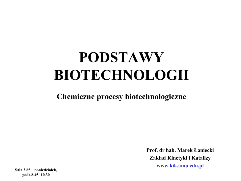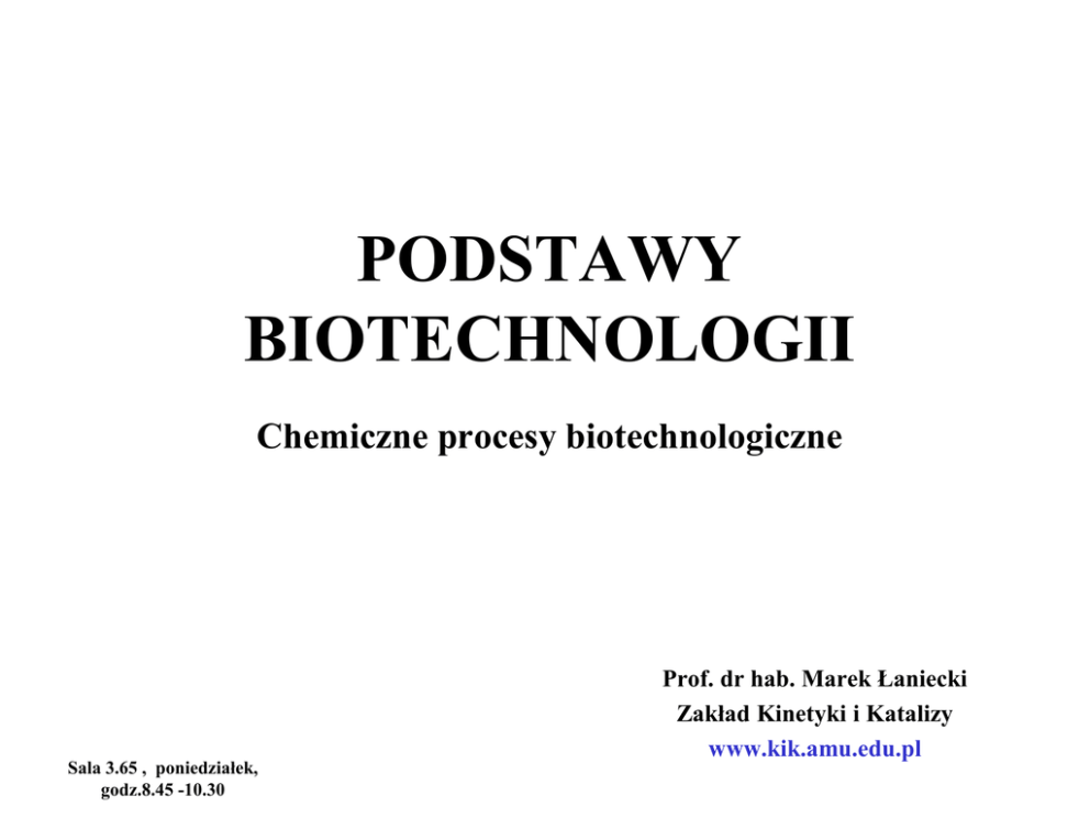 PODSTAWY BIOTECHNOLOGII Chemiczne procesy biotechnologiczne Sala 3.65 , poniedziałek, godz.8.45 -10.30 Prof. dr hab. Marek Łaniecki Zakład Kinetyki i Katalizy www.kik.amu.edu.pl krówka 1410 – ? 1605 – ? Program wykładów 1. Komórka (bakterie, drożdże) 2. Enzymy – katalizatory biologiczne 3. Metabolizm komórkowy i sposoby pozyskiwania energii 4. Wytwarzanie wina i piwa 5. Biologiczne oczyszczanie ścieków 6. Biopaliwa 7. Związki biologicznie czynne (aminokwasy, antybiotyki BIOTECHNOLOGIA – dyscyplina nauk technicznych wykorzystująca procesy biologiczne na skalę przemysłową BIOTECHNOLOGIA – interdyscyplinarna dziedzina nauki wykorzystująca systemy biologiczne, komórki mikroorganizmów, części komórki lub ich molekularne analogi dla uzyskania określonych produktów BIOTECHNOLOGIA – zastosowanie technologiczne systemów biologicznych, organizmów żywych lub ich składników do wytwarzania lub modyfikowania produktów lub procesów do określonego zastosowania Podział Biała biotechnologia – systemy biologiczne w produkcji przemysłowej i ochronie środowiska Zielona biotechnologia – rolnictwo Czerwona biotechnologia – ochrona zdrowia (biofarmaceutyki, diagnostyka genetyczna, genoterapia, transplantologia) Fioletowa biotechnologia - ustawodawstwo Biotechnologia zwierząt Biotechnologia roślin Biotechnologia żywności Tradycyjna – naturalne enzymy i organizmy bez obcego materiału genetycznego Nowoczesna – organizmy, enzymy, białka zmodyfikowane genetycznie EuropaBio A. Chmiel, Biotechnologia. Podstawy mikrobiologiczne i biochemiczne, PWN, Warszawa, 1998. Stanley Miller exp.1954 Nobel - 1989 „Prebiotyczna zupa” CH4 CO2 NH3 H2 H2O UV Q CH3COOH CH3CH2OHCOOH NH2-CO-NH2 NH2CH2COOH NH2CH2(CH3)COOH NH2-CH2(CH2COOH)COOH kwas octowy kwas mlekowy mocznik glicyna alanina kwas asparaginowy Komórka „najprostsza” forma życia Schemat komórki bakterii P. Singleton, Bakterie w biologii, biotechnologii i medycynie, PWN, 2000, Warszawa. Przybliżony skład chemiczny typowej komórki bakterii i komórki ssaka Procent całkowitej wagi komórki Składnik Bakteria E. coli Komórka ssaka H2O Jony nieorganiczne (Na+, K+, Mg2+, Ca2+, Cl- ) Małe metabolity Białka RNA DNA Fosfolipidy Inne lipidy Polisacharydy 70 1 70 1 3 15 6 1 2 2 3 18 1.1 0.25 3 2 2 Całkowita objętość komórki Względna objętość komórki 2 x 10-12 cm3 1 4 x 10-9 2000 B. Alberts, D. Bray, J.Lewis, M. Raff, K. Roberts, J.D.Watson, Molecular Biology of the Cell, Garland Publishing Inc. 1983, NY/London Gronkowiec złocisty (Staphylococcus aureus) Formy bakterii gronkowce pakietowce paciorkowce dwoinki pałeczki laseczki średnia wielkość : 0.75 - 2.0 µm przecinkowce śrubowce krętki srednia wielkość : 0.2(1.0) do 60-80 µm CYTOLOGIA Badania morfologii i działania strukturalnych składników komórki. 1. Błona komórkowa 2. Cytoplazma z organellami 3. Jądro 4. Membrana z chromosomami Drożdże Saccharomyces – rodzaj z rodziny drożdżowatych - grzyby jednokomórkowe o komórkach kulistych, jajowatych lub walcowatych. Wielkość – od 1 do 10 mikrometrów Rozmnażanie – przez pączkowanie ( w niesprzyjających warunkach rozmnażanie płciowe) Około 200 gatunków z dużą liczbą odmian. Fermentacja dolna Fermentacja górna d. Piwowarskie d. Winiarskie d. Piekarnicze d. Gorzelnicze Spożywcze i paszowe Królestwo – grzyby Typ - woreczniaki Rodzaj - drożdże Elementy komórki Cytoplazma - ciecz, w której zawieszone są wszystkie struktury komórki oraz składniki pokarmowe, jony, enzymy, produkty przemiany materii. Nukleoid (chromosom) - zwinięta w ścisłą strukturę nić DNA o długości około 1mm, połączona z cząsteczkami RNA i białkami. Zawiera komplet informacji genetycznej. Plazmid – pozachromosomowy fragment DNA, zazwyczaj o kształcie kolistym, zdolny do niezależnej replikacji. Koduje różne przydatne komórce funkcje jak np. oporność na antybiotyki. Rybosom – zbudowany jest z dwóch podjednostek: dużej (50S) i małej (30S). Zawiera rRNA (70%) i białka (30%). Jego rolą jest odczytanie kodu genetycznego i kontrola syntezy białek. Substancje zapasowe – poli-β-hydroksymaślan (PHB), glikogen, polifosforany. Synteza oraz magazynowanie PHB i glikogenu zachodzi, gdy obecne jest źródło węgla przy jednoczesnym deficycie azotu, siarki. Synteza polifosforanów ma miejsce w warunkach aerobowych przy nadmiarze fosforanów w środowisku. Chromatofory – organelle komórkowe zawierające chlorofil i karotenoidy. U cyjanobakterii i bakterii fotosyntetyzujących zwane są tylakoidami. Mają formę pęcherzyków lub spłaszczonych, warstwowo ułożonych błon i połączone są z błoną cytoplazmatyczną. Biorą udział w fotosyntezie. Wakuole gazowe – występują u niektórych prokariotów np. cyjanobakterii. Składają się z drobnych, wypełnionych gazem pęcherzyków. Wpływają na gęstość komórek i pozwalają zwiększyć dostęp światła. Karboksysomy – wewnątrzkomórkowe struktury błonowe u bakterii autotroficznych. Zawierają enzym RuBisCo biorący udział w wiązaniu atmosferycznego CO2. Osłony komórkowe - błona cytoplazmatyczna , ściana komórkowa, błona zewnętrzna, warstwy zewnątrzkomórkowe (otoczki lub śluz). Narządy ruchu - rzęski lub wici, umożliwiają poruszanie się w kierunku substancji odżywczych i ucieczkę przed substancjami toksycznymi. Funkcje ściany komórkowej i błony komórkowej nadają kształt i zabezpieczają przed ciśnieniem osmotycznym, są miejscem, w którym przebiega wiele reakcji, uczestniczą w przekazywaniu sygnałów do wnętrza komórki, są głównymi elementami systemu transportu i magazynowania energii, regulują przemieszczanie się substancji między komórką, a środowiskiem zewnętrznym: są przepuszczalne dla cząstek hydrofobowych ( N2 , O2 , węglowodorów) i małych cząstek polarnych (H2O, CO2, gliceryny, mocznika), a nieprzepuszczalne dla aminokwasów, H-, HCO3-, Ca2+, K+, Cl-, M