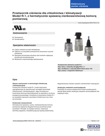 Elektroniczny pomiar ciśnienia Przetwornik ciśnienia dla chłodnictwa i klimatyzacji Model R-1, z hermetycznie spawaną cienkowarstwową komorą pomiarową Karta katalogowa WIKA PE 81.45 Zastosowanie ■■ Kompresory ■■ Kondensatory Specjalne właściwości ■■ Części zwilżane ze stali nierdzewnej ■■ Odporny na wszystkie powszechnie stosowane czynniki chłodnicze ■■ Specjalna konstrukcja obudowy dla możliwie najlepszej szczelności kondensacyjnej ■■ Możliwość indywidualnego etykietowania Przetwornik ciśnienia model R-1 Rys. lewy: z wtyczką okrągłą M12 x 1 Rys. środkowy: z wtyczką Metri-Pack seria 150 Rys. prawy: z wyjściem kablowym Opis Obszar zastosowań w technologii chłodniczej i klimatyzacyjnej Przetwornik ciśnienia model R-1 został optymalnie zaprojektowany do specyficznych wymagań technologii chłodnicznych i klimatyzacyjnych. Jego monolityczna konstrukcja eliminuje zaporzebowanie na seperatory od strony przyłącza procesowego. Umożliwia to stosowanie modelu R-1 ze wszystkimi typowymi czynnikami chłodniczymi (np. freon lub amoniak). długookresową i bardzo wysokim ciśnienieniem niszczącym. Atrakcyjny wskaźnik cena/wydajność Produkcja na wysoce elastycznych liniach produkcyjnych, oferuje także bardzo atrakcyjny wskaźnik cena/wydajność dla większych ilości. Doskonała niezawodność Hermetycznie spawana, sucha, cienkowarstwowa komora pomiarowa zapewnia długoterminową szczelność przed wyciekami. Ponadto, te wydajne komory, wykonane techniką napylania, charakteryzują się wysoką stabilnością Karta katalogowa WIKA PE 81.45 ∙ 02/2016 Strona 1 z 6 Zakresy pomiarowe Ciśnienie względne bar Zakres pomiarowy 0 ... 6 0 ... 10 0 ... 15 0 ... 16 0 ... 20 0 ... 25 0 ... 30 100 100 160 160 250 250 400 Dopuszczalne przeciążenie 20 Ciśnienie niszczące Zakres pomiarowy 0 ... 35 Dopuszczalne przeciążenie 80 Ciśnienie niszczące psi Zakres pomiarowy 400 0 ... 100 Dopuszczalne przeciążenie 290 Ciśnienie niszczące Zakres pomiarowy 1,450 0 ... 450 Dopuszczalne przeciążenie 1,100 Ciśnienie niszczące Zakres pomiarowy 5,800 0 ... 800 Dopuszczalne przeciążenie 1,700 Ciśnienie niszczące 5,800 20 0 ... 40 80 400 0 ... 150 290 1,450 0 ... 500 1,100 5,800 0 ... 850 1,700 5,800 32 32 0 ... 45 50 0 ... 50 80 0 ... 60 80 400 80 400 0 ... 200 400 0 ... 250 460 0 ... 300 460 2,300 720 2,300 0 ... 550 3,600 0 ... 600 1,100 0 ... 650 1,100 5,800 1,100 5,800 0 ... 1,500 5,800 0 ... 2,400 2,900 50 80 0 ... 100 200 800 0 ... 350 720 3,600 0 ... 700 1,100 7,900 0 ... 160 320 1,000 0 ... 400 720 3,600 0 ... 750 1,100 7,900 4,600 11,600 14,500 Podciśnienie i zakresy pomiarowe +/bar Zakres pomiarowy -1 ... +7 Dopuszczalne przeciążenie 20 Ciśnienie niszczące 100 Zakres pomiarowy -1 ... +25 Ciśnienie niszczące 250 Dopuszczalne przeciążenie 50 psi Zakres pomiarowy -30 InHg ... +100 Dopuszczalne przeciążenie 290 Ciśnienie niszczące Zakres pomiarowy 1,450 -30 InHg ... +350 Dopuszczalne przeciążenie 720 Ciśnienie niszczące Zakres pomiarowy 3,600 -30 InHg ... +600 -1 ... +9 20 100 -1 ... +29 80 400 -30 InHg ... +145 290 -1 ... +10 -1 ... +15 20 32 100 160 -1 ... +45 -0.5 ... +7 120 20 550 -30 InHg ... +200 460 100 -30 InHg ... +250 460 -1 ... +20 50 250 -0.5 ... +10 20 100 -30 InHg ... +300 720 1,450 2,300 2,300 3,600 1,100 1,100 1,100 1,100 -30 InHg ... +400 5,800 -30 InHg ... +450 5,800 -30 InHg ... +500 5,800 -30 InHg ... +550 5,800 Dopuszczalne przeciążenie 1,700 Ciśnienie niszczące 7,900 Inne zakresy pomiarowe na zapytanie Szczelność próżniowa Tak Strona 2 z 6 Karta katalogowa WIKA PE 81.45 ∙ 02/2016 Sygnały wyjściowe Typ sygnału Dane dotyczące dokładności Sygnał 4 ... 20 mA DC 1 ... 5 V DC 0 ... 10 V Ratiometryczny (3-przewodowy) DC 0.5 ... 4.5 V Prądowy (2-przewodowy) Napięciowy (3-przewodowy) Inne sygnały wyjściowe dostępne na zapytanie Obciążenie w Ω ■■ Sygnał prądowy (2-przewodowy): ≤ (zasilanie - 7 V) / 0.02 A ■■ Sygnał napięciowy (3-przewodowy): > max. sygnał wyjściowy / 1 mA ■■ Wyjście ratiometryczne (3-przewodowe): > maxi. sygnał wyjściowy / 1 mA Dokładność w warunkach odniesienia ≤ 2 % zakresu Obejmuje nieliniowość, histerezę, zero offset i odchylenie końcowej wartości (odpowiada błędowi urządzenia wg IEC 61298-2). Błąd temperaturowy przy -25 ... +85 °C ■■ Średni wspólczynnik temperaturowy punktu zerowego: typowy ≤ ±0.5% zakresu/10 K ■■ Średni współczynnik temperaturowy zakresu: ≤ 0.3 % zakresu/10 K Czas ustalania ≤ 5 ms Długoterminowy dryf (wg IEC 61298-2) ≤ 0.3 % zakresu/rok Napięcie zasilające Warunki pracy Zasilanie Zasilanie zależy od wybranego sygnału wyjściowego ■■ 4 ... 20 mA: DC 7 ...30 V ■■ DC 1 ... 5 V: DC 8 ...30 V ■■ DC 0 ... 10 V: DC 14 ... 30 V ■■ DC 0.5 ... 4.5 V: DC 4.5 ... 5.5 V Stopień ochrony (wg IEC 60529) Stopień ochrony zależy od typu przyłącza elektrycznego. ■■ Wtyczka okrągła M12 x 1: IP 67 ■■ Wtyczka Metri-Pack seria 150: IP 67 ■■ Wyjście kablowe: IP 69K Warunki odniesienia (wg IEC 61298-1) Temperatura 15 ... 25 °C Ciśnienie atmosferyczne 860 ... 1,060 mbar Podany stopień ochrony ma zastosowanie tylko wtedy, kiedy zastosowano połączenie z dopasowanymi wtyczkami, posiadającymi właściwy stopień ochrony. Temperatury ■■ Medium: ■■ Otoczenia: ■■ Przechowywania: -40 ... +100 °C -25 ... +85 °C -25 ... +85 °C -40 ... +212 °F -13 ... +185 °F -13 ... +185 °F Odporność Przetwornik ciśnienia jest odporny na standardowe przemysłowe czynniki chłodnicze. Wilgotność 45 ... 75 % względna Zasilanie DC 24 V Pozycja nominalna Kalibrowany w pozycji pionowej z dolnym przyłączem skierowanym w dół. Karta katalogowa WIKA PE 81.45 ∙ 02/2016 Strona 3 z 6 Przyłącza procesowe Materiały Standard Rozmiar gwintu EN 837 ANSI/ASME B1.20.1 G¼B ⅛ NPT ¼ NPT R¼ PT ¼ 7/16-20 UNF-2A stożek 90° 7/16-20 UNF-2B Schrader wewnętrzny ISO 7 KS SAE Części zw