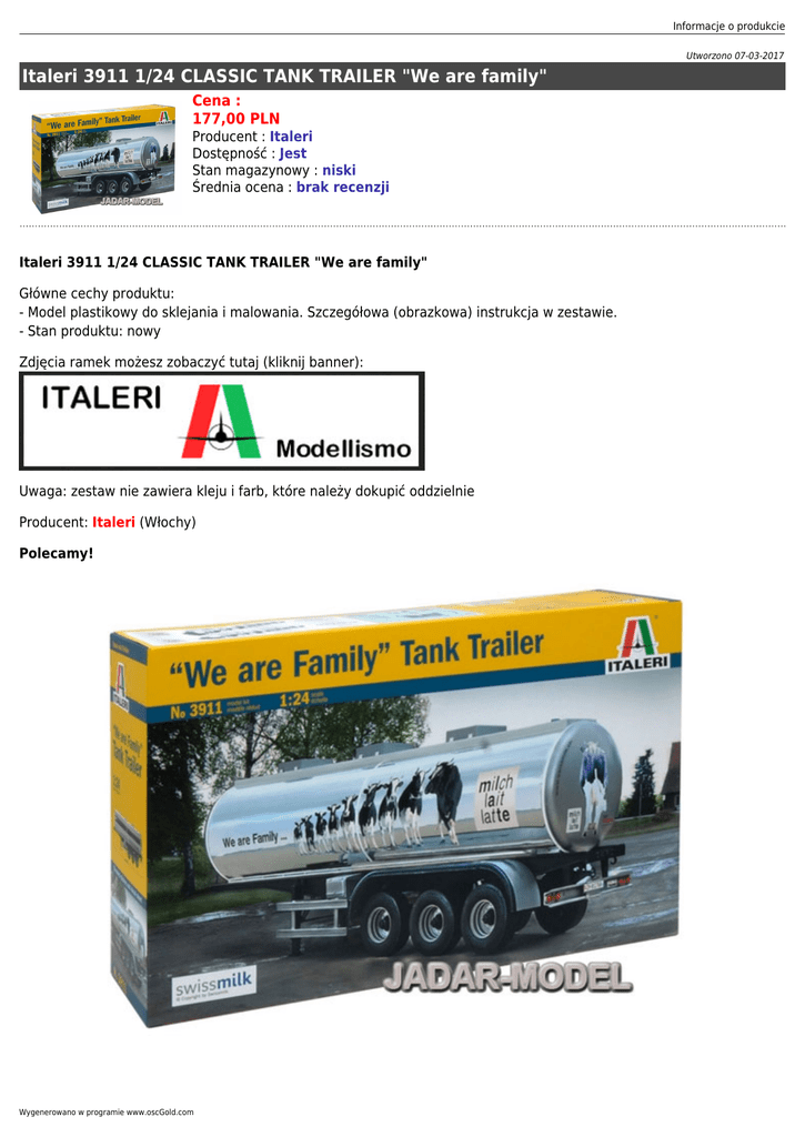 Informacje o produkcie Utworzono 07-03-2017 Italeri 3911 1/24 CLASSIC TANK TRAILER "We are family" Cena : 177,00 PLN Producent : Italeri Dostępność : Jest Stan magazynowy : niski Średnia ocena : brak recenzji Italeri 3911 1/24 CLASSIC TANK TRAILER "We are family" Główne cechy produktu: - Model plastikowy do sklejania i malowania. Szczegółowa (obrazkowa) instrukcja w zestawie. - Stan produktu: nowy Zdjęcia ramek możesz zobaczyć tutaj (kliknij banner): Uwaga: zestaw nie zawiera kleju i farb, które należy dokupić oddzielnie Producent: Italeri (Włochy) Polecamy! Wygenerowano w programie www.oscGold.com Ważne informacje: - Całkowita cena niniejszego przedmiotu wraz z kosztami przesyłki będzie widoczna po "wrzuceniu" go do koszyka. - Zamówione towary wysyłamy w ciągu 3 dni. Wyjątkiem są przedmioty, gdzie w oknie "Dostępność" jest podany termin oznaczający, że towar będzie sprowadzony na indywidualne zamówienie klienta. Jeśli zamówione zostaną przedmioty dostępne "od ręki" oraz te "na zamówienie" termin wysyłki ulegnie zmianie o czas potrzebny na sprowadzenie towaru. - Wszystkie dostępne w naszym sklepie formy płatności są widoczne w regulaminie sklepu oraz po przejściu do koszyka.