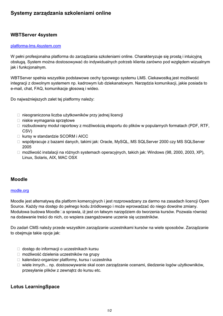 Systemy zarządzania szkoleniami online WBTServer 4system platforma-lms.4system.com W pełni profesjonalna platforma do zarządzania szkoleniami online. Charakteryzuje się prostą i intuicyjną obsługą. System można dostosowywać do indywidualnych potrzeb klienta zarówno pod względem wizualnym jak i funkcjonalnym. WBTServer spełnia wszystkie podstawowe cechy typowego systemu LMS. Ciekawostką jest możliwość integracji z dowolnym systemem np. kadrowym lub dziekanatowym. Narzędzia komunikacji, jakie posiada to e-mail, chat, FAQ, komunikacje głosową i wideo. Do najważniejszych zalet tej platformy należy: nieograniczona liczba użytkowników przy jednej licencji niskie wymagania sprzętowe rozbudowany moduł raportowy z możliwością eksportu do plików w popularnych formatach (PDF, RTF, CSV) kursy w standardzie SCORM i AICC współpracuje z bazami danych, takimi jak: Oracle, MySQL, MS SQLServer 2000 czy MS SQLServer 2005 możliwość instalacji na różnych systemach operacyjnych, takich jak: Windows (98, 2000, 2003, XP), Linux, Solaris, AIX, MAC OSX Moodle modle.org Moodle jest alternatywą dla platform komercyjnych i jest rozprowadzany za darmo na zasadach licencji Open Source. Każdy ma dostęp do pełnego kodu źródłowego i może wprowadzać do niego dowolne zmiany. Modułowa budowa Moodle a sprawia, iż jest on łatwym narzędziem do tworzenia kursów. Pozwala również na dodawanie treści do nich, co wspiera zaangażowane uczenie się uczestników. Do zadań CMS należy przede wszystkim zarządzanie uczestnikami kursów na wiele sposobów. Zarządzanie to obejmuje takie opcje jak: dostęp do informacji o uczestnikach kursu możliwość dzielenia uczestników na grupy kalendarz-organizer platformy, kursu i uczestnika wiele innych... np. dostosowywanie skal ocen zarządzanie ocenami, śledzenie logów użytkowników, przesyłanie plików z zewnątrz do kursu etc. Lotus LearningSpace 1/2 www-306.ibm.com/software/lotus Lotus LearningSpace jest to kompletna i elastyczna platforma edukacyjna zapewniająca sieciowe środowisko przystosowane do pracy w różnych trybach nauczania: indywidualnym, asynchronicznej pracy grupowej i tzw. "klasy wirtualnej". Lotus LearningSpace daje możliwość: prowadzenia szkoleń w różnych trybach, utworzenia struktury szkoleń w firmie z własnymi mechanizmami analizy i zarządzania. Lotus LearningSpace zapewnia także wsparcie dla osób które zajmują się planowaniem programów nauczania, instruktorów czy administratorów. 2/2