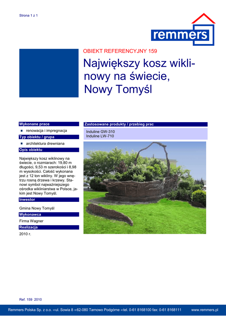 Strona 1 z 1 OBIEKT REFERENCYJNY 159 Największy kosz wiklinowy na świecie, Nowy Tomyśl Wykonane prace renowacja i impregnacja Typ obiektu / grupa Zastosowane produkty / przebieg prac Induline GW-310 Induline LW-710 architektura drewniana Opis obiektu Największy kosz wiklinowy na świecie, o rozmiarach: 19,80 m długości, 9,53 m szerokości i 8,98 m wysokości. Całość wykonana jest z 12 ton wikliny. W jego wnętrzu rosną drzewa i krzewy. Stanowi symbol najważniejszego ośrodka wikliniarstwa w Polsce, jakim jest Nowy Tomyśl. Inwestor Gmina Nowy Tomyśl Wykonawca Firma Wagner Realizacja 2010 r. Ref. 159 2010 Remmers Polska Sp.Sp. z o.o. • ul.• Sowia 8 • 862-080 Tarnowo Podgórne • tel. 0-61 8168100 fax:fax: 0-61 8168111 Remmers Polska z o.o. ul. Sowia • 62-080 Tarnowo Podgórne • tel. 0-61 8168100 0-61 8168111 www.remmers.pl www.remmers.pl