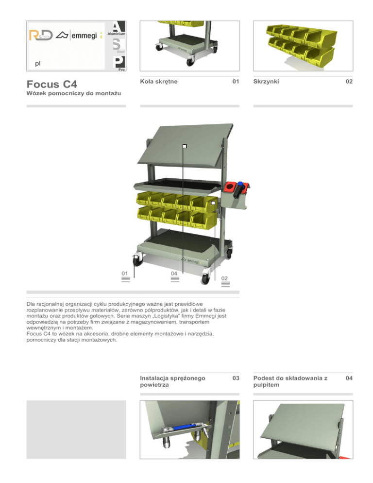 pl Koła skrętne Focus C4 01 Skrzynki 02 03 Podest do składowania z pulpitem 04 Wózek pomocniczy do montażu 01 04 02 Dla racjonalnej organizacji cyklu produkcyjnego ważne jest prawidłowe rozplanowanie przepływu materiałów, zarówno półproduktów, jak i detali w fazie montażu oraz produktów gotowych. Seria maszyn „Logistyka” firmy Emmegi jest odpowiedzią na potrzeby firm związane z magazynowaniem, transportem wewnętrznym i montażem. Focus C4 to wózek na akcesoria, drobne elementy montażowe i narzędzia, pomocniczy dla stacji montażowych. Instalacja sprężonego powietrza Focus C4 Wózek pomocniczy do montażu 01 02 03 04 Koła skrętne Skrzynki Instalacja sprężonego powietrza Podest do składowania z pulpitem Wózek wyposażono w 4 koła skrętne z hamulcami, które zapewniają jego łatwe prowadzenie i przewożenie elementów. Blokada układu hamulcowego umożliwia stabilne zatrzymanie wózka przy poszczególnych strefach roboczych. Komplet wygodnych pojemników umożliwia łatwe i uporządkowane przechowywanie drobnych elementów montażowych. Szybkozłączka zapewnia sprawne podłączenie sprężonego powietrza. Nachylony podest wyposażony jest w pulpit, na którym można umieścić listy materiałowe. DANE TECHNICZNE Pulpit / Podest do składowania narzędzi i akcesoriów Konstrukcja modułowa Uchwyty narzędziowe na wiertarkę i wkrętarkę pneumatyczną 2 Pojemniki na drobne elementy montażowe 10 Instalacja sprężonego powietrza z 2 szybkozłączkami i 2 przewodami spiralnymi MT10 wyposażonymi w złącza do narzędzi pneumatycznych 4 koła skrętne, w tym 2 z blokadą (mm) 2008/07/30 ø 100 www.randdtech.pl