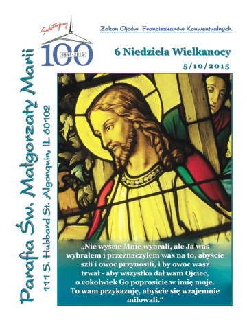 6 Niedziela Wielkanocy 5/10/2015 111 S. Hubbard St. Algonquin, lL 60102 Parafia Św. Małgorzaty Marii Zakon Ojców Franciszkanów Konwentualnych „Nie wyście Mnie wybrali, ale Ja was wybrałem i przeznaczyłem was na to, abyście szli i owoc przynosili, i by owoc wasz trwał - aby wszystko dał wam Ojciec, o cokolwiek Go poprosicie w imię moje. To wam przykazuję, abyście się wzajemnie miłowali.“ OD PROBOSZCZA „To wam powiedziałem, aby radość moja w was była i aby radość wasza była pełna” „Badania potwierdzają słuszność biblijnego stwierdzenia: Wesołe serce jest najlepszym lekarstwem; lecz przygnębiony duch wysusza ciało (Prz 17, 22). Pismo Święte podkreśla uzdrawiające własności śmiechu, radości i ducha dziękczynienia, o których przekonał się między innymi Norman Cousins (1915–1990), wykładowca na wydziale medycznym Uniwersytetu w Los Angeles, autor książki Anatomy of an Illness (Anatomia choroby). Opisał w niej swoją walkę z chorobą, która powaliła go w wieku pięćdziesięciu lat i wydawała się śmiertelna. Uciążliwy ból stawów i kręgosłupa towarzyszył stopniowemu zanikowi cząstek kolagenu w jego ciele. Cousins doszedł do przekonania, że skoro niekorzystne emocje potrafią spowodować chorobę, to korzystne powinny poprawić stan zdrowia. Wyzdrowiał, dożywiając się zdrowo i oglądając zabawne programy, takie jak Ukryta Kamera, filmy z braćmi Marx oraz Flipem i Flapem. Zauważył, że po kilkuminutowym śmiechu ból ustępuje na około dwie godziny. Zadziwił świat medyczny, gdy dzięki tej kuracji wyzdrowiał” (A. J. Palla, Niewidzialna wojna o twoje życie, Warszawa 2013, s. 50–51). Bóg zawsze wnosi w ludzkie serce pokój i radość. Dlatego tak ważna jest nasza troska o trwanie w Bożej obecności. Z niej rodzi się radość, ale i zdrowie ciała i duszy. Niezależnie od tego, co się dzieje w naszym życiu, jaki krzyż nas dotknął, nie wolno nam stracić pokoju serca, wewnętrznej radości i przekonania, że Bóg jest jedynym źródłem prawdziwej radości. Słowa Ewangelii wg św. Jana 15, 9-17 Jezus powiedział do swoich uczniów: „Jak Mnie umiłował Ojciec, tak i Ja was umiłowałem. Wytrwajcie w miłości mojej! Jeśli będziecie zachowywać moje przykazania, będziecie trwać w miłości mojej, tak jak Ja zachowałem przykazania Ojca mego i trwam w Jego miłości. To wam powiedziałem, aby radość moja w was była i aby radość wasza była pełna. To jest moje przykazanie, abyście się wzajemnie miłowali, tak jak Ja was umiłowałem. Nikt nie ma większej miłości od tej, gdy ktoś życie swoje oddaje za przyjaciół swoich. Wy jesteście przyjaciółmi moimi, jeżeli czynicie to, co wam przykazuję. Już was nie nazywani sługami, bo sługa nie wie, co czyni pan jego, ale nazwałem was przyjaciółmi, albowiem oznajmiłem wam wszystko, co usłyszałem od Ojca mego. Nie wyście Mnie wybrali, ale Ja was wybrałem i przeznaczyłem was na to, abyście szli i owoc przynosili i by owoc wasz trwał, aby wszystko dał wam Ojciec, o cokolwiek Go prosicie w imię moje. To wam przykazuję, abyście się wzajemnie miłowali”. Jezus przypomina nam również dzisiaj, że jesteśmy Jego przyjaciółmi, jeśli zachowujemy Jego przykazania. A jakie jest Jego przykazanie? „To jest moje przykazanie, abyście się wzajemnie miłowali, tak jak Ja was umiłowałem. Nikt nie ma większej miłości od tej, gdy ktoś życie swoje oddaje za przyjaciół swoich.” Nie bójmy się tych słów, bo od większości z nas Jezus nie żąda, abyśmy umarli za innych. Chrystus daje nam raczej sytuacje i okoliczności, w których z miłością poświęcamy nasze życie dla drugich. Typowym tego przykładem jest matka, która wychowując swoje dziecko, ma dziesiątki sytuacji i okazji każdego dnia do poświęcania swojego życia dziecku. Podobnie rzecz ma się z każdym innym powołaniem, które wypełniamy. Bóg daje nam możliwości, okazje i wyzwania, w których możemy ćwiczyć się w przykazaniu miłości na wzór Jezusa. Taka miłość, której autorem jest sam Bóg, jest źródłem prawdziwej radości. Pokój i Dobro, Fr. Piotr Sarnicki, OFM, Conv. CZYTANIE Z DZIEJÓW APOSTOLSKICH DZ 10,25-26.34-35.44-48 CZYTANIE Z PIERWSZEGO LISTU ŚW. JANA APOSTOŁA 1 J 4,7-10 Kiedy Piotr wchodził, Korneliusz wyszedł mu na spotkanie, padł mu do nóg i oddał mu pokłon. Piotr podniósł go ze słowami: „Wstań, ja też jestem człowiekiem”. Umiłowani, miłujmy się wzajemnie, ponieważ miłość jest z Boga, a każdy, kto miłuje, narodził się z Boga i zna Boga. Kto nie miłuje, nie zna Boga, bo Bóg jest miłością. W tym objawiła się miłość Boga ku nam, że zesłał Syna swego Jednorodzonego na świat, abyśmy życie mieli dzięki Niemu. W tym przejawia się miłość, że nie my umiłowaliśmy Boga, ale że On sam nas umiłował i posłał Syna swojego jako ofiarę przebłagalną za nasze grzechy. Wtedy Piotr przemówił: „Przekonuję się, że Bóg naprawdę nie ma względu na osoby. Ale w każdym narodzie miły jest Mu ten, kto się Go boi i postępuje sprawiedliwie”. Kiedy Piotr jeszcze mówił o tym, Duch Święty zstąpił na wszystkich, którzy słuchali nauki. I zdumieli się Zbliża się dzień - Twoje święto najukochańsza, wierni pochodzenia żydowskiego, którzy przybyli Najlepsza i najtroskliwsza. z Piotrem, że dar Ducha Świętego wylany został także Dziś odczuwam miłości Twej piętno. na pogan. Słyszeli bowiem, że mówią językami Te które z dumą noszę w sercu. i wielbią Boga. Mamo, Matulu, Mateczko, dziękuje Ci za życie, które mi dałaś, za każdą spędzoną z Tobą Wtedy odezwał się Piotr: „Któż może odmówić chrztu chwile, za to że mnie wychowałaś. tym, którzy otrzymali Ducha Świętego tak samo jak I w dniu Twego święta, w każdym życia dniu. my?” I rozkazał ochrzcić ich w imię Jezusa Bądź zawsze radosna, uśmiechnięta, Chrystusa. a Twego spok