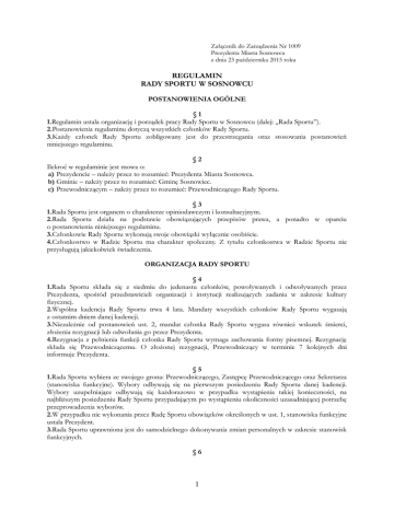 Załącznik do Zarządzenia Nr 1009 Prezydenta Miasta Sosnowca z dnia 23 października 2015 roku REGULAMIN RADY SPORTU W SOSNOWCU POSTANOWIENIA OGÓLNE §1 1.Regulamin ustala organizację i porządek pracy Rady Sportu w Sosnowcu (dalej: „Rada Sportu”). 2.Postanowienia regulaminu dotyczą wszystkich członków Rady Sportu. 3.Każdy członek Rady Sportu zobligowany jest do przestrzegania oraz stosowania postanowień niniejszego regulaminu. §2 Ilekroć w regulaminie jest mowa o: a) Prezydencie – należy przez to rozumieć: Prezydenta Miasta Sosnowca. b) Gminie – należy przez to rozumieć: Gminę Sosnowiec. c) Przewodniczącym – należy przez to rozumieć: Przewodniczącego Rady Sportu. §3 1.Rada Sportu jest organem o charakterze opiniodawczym i konsultacyjnym. 2.Rada Sportu działa na podstawie obowiązujących przepisów prawa, a ponadto w oparciu o postanowienia niniejszego regulaminu. 3.Członkowie Rady Sportu wykonują swoje obowiązki wyłącznie osobiście. 4.Członkostwo w Radzie Sportu ma charakter społeczny. Z tytułu członkostwa w Radzie Sportu nie przysługują jakiekolwiek świadczenia. ORGANIZACJA RADY SPORTU §4 1.Rada Sportu składa się z siedmiu do jedenastu członków, powoływanych i odwoływanych przez Prezydenta, spośród przedstawicieli organizacji i instytucji realizujących zadania w zakresie kultury fizycznej. 2.Wspólna kadencja Rady Sportu trwa 4 lata. Mandaty wszystkich członków Rady Sportu wygasają z ostatnim dniem danej kadencji. 3.Niezależnie od postanowień ust. 2, mandat członka Rady Sportu wygasa również wskutek śmierci, złożenia rezygnacji lub odwołania go przez Prezydenta. 4.Rezygnacja z pełnienia funkcji członka Rady Sportu wymaga zachowania formy pisemnej. Rezygnację składa się Przewodniczącemu. O złożonej rezygnacji, Przewodniczący w terminie 7 kolejnych dni informuje Prezydenta. §5 1.Rada Sportu wybiera ze swojego grona: Przewodniczącego, Zastępcę Przewodniczącego oraz Sekretarza (stanowiska funkcyjne). Wybory odbywają się na pierwszym posiedzeniu Rady Sportu danej kadencji. Wybory uzupełniające odbywają się każdorazowo w przypadku wystąpienia takiej konieczności, na najbliższym posiedzeniu Rady Sportu przypadającym po wystąpieniu okoliczności uzasadniającej potrzebę przeprowadzenia wyborów. 2.W przypadku nie wykonania przez Radę Sportu obowiązków określonych w ust. 1, stanowiska funkcyjne ustala Prezydent. 3.Rada Sportu uprawniona jest do samodzielnego dokonywania zmian personalnych w zakresie stanowisk funkcyjnych. §6 1 1.Posiedzenia Rady Sportu odbywają się w miarę bieżących potrzeb, jednak nie rzadziej niż raz na trzy miesiące. 2.Pierwsze posiedzenie Rady Sportu danej kadencji, powinno odbyć się nie później niż w terminie jednego miesiąca od dnia powołania członków Rady Sportu tej kadencji. Posiedzenie to zwołuje Prezydent lub najstarszy członek Rady Sportu. §7 1.Posiedzenia Rady Sportu zwołuje i prowadzi Przewodniczący. W razie nieobecności Przewodniczącego funkcję tą przejmują kolejno: Zastępca Przewodniczącego, Sekretarz, najstarszy obecny członek Rady Sportu. 2.Posiedzenie Rady Sportu może zostać zwołane na wniosek Prezydenta oraz na wniosek co najmniej 6 członków Rady Sportu. W takim przypadku, Przewodniczący zwołuje posiedzenie nie później niż w terminie kolejnych 14 dni. §8 1.Posiedzenia Rady Sportu zwoływane są według wyboru Przewodniczącego w formie pisemnej, za pośrednictwem poczty elektronicznej, faksu, telefonicznie. 2.Zawiadomienie o zwołaniu posiedzenia Rady Sportu powinno zostać oświadczone członkom Rady Sportu nie później niż na 2 dni przed planowanym terminem posiedzenia. 3.Zawiadomienie o zwołaniu posiedzenia Rady Sportu powinno zawierać informacje o terminie, miejscu oraz proponowany porządek obrad. §9 1.Posiedzenia Rady Sportu prowadzone są w oparciu o przyjęty na początku danego posiedzenia porządek obrad. 2.Ustalony porządek obrad może być w miarę potrzeb zmieniany w toku posiedzenia Rady Sportu. 3.Poszczególne sprawy objęte porządkiem obrad każdorazowo referuje osoba wyznaczona przez Przewodniczącego. § 10 1.Posiedzenia Rady Sportu są protokołowane. Protokolantem jest Sekretarz lub inny członek Rady Sportu wyznaczony przez prowadzącego obrady. 2.Protokoły podlegają zatwierdzeniu na kolejnym posiedzeniu Rady Sportu. PODEJMOWANIE UCHWAŁ § 11 1.Rada Sportu wyraża swoje stanowisko w formie uchwał. 2.Uchwały podejmowane są na posiedzeniach Rady Sportu w głosowaniu jawnym. 3.Uchwały mogą zostać podjęte, jeżeli na posiedzeniu jest obecna co najmniej połowa członków Rady Sportu. 4.Uchwały zapadają zwykłą większością głosów członków Rady Sportu obecnych na posiedzeniu. Przez zwykłą większość głosów rozumie się większą liczbę głosów „za” niż głosów „przeciw”. Przy równej ilości głosów, rozstrzyga głos Przewodniczącego. 5.Każdy członek Rady Sportu dysponuje jednym głosem. ZADANIA RADY SPORTU § 12 Do zadań Rady Sportu należy w szczególności opiniowanie: a) Strategii rozwoju miasta Sosnowca w zakresie kultury fizycznej. b) Projektu budżetu Gminy w części dotyczącej kultury fizycznej. c) Programów rozwoju bazy sportowej na terenie miasta Sosnowca, w tym miejscowych planów zagospodarowania przestrzennego w zakresie dotyczącym terenów wykorzystywanych na cele kultury fizycznej. 2 d) Projektów uchwał Rady Miejskiej w Sosnowcu dotyczących tworzenia warunków sprzyjających rozwojowi sportu. § 13 Przy wykonywaniu obowiązków, członkowie Rady Sportu zobligowani są do zachowania należytej staranności, ze szczególnym uwzględnieniem interesów Gminy w przedmiocie realizacji zadań własnych z zakresu kultury fizycznej i sportu. § 14 1.Rada Sportu corocznie składa Prezydentowi sprawozdanie ze swojej działalności. 2.Sprawozdanie za dany rok kalendarzowy powinno zostać złożone w terminie do dnia 31 marca następnego roku. 3