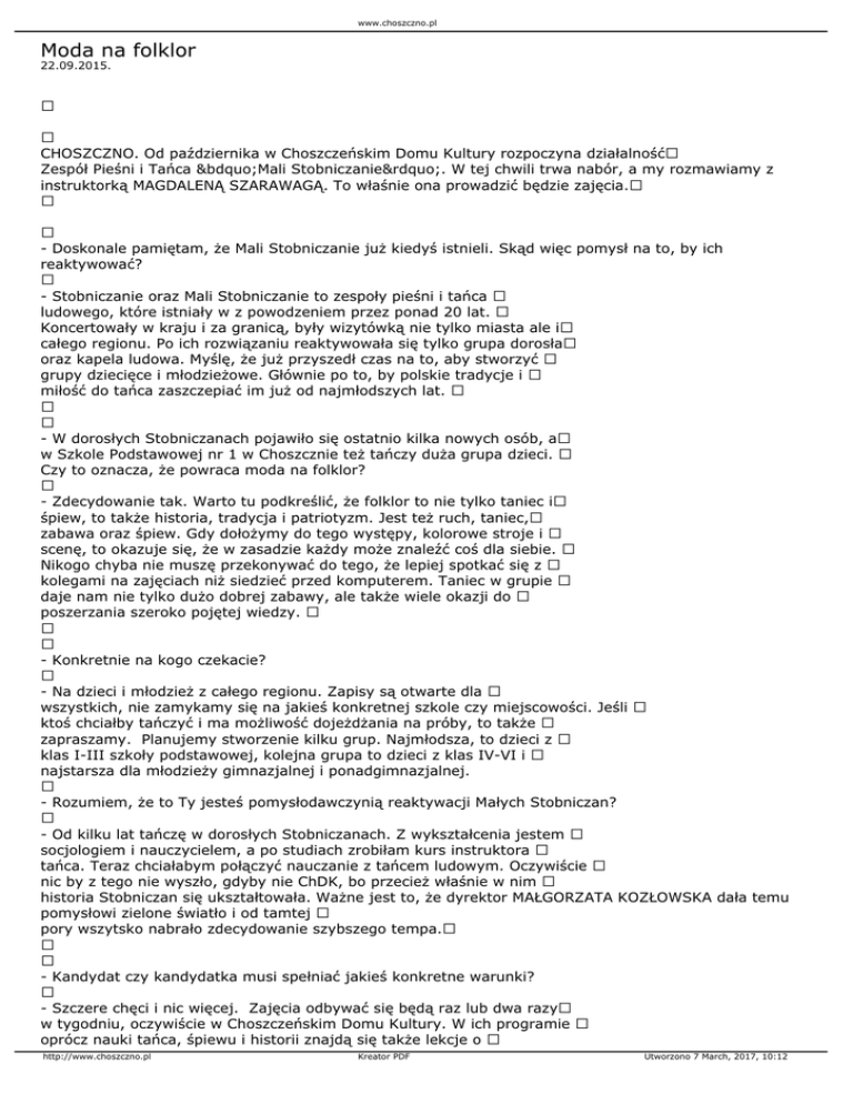 www.choszczno.pl Moda na folklor 22.09.2015. CHOSZCZNO. Od października w Choszczeńskim Domu Kultury rozpoczyna działalność Zespół Pieśni i Tańca „Mali Stobniczanie”. W tej chwili trwa nabór, a my rozmawiamy z instruktorką MAGDALENĄ SZARAWAGĄ. To właśnie ona prowadzić będzie zajęcia. - Doskonale pamiętam, że Mali Stobniczanie już kiedyś istnieli. Skąd więc pomysł na to, by ich reaktywować? - Stobniczanie oraz Mali Stobniczanie to zespoły pieśni i tańca ludowego, które istniały w z powodzeniem przez ponad 20 lat. Koncertowały w kraju i za granicą, były wizytówką nie tylko miasta ale i całego regionu. Po ich rozwiązaniu reaktywowała się tylko grupa dorosła oraz kapela ludowa. Myślę, że już przyszedł czas na to, aby stworzyć grupy dziecięce i młodzieżowe. Głównie po to, by polskie tradycje i miłość do tańca zaszczepiać im już od najmłodszych lat. - W dorosłych Stobniczanach pojawiło się ostatnio kilka nowych osób, a w Szkole Podstawowej nr 1 w Choszcznie też tańczy duża grupa dzieci. Czy to oznacza, że powraca moda na folklor? - Zdecydowanie tak. Warto tu podkreślić, że folklor to nie tylko taniec i śpiew, to także historia, tradycja i patriotyzm. Jest też ruch, taniec, zabawa oraz śpiew. Gdy dołożymy do tego występy, kolorowe stroje i scenę, to okazuje się, że w zasadzie każdy może znaleźć coś dla siebie. Nikogo chyba nie muszę przekonywać do tego, że lepiej spotkać się z kolegami na zajęciach niż siedzieć przed komputerem. Taniec w grupie daje nam nie tylko dużo dobrej zabawy, ale także wiele okazji do poszerzania szeroko pojętej wiedzy. - Konkretnie na kogo czekacie? - Na dzieci i młodzież z całego regionu. Zapisy są otwarte dla wszystkich, nie zamykamy się na jakieś konkretnej szkole czy miejscowości. Jeśli ktoś chciałby tańczyć i ma możliwość dojeżdżania na próby, to także zapraszamy. Planujemy stworzenie kilku grup. Najmłodsza, to dzieci z klas I-III szkoły podstawowej, kolejna grupa to dzieci z klas IV-VI i najstarsza dla młodzieży gimnazjalnej i ponadgimnazjalnej. - Rozumiem, że to Ty jesteś pomysłodawczynią reaktywacji Małych Stobniczan? - Od kilku lat tańczę w dorosłych Stobniczanach. Z wykształcenia jestem socjologiem i nauczycielem, a po studiach zrobiłam kurs instruktora tańca. Teraz chciałabym połączyć nauczanie z tańcem ludowym. Oczywiście nic by z tego nie wyszło, gdyby nie ChDK, bo przecież właśnie w nim historia Stobniczan się ukształtowała. Ważne jest to, że dyrektor MAŁGORZATA KOZŁOWSKA dała temu pomysłowi zielone światło i od tamtej pory wszytsko nabrało zdecydowanie szybszego tempa. - Kandydat czy kandydatka musi spełniać jakieś konkretne warunki? - Szczere chęci i nic więcej. Zajęcia odbywać się będą raz lub dwa razy w tygodniu, oczywiście w Choszczeńskim Domu Kultury. W ich programie oprócz nauki tańca, śpiewu i historii znajdą się także lekcje o http://www.choszczno.pl Kreator PDF Utworzono 7 March, 2017, 10:12 www.choszczno.pl tradycjach kultywowanych w różnych regionach Polski. - W takim układzie co konkretnego trzeba zrobić, by stać się małym stobniczaninem lub małą stobniczanką? - Aby dołączyć do zespołu należy po prostu zadzwonić do mnie (667 558 539) lub do sekretariatu ChDK (95 765 7296), a następnie przyjść na spotkanie organizacyjne, które odbędzie się 28 września o 17.00, w sali klubowej ChDK. Regularne zajęcia rozpoczną się od października. Zapraszam też na facebooka, tam też można polubić: ZPiT Mali Stobniczanie. - Dziękuję. Rozmawiał Tadeusz Krawiec http://www.choszczno.pl Kreator PDF Utworzono 7 March, 2017, 10:12