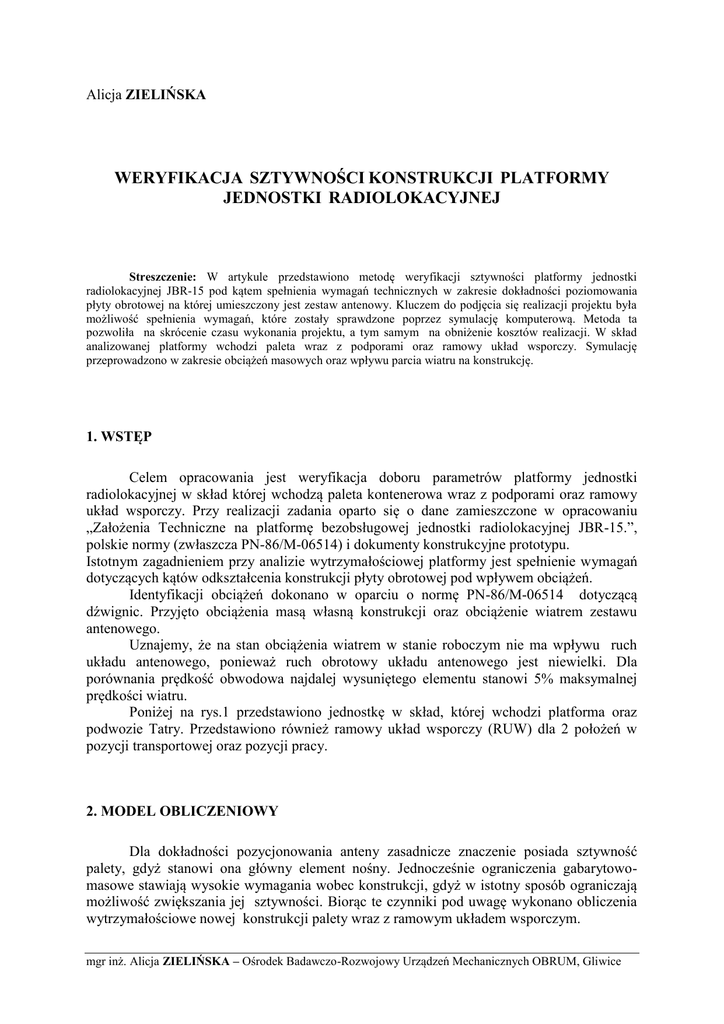 Alicja ZIELIŃSKA WERYFIKACJA SZTYWNOŚCI KONSTRUKCJI PLATFORMY JEDNOSTKI RADIOLOKACYJNEJ Streszczenie: W artykule przedstawiono metodę weryfikacji sztywności platformy jednostki radiolokacyjnej JBR-15 pod kątem spełnienia wymagań technicznych w zakresie dokładności poziomowania płyty obrotowej na której umieszczony jest zestaw antenowy. Kluczem do podjęcia się realizacji projektu była możliwość spełnienia wymagań, które zostały sprawdzone poprzez symulację komputerową. Metoda ta pozwoliła na skrócenie czasu wykonania projektu, a tym samym na obniżenie kosztów realizacji. W skład analizowanej platformy wchodzi paleta wraz z podporami oraz ramowy układ wsporczy. Symulację przeprowadzono w zakresie obciążeń masowych oraz wpływu parcia wiatru na konstrukcję. 1. WSTĘP Celem opracowania jest weryfikacja doboru parametrów platformy jednostki radiolokacyjnej w skład której wchodzą paleta kontenerowa wraz z podporami oraz ramowy układ wsporczy. Przy realizacji zadania oparto się o dane zamieszczone w opracowaniu „Założenia Techniczne na platformę bezobsługowej jednostki radiolokacyjnej JBR-15.”, polskie normy (zwłaszcza PN-86/M-06514) i dokumenty konstrukcyjne prototypu. Istotnym zagadnieniem przy analizie wytrzymałościowej platformy jest spełnienie wymagań dotyczących kątów odkształcenia konstrukcji płyty obrotowej pod wpływem obciążeń. Identyfikacji obciążeń dokonano w oparciu o normę PN-86/M-06514 dotyczącą dźwignic. Przyjęto obciążenia masą własną konstrukcji oraz obciążenie wiatrem zestawu antenowego. Uznajemy, że na stan obciążenia wiatrem w stanie roboczym nie ma wpływu ruch układu antenowego, ponieważ ruch obrotowy układu antenowego jest niewielki. Dla porównania prędkość obwodowa najdalej wysuniętego elementu stanowi 5% maksymalnej prędkości wiatru. Poniżej na rys.1 przedstawiono jednostkę w skład, której wchodzi platforma oraz podwozie Tatry. Przedstawiono również ramowy układ wsporczy (RUW) dla 2 położeń w pozycji transportowej oraz pozycji pracy. 2. MODEL OBLICZENIOWY Dla dokładności pozycjonowania anteny zasadnicze znaczenie posiada sztywność palety, gdyż stanowi ona główny element nośny. Jednocześnie ograniczenia gabarytowomasowe stawiają wysokie wymagania wobec konstrukcji, gdyż w istotny sposób ograniczają możliwość zwiększania jej sztywności. Biorąc te czynniki pod uwagę wykonano obliczenia wytrzymałościowe nowej konstrukcji palety wraz z ramowym układem wsporczym. mgr inż. Alicja ZIELIŃSKA – Ośrodek Badawczo-Rozwojowy Urządzeń Mechanicznych OBRUM, Gliwice Zespół antenowy Płyta obrotowa Kabina podantenowa Ramowy układ wsporczy (RUW) Paleta Rys.1. Model jednostki dla 2 położeń RUW-u. Celem tych obliczeń była analiza odkształceń konstrukcji pod wpływem obciążeń zewnętrznych w pozycji pracy (układ na podporach). Jako metodę analizy wybrano metodę elementów skończonych[2], w jej wariancie przemieszczeniowym. (metodę implementowano w systemie COSMOS/M.). Model platformy wraz z ramowym układem wsporczym powstał w oparciu o szkic koncepcyjny tego układu o parametrach geometrycznych zgodnych z wcześniejszymi analizami. Model obliczeniowy, ze względu na cel obliczeń - określenie maksymalnych możliwych odkształceń, postanowiono wykonać jako statyczny w zakresie liniowym. Wykonano belkowo-powłokowy model platformy wraz z ramowym układem wsporczym [1],[4] . Na tej podstawie powstał model dyskretny składający się z 9332 elementów, w tym 8960 elementów powłokowych (typu: shell3) o sześciu stopniach swobody w węźle i 361 elementów belkowych (typu: beam3D) również o sześciu stopniach swobody w węźle rozpiętych na 4620 węzłach o 27708 stopniach swobody. Elementy podzielono na grupy elementów o określonych własnościach geometrycznych przekroju. Podział na elementy i grupy elementów obrazują poniższe rysunki(Rys.4, Rys.5). .. . . .. .. . . .. .. . . .. .. . .. . Rys.2. Szkic konstrukcji palety. Rys.3. Szkic konstrukcji ramowego układu wsporczego. Rys.4. Podział modelu na elementy skończone (widok ogólny). Rys.5. Podział modelu na elementy skończone /elementy powłokowe/. 3. IDENTYFIKACJA OBCIĄŻEŃ W identyfikacji obciążeń pomocne są wytyczne zawarte w PN-86/M-06514. Wobec braku odpowiedniej normy dla opisywanego urządzenia uznano normę dotyczącą dźwignic za najbliższą prezentowanemu układowi 3.1 Obciążenia masą własną konstrukcji zestawu antenowego Zestaw antenowy charakteryzują następujące wartości masowe: - masa zespołu antenowego mocowanego na kabinie podantenowej ( 1550 kg ), - suma mas kabiny podantenowej , układu chłodzenia, płyty obrotowej , mechanizmów i układów hydraulicznych i elektrycznych ( 2120 kg.) Łączna masa urządzeń podnoszonych przez ramowy układ wsporczy ( 3670 kg.) 3.2 Obciążenie wiatrem Uznano, że na stan obciążenia wiatrem w stanie roboczym nie ma wpływu ruch układu antenowego. Można to uzasadnić następująco : jedynym ruchem roboczym układu jest ruch obrotowy układu antenowego. Prędkość obwodowa najdalej wysuniętego elementu wynosi: v= R gdzie: v - prędkość obwodowa skrajnego elementu , m/s, - maksymalna prędkość obrotowa układu antenowego , rad/s, R - promień obrotu , m (połowa wartości maksymalnej szerokości układu antenowego), Jeśli przyjąć : 1.26 rad/s oraz R=2.1 m wówczas otrzymamy v = 2.64 m/s czyli 9.5 km/h. Stanowi to ok. 5% wartości maksymalnej prędkości wiatru ( 180 km/h) i dlatego prędkość ta została pominięta w tej analizie. Zgodnie z PN-86/M-06514 (pkt. 4.2.3) w stanie spoczynku określono wartość charakterystyczną obciążenia wiatrem dźwignicy lub jej części Ws N zgodnie ze wzorem: Ws CCe Ct qs A gdzie: v2 MPa 1.6 W założeniach technicznych do projektu określono dwa warunki obciążeniem wiatrem: q - jednostka winna posiadać dostateczną wytrzymałość na wiatr o prędkości vw = 