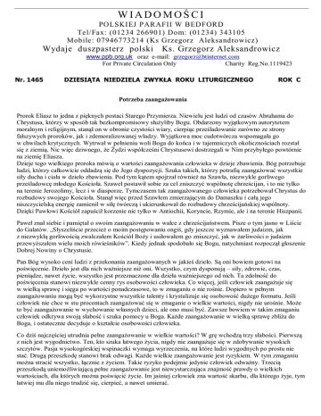 WIADOMOŚCI POLSKIEJ PARAFII W BEDFORD Tel/Fax: (01234 266901) Dom: (01234) 343105 Mobile: 07946773214 (Ks Grzegorz Aleksandrowicz) Wydaje duszpasterz polski Ks. Grzegorz Aleksandrowicz www.ppb.org.uk oraz e-mail: [email protected] For Private Circulation Only Charity Reg.No.1119423 Nr. 1465 DZIESIĄTA NIEDZIELA ZWYKŁA ROKU LITURGICZNEGO ROK C Potrzeba zaangażowania Prorok Eliasz to jedna z pięknych postaci Starego Przymierza. Niewielu jest ludzi od czasów Abrahama do Chrystusa, którzy w sposób tak bezkompromisowy służyliby Bogu. Obdarzony wyjątkowym autorytetem moralnym i religijnym, stanął on w obronie czystości wiary, cierpiąc prześladowanie zarówno ze strony fałszywych proroków, jak i zdemoralizowanej władzy. Wyjątkowa moc cudotwórcza wspomagała go w chwilach krytycznych. Wytrwał w pełnieniu woli Boga do końca i w tajemniczych okolicznościach rozstał się z ziemią. Nic więc dziwnego, że Żydzi współcześni Chrystusowi dostrzegali w Nim przybyłego powtórnie na ziemię Eliasza. Dzieje tego wielkiego proroka mówią o wartości zaangażowania człowieka w dzieje zbawienia. Bóg potrzebuje ludzi, którzy całkowicie oddadzą się do Jego dyspozycji. Szuka takich, którzy potrafią zaangażować wszystkie siły ducha i ciała w dzieło zbawienia. Pod tym kątem spojrzał również na Szawła, niezwykle gorliwego prześladowcę młodego Kościoła. Szaweł postawił sobie za cel zniszczyć wspólnotę chrześcijan, i to nie tylko na terenie Jerozolimy, lecz i w diasporze. Tymczasem tak zaangażowanego człowieka potrzebował Chrystus do rozbudowy swojego Kościoła. Stanął więc przed Szawłem zmierzającym do Damaszku i całą jego niszczycielską energię zamienił w siłę twórczą i ukierunkował do rozbudowy chrześcijańskiej wspólnoty. Dzięki Pawłowi Kościół zapuścił korzenie nie tylko w Antiochii, Koryncie, Rzymie, ale i na terenie Hiszpanii. Paweł znał siebie i pamiętał o swoim zaangażowaniu w walce z chrześcijaństwem. Pisze o tym jasno w Liście do Galatów. „Słyszeliście przecież o moim postępowaniu ongiś, gdy jeszcze wyznawałem judaizm, jak z niezwykłą gorliwością zwalczałem Kościół Boży i usiłowałem go zniszczyć, jak w żarliwości o judaizm przewyższałem wielu moich rówieśników”. Kiedy jednak spodobało się Bogu, natychmiast rozpoczął głoszenie Dobrej Nowiny o Chrystusie. Pan Bóg wysoko ceni ludzi z przekonania zaangażowanych w jakieś dzieło. Są oni bowiem gotowi na poświęcenie. Dzieło jest dla nich ważniejsze niż oni. Wszystko, czym dysponują – siły, zdrowie, czas, pieniądze, nawet życie, wszystko jest przeznaczone dla dzieła ważniejszego od nich. Ta zdolność do poświęcenia stanowi niezwykle cenny rys osobowości człowieka. Co więcej, jeśli człowiek zaangażuje się w wielką sprawę i sięga po wartości ponadczasowe, to w zmaganiu o nie rośnie. Dopiero w pełnym zaangażowaniu mogą być wykorzystne wszystkie talenty i krystalizuje się osobowość dużego formatu. Jeśli człowiek nie chce w stu procentach zaangażować się w zmaganie o wielkie wartości, nigdy nie urośnie. Może to być zaangażowanie w wychowanie własnych dzieci, ale ono musi być. Zawsze bowiem w takim zmaganiu człowiek odkrywa swoją słabość i szuka pomocy u Boga. Każde zaangażowanie w wielką sprawę zbliża do Boga, i ostatecznie decyduje o kształcie osobowości człowieka. Co dziś najczęściej utrudnia pełne zaangażowanie w wielkie wartości? W grę wchodzą trzy słabości. Pierwszą z nich jest wygodnictwo. Ten, kto szuka łatwego życia, nigdy nie zaangażuje się w zdobywanie wysokich szczytów. Pasja wysokogórskiej wspinaczki wymaga wyrzeczenia, na które ludzi wygodnych po prostu nie stać. Drugą przeszkodę stanowi brak odwagi. Każde wielkie zaangażowanie jest ryzykiem. W tym zmaganiu można stracić wszystko, łącznie z życiem. Takie ryzyko podejmie jedynie człowiek odważny. Trzecią przeszkodą uniemożliwiającą pełne zaangażowanie jest niewystarczająca znajmość prawdy o wielkich wartościach, dla których można poświęcić życie. Im jaśniej człowiek zna wartość skarbu, dla którego żyje, tym łatwiej mu dla niego trudzić się, cierpieć, a nawet umierać. DZIESIĄTA NIEDZIELA ZWYKŁA ROKU LITURGICZNEGO Rok C za ś.p.Mieczysława Wodeckiego i jego rodziców w rocz.śmierci–int rodzWodeckichO za dusze ś.p.braci Władysława, Feliksa i Wacława Stankiewiczów–int.P.J.Szyszko - ADORACJA NAJŚWIĘTSZEGO SAKRAMENTU. O błogosławieństwo Boże dla Renaty i Simon Bianchi z ok. 3-ej rocznicy ślubu i błogosławieństwo Boże dla córki Francesca. Poniedziałek,6.6.20 Godz. 9.30 za dusze ś.p.Vasyla Sverdelean – int. żony z rodziną. Godz.19.00-Intencja wolna. Wtorek, 7.6.2016 Godz. 9.30 - Intencja wolna. Środa, 8.6.2016 Godz.19.00 - Intencja wolna. Niedziela,5.6.2016 Godz. 9.30 Godz.11.00 Godz.18.00 Godz.19.00 Czwartek,9.6.2016 Piątek, 10.6.2016 Godz. 9.30 - za dusze ś.p.Stanisława Buźniak w rocznicę śmierci - int. córki z rodziną. Godz. 15.00 Intencja wolna. Koronka do Miłosierdzia Bożego. Godz.19.00 – Intencja wolna Sobota, 11.6.2016 Godz. 9.30 - Intencja wolna. Adoracja Najświętszego Sakramentu. Spowiedź święta. Godz. 19.00 - za dusze ś.p.Grażyny Grzejszczyk w 3-cią rocznicę śmierci – int. córki z rodziną. Niedziela, 12.6.2016 Godz. 9.30 Godz.10.45 Godz.19.00 Poniedziałek, 13.6.2016 Godz. 9.30 JEDENASTA NIEDZIELA ZWYKŁA ROKU LITURGICZNEGO Rok C - O błog. Boże dla Anny i Michała Słabosz z okazji 5-ej rocznicy ślubu. W int.Krystiana z ok.urodzin z prośbą o błog.Boże i opieke Matki Bożej–int. rodziny - za dusze ś.p. Jadwigi i Augustyna Rekowskich - int. corki z rodziną. - Intencja wolna. Godz.19.00 - Intencja wolna Godz. 9.30.00 - za dusze ś.p. Marii Mazur i za zmarłych z rodziny - int. córki. Godz.19.00 Intencja wolna Koronka do Miłosierdzia Bożego. Godz.19.00 – Intencja wolna. Godz. 9.30 - In