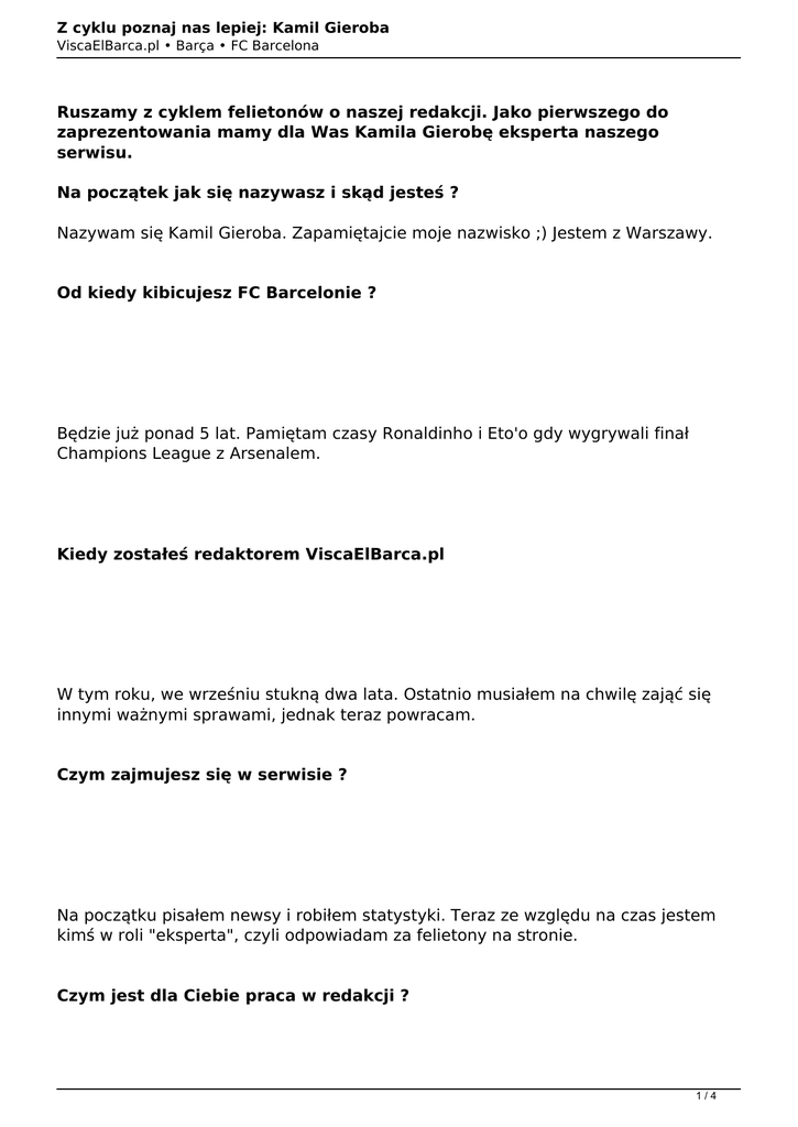 Z cyklu poznaj nas lepiej: Kamil Gieroba ViscaElBarca.pl • Barça • FC Barcelona Ruszamy z cyklem felietonów o naszej redakcji. Jako pierwszego do zaprezentowania mamy dla Was Kamila Gierobę eksperta naszego serwisu. Na początek jak się nazywasz i skąd jesteś ? Nazywam się Kamil Gieroba. Zapamiętajcie moje nazwisko ;) Jestem z Warszawy. Od kiedy kibicujesz FC Barcelonie ? Będzie już ponad 5 lat. Pamiętam czasy Ronaldinho i Eto'o gdy wygrywali finał Champions League z Arsenalem. Kiedy zostałeś redaktorem ViscaElBarca.pl W tym roku, we wrześniu stukną dwa lata. Ostatnio musiałem na chwilę zająć się innymi ważnymi sprawami, jednak teraz powracam. Czym zajmujesz się w serwisie ? Na początku pisałem newsy i robiłem statystyki. Teraz ze względu na czas jestem kimś w roli "eksperta", czyli odpowiadam za felietony na stronie. Czym jest dla Ciebie praca w redakcji ? 1/4 Z cyklu poznaj nas lepiej: Kamil Gieroba ViscaElBarca.pl • Barça • FC Barcelona Zbieraniem doświadczenia. Jak dogadujesz się z resztą zespołu redakcyjnego ? Bez większych problemów. Czy jesteś zadowolony z rozwoju serwisu ? Powiem krótko - tak ;) Jaki jest twój najlepszy zawodnik Blaugrany? Oczywiście Leo Messi! Jaka inna odpowiedź mogła paść? :) Ale robią na mnie jeszcze duże wrażenie od kilku lat Xavi i Iniesta. Czy według Ciebie Tito poradzi sobie prowadząc Barcelonę ? 2/4 Z cyklu poznaj nas lepiej: Kamil Gieroba ViscaElBarca.pl • Barça • FC Barcelona Ja wolałbym postawić na bardziej doświadczonego trenera. Zarząd chyba liczy, że Tito jak Guardiola wrzuci jakiejś świeżości i nie będzie się bał niczego. Ja jednak uważam, że Barcelona niewiele się zmieni, bo Tito w dużej mierze będzie stawiał na styl Pepa, a gdy tylko brakuje nam kogoś do wykańczania akcji to ten styl zawodzi. Udowodniła to po części reprezentacja Hiszpanii oparta na stylu Blaugrany. Ich football totalnie nudził, zagrali poniżej poziomu obrońców tytułu. Dodatkowo nie było Villi, przez co brakowało skuteczności. Udał się im tylko jeden mecz, a dokładnie finał, gdzie też mieli zresztą trochę szczęścia ze względu na wydarzenia na boisku. Jak oceniasz ruch transferowy z Jordim Albą ? Jeżeli będzie grał tak jak na EURO to uważam to za genialne posunięcie. To trochę jak z transferem Pique i Fabregasa i ich powroty do Barcy. Jeżeli tylko ma ten "kod Barcelony" i idealnie zintegruje się z zespołem to może być jeszcze lepszy od Abidala. Czy potrzebne są jeszcze transfery ? Potrzebny jest nam napastnik. Mamy Messiego, Pedro i Villę, ale gdy tylko zabrakło tego ostatniego nie mieliśmy takiej siły w ofensywie. Real to bezwzględnie wykorzystał odbierając nam tytuł. Mamy co prawda Cuencę, Tello i Sancheza. Ale Alexis bardziej nadaje się dla mnie na pomocnika, a Cuenca i Tello mają jeszcze zbyt mało doświadczenia. Dodatkowo wciąż nie wiadomo kiedy wróci Villa i czy będzie w optymalnej formie. A sezon ligowy w porównaniu z EURO to już nie są przelewki. Hiszpanie mieli szczęście, bo gdyby Mistrzostwa trwały około 9/10 miesięcy tak jak Primera Division (plus Liga Mistrzów i Copa del Rey), a nie miesiąc to pewnie padli by z sił i nie wygrali EURO, albo po prostu skończyłoby się ich szczęście i przestaliby strzelać bramki, lub nie byłoby komu. Media spekulują chociażby o transferze Javiego Martineza, ale po co nam kolejni pomocnicy, którzy nie mieściliby się nawet w składzie? Wolę już stawiać na wychowanków: Sergi Roberto czy Thiago Alcantarę. 3/4 Z cyklu poznaj nas lepiej: Kamil Gieroba ViscaElBarca.pl • Barça • FC Barcelona Do czego chcesz zachęcić gości naszego serwisu i również naszych użytkowników ? Do zapraszania znajomych, częstego "wbijania" na stronę i komentowania newsów...oraz do śledzenia wpisów redaktorów i głównego fanpage'a na facebooku ;) Pozdrawiam Kamil Gieroba dla naszego serwisu załatwia wywiady ze znanymi postaciami dziennikarstwa. Najczęściej są to wypowiedzi Michała Pola, który będzie dla nas przesyłał kolejne ciekawe wywiady. Pamiętacie ? Autor: Patryk Białogłowski 4/4 Powered by TCPDF (www.tcpdf.org)