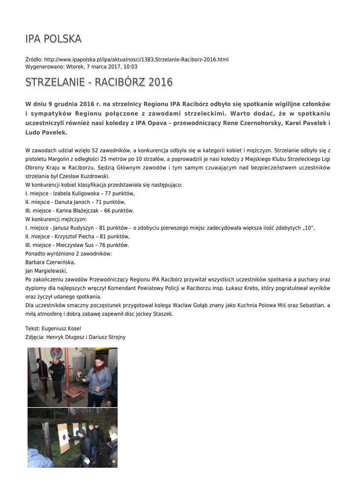IPA POLSKA Źródło: http://www.ipapolska.pl/ipa/aktualnosci/1383,Strzelanie-Raciborz-2016.html Wygenerowano: Wtorek, 7 marca 2017, 10:03 STRZELANIE - RACIBÓRZ 2016 W dniu 9 grudnia 2016 r. na strzelnicy Regionu IPA Racibórz odbyło się spotkanie wigilijne członków i sympatyków Regionu połączone z zawodami strzeleckimi. Warto dodać, że w spotkaniu uczestniczyli również nasi koledzy z IPA Opava – przewodniczący Rene Czernohorsky, Karel Pavelek i Ludo Pavelek. W zawodach udział wzięło 52 zawodników, a konkurencja odbyła się w kategorii kobiet i mężczyzn. Strzelanie odbyło się z pistoletu Margolin z odległości 25 metrów po 10 strzałów, a poprowadzili je nasi koledzy z Miejskiego Klubu Strzeleckiego Ligi Obrony Kraju w Raciborzu. Sędzią Głównym zawodów i tym samym czuwającym nad bezpieczeństwem uczestników strzelania był Czesław Kuzdrowski. W konkurencji kobiet klasyfikacja przedstawiała się następująco: I. miejsce - Izabela Kuligowska – 77 punktów, II. miejsce - Danuta Janoch – 71 punktów, III. miejsce - Karina Błażejczak – 66 punktów. W konkurencji mężczyzn: I. miejsce - Janusz Rudyszyn – 81 punktów – o zdobyciu pierwszego miejsc zadecydowała większa ilość zdobytych „10”, II. miejsce - Krzysztof Piecha – 81 punktów, III. miejsce - Mieczysław Sus – 76 punktów. Ponadto wyróżniono 2 zawodników: Barbara Czerwińska, Jan Margielewski, Po zakończeniu zawodów Przewodniczący Regionu IPA Racibórz przywitał wszystkich uczestników spotkania a puchary oraz dyplomy dla najlepszych wręczył Komendant Powiatowy Policji w Raciborzu insp. Łukasz Krebs, który pogratulował wyników oraz życzył udanego spotkania. Dla uczestników smaczny poczęstunek przygotował kolega Wacław Gołąb znany jako Kuchnia Polowa Miś oraz Sebastian, a miłą atmosferę i dobrą zabawę zapewnił disc jockey Staszek. Tekst: Eugeniusz Kosel Zdjęcia: Henryk Długosz i Dariusz Strojny Ocena: 0/5 (0) Tweetnij