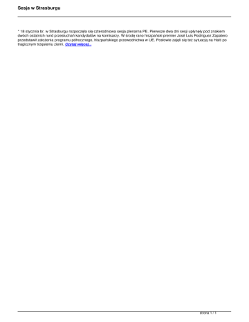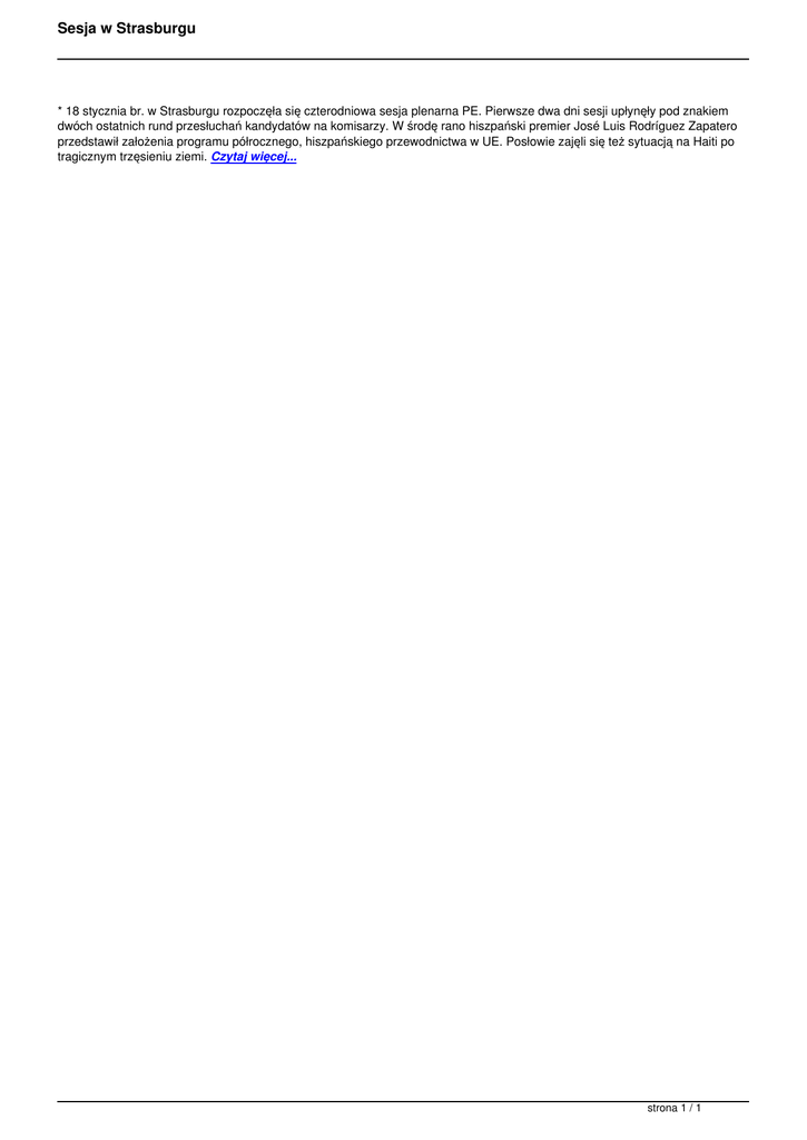 Sesja w Strasburgu * 18 stycznia br. w Strasburgu rozpoczęła się czterodniowa sesja plenarna PE. Pierwsze dwa dni sesji upłynęły pod znakiem dwóch ostatnich rund przesłuchań kandydatów na komisarzy. W środę rano hiszpański premier José Luis Rodríguez Zapatero przedstawił założenia programu półrocznego, hiszpańskiego przewodnictwa w UE. Posłowie zajęli się też sytuacją na Haiti po tragicznym trzęsieniu ziemi. Czytaj więcej... strona 1 / 1