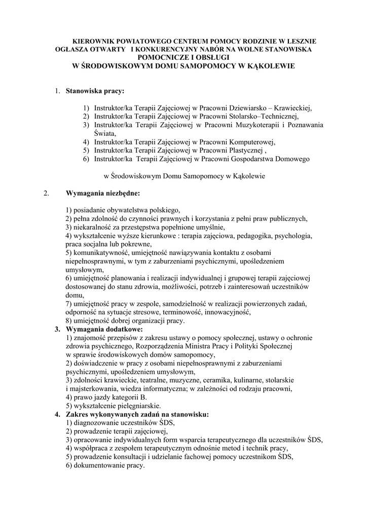 KIEROWNIK POWIATOWEGO CENTRUM POMOCY RODZINIE W LESZNIE OGŁASZA OTWARTY I KONKURENCYJNY NABÓR NA WOLNE STANOWISKA POMOCNICZE I OBSŁUGI W ŚRODOWISKOWYM DOMU SAMOPOMOCY W KĄKOLEWIE 1. Stanowiska pracy: 1) Instruktor/ka Terapii Zajęciowej w Pracowni Dziewiarsko – Krawieckiej, 2) Instruktor/ka Terapii Zajęciowej w Pracowni Stolarsko–Technicznej, 3) Instruktor/ka Terapii Zajęciowej w Pracowni Muzykoterapii i Poznawania Świata, 4) Instruktor/ka Terapii Zajęciowej w Pracowni Komputerowej, 5) Instruktor/ka Terapii Zajęciowej w Pracowni Plastycznej , 6) Instruktor/ka Terapii Zajęciowej w Pracowni Gospodarstwa Domowego w Środowiskowym Domu Samopomocy w Kąkolewie 2. Wymagania niezbędne: 1) posiadanie obywatelstwa polskiego, 2) pełna zdolność do czynności prawnych i korzystania z pełni praw publicznych, 3) niekaralność za przestępstwa popełnione umyślnie, 4) wykształcenie wyŜsze kierunkowe : terapia zajęciowa, pedagogika, psychologia, praca socjalna lub pokrewne, 5) komunikatywność, umiejętność nawiązywania kontaktu z osobami niepełnosprawnymi, w tym z zaburzeniami psychicznymi, upośledzeniem umysłowym, 6) umiejętność planowania i realizacji indywidualnej i grupowej terapii zajęciowej dostosowanej do stanu zdrowia, moŜliwości, potrzeb i zainteresowań uczestników domu, 7) umiejętność pracy w zespole, samodzielność w realizacji powierzonych zadań, odporność na sytuacje stresowe, terminowość, innowacyjność, 8) umiejętność dobrej organizacji pracy. 3. Wymagania dodatkowe: 1) znajomość przepisów z zakresu ustawy o pomocy społecznej, ustawy o ochronie zdrowia psychicznego, Rozporządzenia Ministra Pracy i Polityki Społecznej w sprawie środowiskowych domów samopomocy, 2) doświadczenie w pracy z osobami niepełnosprawnymi z zaburzeniami psychicznymi, upośledzeniem umysłowym, 3) zdolności krawieckie, teatralne, muzyczne, ceramika, kulinarne, stolarskie i majsterkowania, wiedza informatyczna; w zaleŜności od rodzaju pracowni, 4) prawo jazdy kategorii B. 5) wykształcenie pielęgniarskie. 4. Zakres wykonywanych zadań na stanowisku: 1) diagnozowanie uczestników ŚDS, 2) prowadzenie terapii zajęciowej, 3) opracowanie indywidualnych form wsparcia terapeutycznego dla uczestników ŚDS, 4) współpraca z zespołem terapeutycznym odnośnie metod i technik pracy, 5) prowadzenie konsultacji i udzielanie fachowej pomocy uczestnikom ŚDS, 6) dokumentowanie pracy. 5. Wymagane dokumenty: 1) list motywacyjny, 2) CV z dokładnym opisem przebiegu pracy zawodowej, 3) oryginał kwestionariusza osobowego, 4) kserokopie świadectw pracy, 5) kserokopie dokumentów potwierdzające kwalifikacje i wykształcenie zawodowe, 6) oświadczenie o niekaralności. 6. Warunki pracy: 1. Środowiskowy Dom Samopomocy w Kąkolewie rozpocznie działalność z dniem 1 stycznia 2013 r., zatrudnienie nastąpi w pierwszym kwartale 2013 r. 2. Sposób zatrudnienia - umowa o pracę; 3. Miejsce pracy – Środowiskowy Dom Samopomocy w Kąkolewie, ul. Krzywińska 10A. 7. Termin i miejsce składania dokumentów: Wymagane dokumenty aplikacyjne naleŜy składać osobiście w Powiatowym Centrum Pomocy Rodzinie w w Lesznie, p nr.7 bądź pocztą na adres: Powiatowe Centrum Pomocy Rodzinie PL. Kościuszki 4B 64-100 Leszno w zamkniętej kopercie z dopiskiem: „Dotyczy naboru na stanowisko Instruktorke/a Terapii Zajęciowej w Środowiskowym Domu Samopomocy w Kąkolewie ”, w terminie do 2 stycznia 2013 r., do godz. 14:00. Aplikacje, które wpłyną do Powiatowego Centrum pomocy Rodzinie w Lesznie po wyŜej określonym terminie nie będą rozpatrywane. Informacje o wyniku naboru będzie umieszczone na stronie internetowej Biuletynu Informacji Publicznej Starostwa Powiatowego www.bip.powiat-leszczynski.pl www.pcprleszno.pl oraz na tablicy informacyjnej urzędu. 8. Inne informacje: Dla oceny aplikacji zostanie powołana komisja, która moŜe zaprosić kandydatów na rozmowę kwalifikacyjną. O terminie rozmowy kwalifikacyjnej kandydaci zostaną poinformowani telefoniczne. Oferty osób nie zakwalifikowanych zostaną komisyjnie zniszczone. Osoby, których oferty zostaną odrzucone, nie będą powiadamiane. Wymagane dokumenty aplikacyjne powinny być opatrzone klauzulą: „WyraŜam zgodę na przetwarzanie moich danych osobowych zawartych w naborze dla potrzeb niezbędnych do realizacji procesu rekrutacji, zgodnie z ustawą z dnia 29. 08. 1997 r. o ochronie danych osobowych (Dz. U. z 2002 r. Nr 101, poz. 926 z późn. zm.) oraz z ustawą z dnia 21.11.2008 r. o pracownikach samorządowych (Dz. U. Nr 223, poz. 1458 z poŜn.zm.)”. PowyŜsza klauzula musi być dodatkowo opatrzona własnoręcznym podpisem. Leszno, dnia 21.12.2012 r.