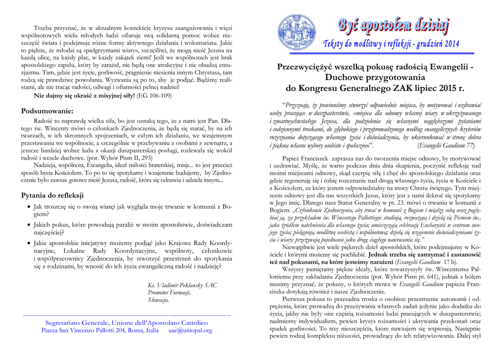 Trzeba przyznać, że w aktualnym kontekście kryzysu zaangażowania i więzi wspólnotowych wielu młodych ludzi ofiaruje swą solidarną pomoc wobec nieszczęść świata i podejmuje różne formy aktywnego działania i wolontariatu. Jakie to piękne, że młodzi są «pielgrzymami wiary», szczęśliwi, że mogą nieść Jezusa na każdą ulicę, na każdy plac, w każdy zakątek ziemi! Jeśli we wspólnotach jest brak apostolskiego zapału, który by zarażał, nie będą one atrakcyjne i nie obudzą entuzjazmu. Tam, gdzie jest życie, gorliwość, pragnienie niesienia innym Chrystusa, tam rodzą się prawdziwe powołania. Wyzwania są po to, aby je podjąć. Bądźmy realistami, ale nie tracąc radości, odwagi i ofiarności pełnej nadziei! Nie dajmy się okraść z misyjnej siły! (EG 106-109) Podsumowanie: Radość to naprawdę wielka siła, bo jest oznaką tego, że z nami jest Pan. Dlatego św. Wincenty mówi o członkach Zjednoczenia, że będą się starać, by na ich twarzach, w ich skromnych spojrzeniach, w całym ich działaniu, we wzajemnym przestawaniu we wspólnocie, a szczególnie w przebywaniu z osobami z zewnątrz, a jeszcze bardziej wobec ludu z okazji duszpasterskiej posługi, rozlewała się wokół radość i wesele duchowe. (por. Wybór Pism II, 293) Nadzieja, wspólnota, Ewangelia, ideał miłości braterskiej, misje... to jest przecież sposób bycia Kościołem. To po to się spotykamy i wzajemnie budujemy, by Zjednoczenie było zawsze gotowe nieść Jezusa, radość, która się odnawia i udziela innym... Pytania do refleksji Jak troszczę się o swoją wiaręi jak wygląda moje trwanie w komunii z Bogiem? Jakich pokus, które powodują paraliż w moim apostolstwie, doświadczam najczęściej? Jakie apostolskie inicjatywy możemy podjąć jako Krajowe Rady Koordynacyjne, Lokalne Rady Koordynacyjne, wspólnoty, członkowie i współpracownicy Zjednoczenia, by stworzyć przestrzeń do spotykania się z rodzinami, by wnosić do ich życia ewangeliczną radość i nadzieję? Ks. Vladimir Peklansky SAC Promotor Formacji, Słowacja. --------------------------------------------------------------------------------Segretariato Generale, Unione dell’Apostolato Cattolico Piazza San Vincenzo Pallotti 204, Roma, Italia [email protected] e Przezwyciężyć wszelką pokusę radością Ewangelii - Duchowe przygotowania do Kongresu Generalnego ZAK lipiec 2015 r. “Przyznaję, że powinniśmy stworzyć odpowiednie miejsca, by motywować i uzdrawiać osoby pracujące w duszpasterstwie, «miejsca dla odnowy własnej wiary w ukrzyżowanego i zmartwychwstałego Jezusa, dla podzielenia się własnymi najgłębszymi pytaniami i codziennymi troskami, do głębokiego i przeprowadzonego według ewangelicznych kryteriów rozeznania dotyczącego własnego życia i doświadczenia, by ukierunkować w stronę dobra i piękna własne wybory osobiste i społeczne»”. (Evangelii Gaudium 77) Papież Franciszek zaprasza nas do tworzenia miejsc odnowy, by motywować i uzdrawiać. Myślę, że warto podczas dnia dnia skupienia, poczynić refleksję nad moimi miejscami odnowy, skąd czerpię siłę i chęć do apostolskiego działania oraz gdzie regeneruję się i robię rozeznanie nad drogą własnego życia, życia w Kościele i z Kościołem, za który jestem odpowiedzialny na mocy Chrztu świętego. Tym miejscem odnowy jest dla nas wszystkich Jezus, który jest z nami ilekroć się spotykamy w Jego imię. Dlatego nasz Statut Generalny w pt. 23. mówi o trwaniu w komunii z Bogiem. „Członkowie Zjednoczenia, aby trwać w komunii z Bogiem i między sobą oraz pogłębiać ją, za przykładem św. Wincentego Pallottiego: studiują, rozważają i dzielą się Pismem św., jako źródłem natchnienia dla własnego życia; umieszczają celebrację Eucharystii w centrum swojego życia; pielęgnują modlitwę osobistą i wspólnotową; dzielą się wzajemnie doświadczeniami życia i wiary; przeżywają pojednanie jako drogę ciągłego nawracania się.” Niewątpliwie jest wiele pięknych dzieł apostolskich, które podejmujemy w Kościele i którymi możemy się pochlubić. Jednak trzeba się zatrzymać i zastanowić też nad pokusami, na które jesteśmy narażeni (Evangelii Gaudium 17 b). Wszyscy pamiętamy piękne ideały, które towarzyszyły św. Wincentemu Pallottiemu przy zakładaniu Zjednoczenia (por. Wybór Pism pt. 641), jednak z bólem musimy przyznać, że pokusy, o których mowa w Evangelii Gaudium papieża Franciszka dotykają również i nasze Zjednoczenie. Pierwsza pokusa to przesadna troska o osobiste przestrzenie autonomii i odprężenia, które prowadzą do przeżywania własnych zadań jedynie jako dodatku do życia, jakby nie były one częścią tożsamości ludzi pracujących w duszpasterstwie; nadmierny indywidualizm, pewien kryzys tożsamości i ukrywania przekonań oraz spadek gorliwości. To trzy nieszczęścia, które nawzajem się wspierają. Następnie pewien rodzaj kompleksu niższości, prowadzący do ich relatywizowania. Dalej styl życia prowadzący do zapewnienia sobie bezpieczeństwa materialnego, do zdobywania władzy i ludzkiej chwały osiąganych za wszelką cenę, zamiast misji dawania życia za innych . W ten sposób zadanie ewangelizacji jest prowadzone na siłę i poświęcają mu niewielki wysiłek i ograniczony czas. Nie pozwólmy okradać sięz misyjnego entuzjazmu! (EG 78-80) Św. Wincenty bardzo pragnął wypełniać przykazanie miłości, które by się niczym nie ograniczało. By wszyscy mogli poznać i pokochać Chrystusa. Dlatego ta miłość, którą kochamy Jezusa nie może być moją tajemnicą ukrytą przed oczami świata, moją prywatną sprawą, która nie pozwala dzielić się z tymi, którzy Go nie znają. Wielu z nas boi się, że ktoś zaprosi ich do podjęcia zadania apostolskiego, więc staramy się uciec od wszelkiego zaangażowania, które mogłoby pozbawić nas wolnego czasu, obsesyjnie zatroskani o swój wolny czas, tak jakby