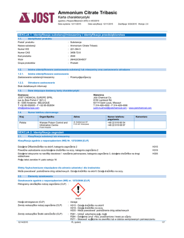 Ammonium Citrate Tribasic Karta charakterystyki zgodnie z Rozporządzeniem (W E) nr 453/2010 Data wydania: 12/11/2015 Data weryfikacji: 12/11/2015 Zastępuje: 9/24/2015 Wersja: 2.0 SEKCJA 1: Identyfikacja substancji/mieszaniny i identyfikacja przedsiębiorstwa 1.1. Identyfikator produktu Postać produktu : Substancja Nazwa substancji : Ammonium Citrate Tribasic Numer WE : 221-394-5 Numer CAS : 3458-72-8 Kod produktu : 2040 Wzór : (NH4)3C6H5O7 Grupa produktów : Produkt 1.2. Istotne zidentyfikowane zastosowania substancji lub mieszaniny oraz zastosowania odradzane 1.2.1. Istotne zidentyfikowane zastosowania Zastosowanie substancji/mieszaniny 1.2.2. : Przemysł spożywczy Odradzane zastosowanie Brak dodatkowych inform acji 1.3. Dane dotyczące dostawcy karty charakterystyki Dostawca JOST CHEMICAL EUROPE SPRL rue du Bois Portal n° 30/1-3 B - 5300 Andenne - BELGIQUE T +32 85-552655 - F +32 85-552654 [email protected] 1.4. Wytwórca Jost Chemical Co. 8150 Lackland Rd. 63114 Saint Louis, Missouri T 314-428-4300 - F 314-428-4366 [email protected] - www.jostchemical.com Numer telefonu alarmowego Kraj Organ/Spółka Adres Polska Warsaw Poison Control and Information Centre Al. Solidarnosci 67 P-03 401 Warszawa Numer telefonu pogotowia +48 22 619 66 54 +48 22 619 08 97 Komentarz Praski Hospital SEKCJA 2: Identyfikacja zagrożeń 2.1. Klasyfikacja substancji lub mieszaniny Klasyfikacja zgodnie z rozporządzeniem (WE) Nr. 1272/2008 [CLP]Mieszanina/Substancja: Karta SDS UE 2015: Zgodnie z Rozporządzeniem (UE) 2015/830 (Załącznik II Rozporządzenia REACH) Działanie żrące/drażniące na skórę, kategoria zagrożenia 2 H315 Poważne uszkodzenie oczu/działanie drażniące na oczy, kategoria zagrożenia 2 H319 Działanie toksycznie na narządy docelowe – narażenie jednorazowe, kategoria zagrożenia 3, działanie drażniące na drogi oddechowe H335 Pełny tekst zwrotów H: patrz sekcja 16 Efekty fizykochemiczne niepożądane dla zdrowia człowieka i dla środowiska Może powodować podrażnienie dróg oddechowych. Działa drażniąco na skórę. Działa drażniąco na oczy. 2.2. Elementy oznakowania Oznakowanie zgodnie z rozporządzeniem (WE) nr. 1272/2008 [CLP] Extra labelling to displayExtra classification(s) to display Piktogramy określające rodzaj zagrożenia (CLP) : GHS07 Hasło ostrzegawcze (CLP) : Uwaga Zwroty wskazujące rodzaj zagrożenia (CLP) : H315 - Działa drażniąco na skórę H319 - Działa drażniąco na oczy H335 - Może powodować podrażnienie dróg oddechowych Zwroty wskazujące środki ostrożności (CLP) : P261 - Unikać wdychania pyłu, mgły P264 - Dokładnie umyć ręce, przedramiona i twarz po użyciu P271 - Stosować wyłącznie na zewnątrz lub w dobrze wentylowanym pomieszczeniu 12/14/2015 PL (polski) 1/7 Ammonium Citrate Tribasic Karta charakterystyki zgodnie z Rozporządzeniem (WE) nr 453/2010 P280 - Stosować rękawice ochronne, odzież ochronną, maski na twarz, ochronę twarzy, ochronę oczu P302+P352 - W PRZYPADKU KONTAKTU ZE SKÓRĄ: Umyć dużą ilością wody z mydłem P304+P340 - W PRZYPADKU DOSTANIA SIĘ DO DRÓG ODDECHOWYCH: wyprowadzić lub wynieść poszkodowanego na świeże powietrze i zapewnić warunki do odpoczynku w pozycji umożliwiającej swobodne oddychanie P305+P351+P338 - W PRZYPADKU DOSTANIA SIĘ DO OCZU: Ostrożnie płukać wodą przez kilka minut. Wyjąć soczewki kontaktowe, jeżeli są i można je łatwo usunąć. Nadal płukać P312 - W przypadku złego samopoczucia skontaktować się z OŚRODKIEM ZATRUĆ lub z lekarzem P332+P313 - W przypadku wystąpienia podrażnienia skóry: Zasięgnąć porady/zgłosić się pod opiekę lekarza P337+P313 - W przypadku utrzymywania się działania drażniącego na oczy: Zasięgnąć porady/zgłosić się pod opiekę lekarza P362+P364 - Zanieczyszczoną odzież zdjąć i wyprać przed ponownym użyciem P403+P233 - Przechowywać w dobrze wentylowanym miejscu. Przechowywać pojemnik szczelnie zamknięty P405 - Przechowywać pod zamknięciem P501 - Zawartość/pojemnik usuwać do upoważnionego zakładu usuwania odpadów 2.3. Inne zagrożenia Brak dodatkowych inform acji SEKCJA 3: Skład/informacja o składnikach 3.1. Substancja Rodzaj substancji : Jednoskładnikowa Nazwa Identyfikator produktu % Ammonium Citrate Tribasic (Numer CAS) 3458-72-8 (Numer WE) 221-394-5 100 Pełne brzmienie zwrotów H: patrz sekcja 16. 3.2. Mieszanina Nie dotyczy SEKCJA 4: Środki pierwszej pomocy 4.1. Opis środków pierwszej pomocy Pierwsza pomoc - środki ogólnie : W przypadku złego samopoczucia skontaktować się z ośrodkiem zatruć lub z lekarzem. Pierwsza pomoc - środki po zainhalowaniu : Wyprowadzić lub wynieść poszkodowanego na świeże powietrze i zapewnić mu warunki do swobodnego oddychania. W przypadku wystąpienia objawów ze strony układu oddechowego: Consult a doctor. W przypadku złego samopoczucia skontaktować się z ośrodkiem zatruć lub z lekarzem. Pierwsza pomoc - środki po kontakcie ze skórą : Zdjąć natychmiast zanieczyszczoną odzież lub obuwie. Płukać skórę dużą ilością wody. Zdjąć zanieczyszczoną odzież. W przypadku wystąpienia podrażnienia skóry: Zasięgnąć porady/zgłosić się pod opiekę lekarza. Pierwsza pomoc - środki po kontakcie z oczami : Natychmiast wypłukać dużą ilością wody. Wyjąć soczewki kontaktowe, jeżeli są i można je łatwo usunąć. Nadal płukać. W przypadku utrzymywania się działania drażniącego na oczy: Zasięgnąć porady/zgłosić się pod opiekę lekarza. Pierwsza pomoc - środki po połknięciu : Jeżeli poszkodowany jest w pełni przytomny, podawać dużo wody do picia. Niczego nie podawać do picia, jeżeli poszkodowany jest nieprzytomny. W pełni przytomna ofiara: natychmiast wywołać wymioty. Przy połknięciu dużych ilości: natychmiast do szpitala. W przypadku złego samopoczucia skontaktować się z ośrodkiem zatruć lub z lekarzem. 4.2. Najważniejsze ostre i opóźnione objawy oraz skutki narażenia Symptomy/uraz