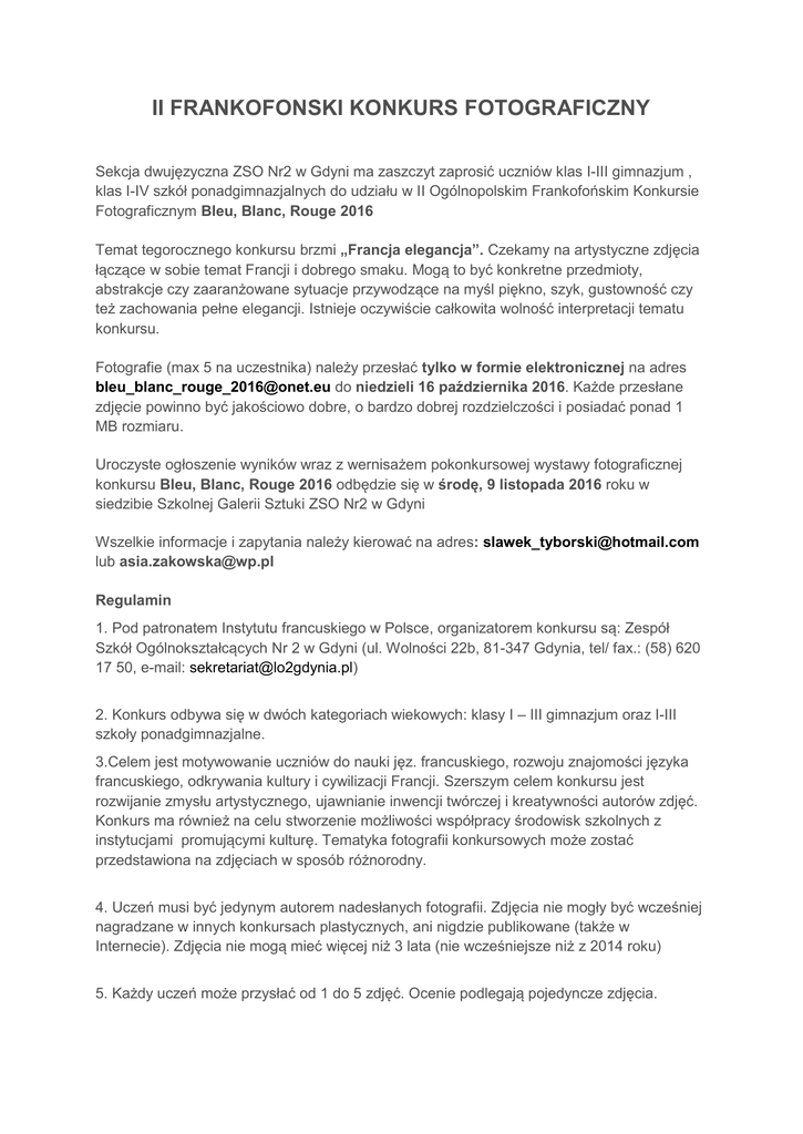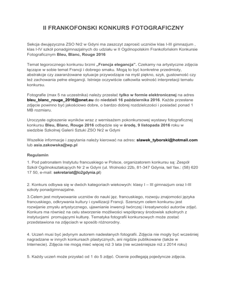 II FRANKOFONSKI KONKURS FOTOGRAFICZNY Sekcja dwujęzyczna ZSO Nr2 w Gdyni ma zaszczyt zaprosić uczniów klas I-III gimnazjum , klas I-IV szkół ponadgimnazjalnych do udziału w II Ogólnopolskim Frankofońskim Konkursie Fotograficznym Bleu, Blanc, Rouge 2016 Temat tegorocznego konkursu brzmi „Francja elegancja”. Czekamy na artystyczne zdjęcia łączące w sobie temat Francji i dobrego smaku. Mogą to być konkretne przedmioty, abstrakcje czy zaaranżowane sytuacje przywodzące na myśl piękno, szyk, gustowność czy też zachowania pełne elegancji. Istnieje oczywiście całkowita wolność interpretacji tematu konkursu. Fotografie (max 5 na uczestnika) należy przesłać tylko w formie elektronicznej na adres [email protected] do niedzieli 16 października 2016. Każde przesłane zdjęcie powinno być jakościowo dobre, o bardzo dobrej rozdzielczości i posiadać ponad 1 MB rozmiaru. Uroczyste ogłoszenie wyników wraz z wernisażem pokonkursowej wystawy fotograficznej konkursu Bleu, Blanc, Rouge 2016 odbędzie się w środę, 9 listopada 2016 roku w siedzibie Szkolnej Galerii Sztuki ZSO Nr2 w Gdyni Wszelkie informacje i zapytania należy kierować na adres: [email protected] lub [email protected] Regulamin 1. Pod patronatem Instytutu francuskiego w Polsce, organizatorem konkursu są: Zespół Szkół Ogólnokształcących Nr 2 w Gdyni (ul. Wolności 22b, 81-347 Gdynia, tel/ fax.: (58) 620 17 50, e-mail: [email protected]) 2. Konkurs odbywa się w dwóch kategoriach wiekowych: klasy I – III gimnazjum oraz I-III szkoły ponadgimnazjalne. 3.Celem jest motywowanie uczniów do nauki jęz. francuskiego, rozwoju znajomości języka francuskiego, odkrywania kultury i cywilizacji Francji. Szerszym celem konkursu jest rozwijanie zmysłu artystycznego, ujawnianie inwencji twórczej i kreatywności autorów zdjęć. Konkurs ma również na celu stworzenie możliwości współpracy środowisk szkolnych z instytucjami promującymi kulturę. Tematyka fotografii konkursowych może zostać przedstawiona na zdjęciach w sposób różnorodny. 4. Uczeń musi być jedynym autorem nadesłanych fotografii. Zdjęcia nie mogły być wcześniej nagradzane w innych konkursach plastycznych, ani nigdzie publikowane (także w Internecie). Zdjęcia nie mogą mieć więcej niż 3 lata (nie wcześniejsze niż z 2014 roku) 5. Każdy uczeń może przysłać od 1 do 5 zdjęć. Ocenie podlegają pojedyncze zdjęcia. 6. Fotografie mogą być także przetwarzane i poprawiane przy pomocy dowolnego programu służącego do edycji i obróbki zdjęć. 7. W mailu wysłanym z fotografiami należy podać następujące dane: imię i nazwisko, kategoria (np. gimnazjum) , nazwa i dokładny adres szkoły (także kod pocztowy), numer telefonu ucznia, kontaktowy adres e-mail (do rodzica lub ucznia). Zdjęcia bez przesłanych danych nie będą dopuszczone do konkursu. Każde zdjęcie przesłane drogą elektroniczną należy podpisać imieniem i nazwiskiem autora. 8. Ogłoszenie wyników nastąpi w środę, 9 listopada 2016 podczas wernisażu w Szkolnej Galerii Sztuki działającej przy ZSO Nr 2 w Gdyni. Serdecznie zapraszamy wszystkich uczestników wraz z nauczycielami lub rodzicami/opiekunami. Informacja o zakwalifikowaniu się do ścisłego finału zostanie przekazana finalistom drogą elektroniczną najpóźniej w poniedziałek 31 października 2016 roku. 9. Laureaci I, II i III miejsca w każdej kategorii otrzymają dyplomy oraz nagrody rzeczowe. Komisja Konkursowa zachowuje sobie prawo przyznania do 3 wyróżnień w każdej kategorii oraz nagrody „Le coup de coeur” za zdjęcie wywołujące najwięcej emocji. 10. Przysłanie zdjęcia do konkursu jest równoznaczne z wyrażeniem zgody na przetwarzanie danych osobowych ucznia na potrzeby konkursu, wyrażeniem zgody na umieszczanie fotografii uczestników konkursu oraz ich imion i nazwisk na stronie internetowej szkoły. Szkoła zastrzega sobie prawo do zachowania przysłanych na konkurs fotografii oraz ich upubliczniania w ramach działalności Szkolnej Galerii Sztuki przy ZSO Nr 2 oraz w innych miejscach wystawowych zaprzyjaźnionych np. Ośrodek Alliance française w Gdańsku, Caffe Anioł w Gdyni, Instytut Francuski w Warszawie. Organizatorzy zastrzegają sobie także prawo publikacji nadesłanych i nagrodzonych zdjęć na stronach internetowych zaprzyjaźnionych instytucji. 11.Fotografie będą zawsze wystawiane i publikowane z podaniem w czytelny sposób imienia i nazwiska autora fotografii. 12. Komisja Konkursowa powołana przez Dyrekcję ZSO Nr 2 oraz opiekuna Szkolnej Galerii Sztuki podejmuje decyzję większością głosów. W skład komisji wchodzą członkowie Gdańskiego Towarzystwa Fotograficznego, czynnie działający trójmiejscy artyści-fotograficy oraz reprezentant organizatorów. Decyzje Komisji są ostateczne i nie podlegają odwołaniu. 13. Wszelkie pytania i wątpliwości proszę kierować pod numer telefonu 668 00 21 75 lub adres e-mail: [email protected], a także [email protected] Organizatorzy konkursu: Sławek Tyborski i Joanna Zakowska oraz Adela Dominique i Pauline de Pauw