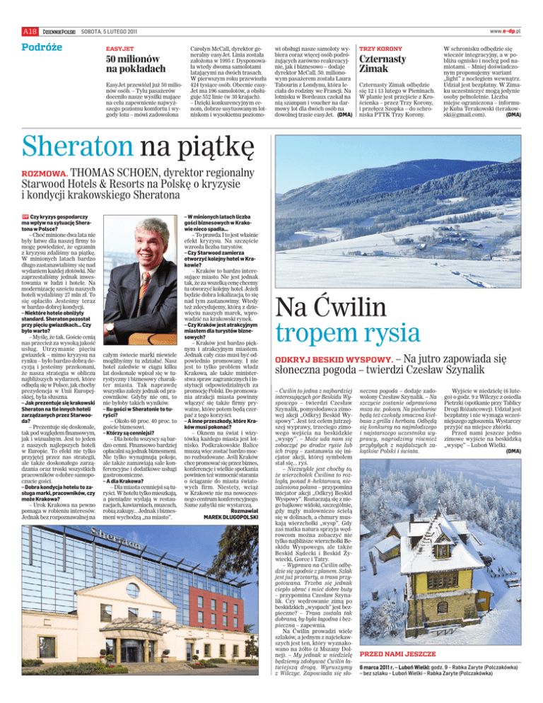 A18 www.e–dp.pl SOBOTA, 5 LUTEGO 2011 Podróże EASYJET 50 milionów na pokładach EasyJet przewiózł już 50 milionów osób. – Tylu pasażerów doceniło nasze wysiłki mające na celu zapewnienie najwyższego poziomu komfortu i wygody lotu – mówi zadowolona Carolyn McCall, dyrektor generalny easyJet. Linia została założona w 1995 r. Dysponowała wtedy dwoma samolotami latającymi na dwóch trasach. W pierwszym roku przewiozła 424 tysiące osób. Obecnie easyJet ma 196 samolotów, a obsługuje 552 linie (w 30 krajach). – Dzięki konkurencyjnym cenom, dobrze usytuowanym lotniskom i wysokiemu poziomo- wi obsługi nasze samoloty wybiera coraz więcej osób podróżujących zarówno reakreacyjnie, jak i biznesowo – dodaje dyrektor McCall. 50. milionowym pasażerem została Laura Tabourin z Londynu, która leciała do rodziny we Francji. Na lotnisku w Bordeaux czekał na nią szampan i voucher na darmowy lot dla dwóch osób na dowolnej trasie easyJet. (DMA) TRZY KORONY Czternasty Zimak Czternasty Zimak odbędzie się 12 i 13 lutego w Pieninach. W planie jest przejście z Krościenka – przez Trzy Korony, i przełęcz Szopka – do schroniska PTTK Trzy Korony. W schronisku odbędzie się wieczór integracyjny, a w pobliżu ognisko i nocleg pod namiotami. – Mniej doświadczonym proponujemy wariant „light” z noclegiem wewnątrz. Udział jest bezpłatny. W Zimaku uczestniczyć mogą jedynie osoby pełnoletnie. Liczba miejsc ograniczona – informuje Kuba Terakowski ([email protected]). (DMA) Sheraton na piątkę ROZMOWA. THOMAS SCHOEN, dyrektor regionalny Starwood Hotels & Resorts na Polskę o kryzysie i kondycji krakowskiego Sheratona DP Czy kryzys gospodarczy ma wpływ na sytuację Sheratona w Polsce? – Choć minione dwa lata nie były łatwe dla naszej firmy to mogę powiedzieć, że egzamin z kryzysu zdaliśmy na piątkę. W minionych latach bardzo długo zastanawialiśmy się nad wydaniem każdej złotówki. Nie zaprzestaliśmy jednak inwestowania w ludzi i hotele. Na modernizację sześciu naszych hoteli wydaliśmy 27 mln zł. To się opłaciło. Jesteśmy teraz w bardzo dobrej kondycji. – Niektóre hotele obniżyły standard. Sheraton pozostał przy pięciu gwiazdkach... Czy było warto? – Myślę, że tak. Goście cenią nas przecież za wysoką jakość usług. Utrzymanie pięciu gwiazdek – mimo kryzysu na rynku – było bardzo dobrą decyzją i jesteśmy przekonani, że nasza strategia w obliczu najbliższych wydarzeń, które odbędą się w Polsce, jak choćby prezydencja w Unii Europejskiej, była słuszna. – Jak prezentuje się krakowski Sheraton na tle innych hoteli zarządzanych przez Starwooda? – Prezentuje się doskonale, tak pod względem finansowym, jak i wizualnym. Jest to jeden z naszych najlepszych hoteli w Europie. To efekt nie tylko przyjętej przez nas strategii, ale także doskonałego zarządzania oraz troski wszystkich pracowników o dobre samopoczucie gości. – Dobra kondycja hotelu to zasługa marki, pracowników, czy może Krakowa? – Urok Krakowa na pewno pomaga w robieniu interesów. Jednak bez rozpoznawalnej na całym świecie marki niewiele moglibyśmy tu zdziałać. Nasz hotel zaledwie w ciągu kilku lat doskonale wpisał się w turystyczny i biznesowy charakter miasta. Tak naprawdę wszystko zależy jednak od pracowników. Gdyby nie oni, to nie byłoby takich wyników. – Ilu gości w Sheratonie to turyści? – Około 60 proc. 40 proc. to goście biznesowi. – Którzy są cenniejsi? – Dla hotelu wszyscy są bardzo cenni. Finansowo bardziej opłacalni są jednak biznesmeni. Nie tylko wynajmują pokoje, ale także zamawiają sale konferencyjne i dodatkowe usługi gastronomiczne. – A dla Krakowa? – Dla miasta cenniejsi są turyści. W hotelu tylko mieszkają, a pieniądze wydają w restauracjach, kawiarniach, muzeach, robią zakupy... Jednak i biznesmeni wychodzą „na miasto”. – W minionych latach liczba gości biznesowych w Krakowie nieco spadła... – To prawda. I to jest właśnie efekt kryzysu. Na szczęście wzrosła liczba turystów. – Czy Starwood zamierza otworzyć kolejny hotel w Krakowie? – Kraków to bardzo interesujące miasto. Nie jest jednak tak, że za wszelką cenę chcemy tu otworzyć kolejny hotel. Jeżeli będzie dobra lokalizacja, to się nad tym zastanowimy. Wtedy też zdecydujemy, którą z dziewięciu naszych marek, wprowadzić na krakowski rynek. – Czy Kraków jest atrakcyjnym miastem dla turystów biznesowych? – Kraków jest bardzo pięknym i atrakcyjnym miastem. Jednak cały czas musi być odpowiednio promowany. I nie jest to tylko problem władz Krakowa, ale także ministerstwa spraw zagranicznych i instytucji odpowiedzialnych za promocję Polski. Do promowania atrakcji miasta powinny włączyć się także firmy prywatne, które potem będą czerpać z tego korzyści. – A inne przeszkody, które Kraków musi pokonać? – Oknem na świat i wizytówką każdego miasta jest lotnisko. Podkrakowskie Balice muszą więc zostać bardzo mocno rozbudowane. Jeśli Kraków chce promować się przez biznes, konferencje i wielkie spotkania powinien też wzmocnić starania o ściąganie do miasta światowych firm. Niestety, wciąż w Krakowie nie ma nowoczesnego centrum konferencyjnego. Same zabytki nie wystarczą. Rozmawiał MAREK DŁUGOPOLSKI Na Ćwilin tropem rysia – Na jutro zapowiada się słoneczna pogoda – twierdzi Czesław Szynalik ODKRYJ BESKID WYSPOWY. – Ćwilin to jedna z najbardziej interesujących gór Beskidu Wyspowego – twierdzi Czesław Szynalik, pomysłodawca zimowej akcji „Odkryj Beskid Wyspowy”. Jest też celem jutrzejszej wyprawy, trzeciego zimowego wejścia na beskidzkie „wyspy”. – Może uda nam się zobaczyć po drodze rysie lub ich tropy – zastanawia się inicjator akcji, której symbolem stał się... ryś. – Niezwykłe jest choćby to, że wierzchołek Ćwilina to rozległa, ponad 8–hektarowa, niezalesiona polana – przypomina inic