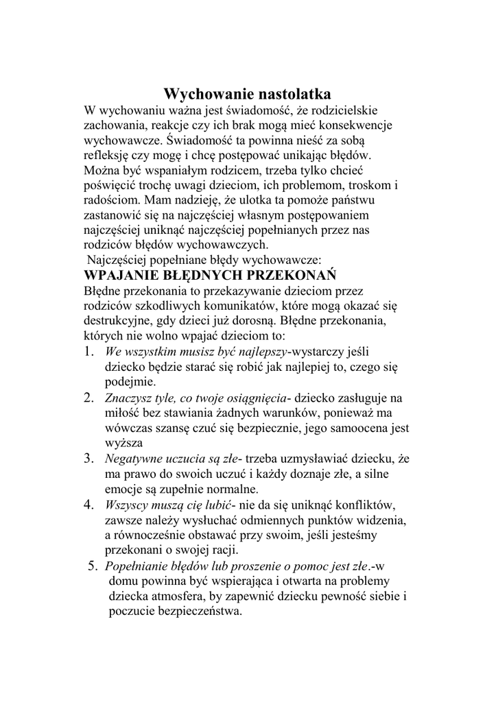 Wychowanie nastolatka W wychowaniu ważna jest świadomość, że rodzicielskie zachowania, reakcje czy ich brak mogą mieć konsekwencje wychowawcze. Świadomość ta powinna nieść za sobą refleksję czy mogę i chcę postępować unikając błędów. Można być wspaniałym rodzicem, trzeba tylko chcieć poświęcić trochę uwagi dzieciom, ich problemom, troskom i radościom. Mam nadzieję, że ulotka ta pomoże państwu zastanowić się na najczęściej własnym postępowaniem najczęściej uniknąć najczęściej popełnianych przez nas rodziców błędów wychowawczych. Najczęściej popełniane błędy wychowawcze: WPAJANIE BŁĘDNYCH PRZEKONAŃ Błędne przekonania to przekazywanie dzieciom przez rodziców szkodliwych komunikatów, które mogą okazać się destrukcyjne, gdy dzieci już dorosną. Błędne przekonania, których nie wolno wpajać dzieciom to: 1. We wszystkim musisz być najlepszy-wystarczy jeśli dziecko będzie starać się robić jak najlepiej to, czego się podejmie. 2. Znaczysz tyle, co twoje osiągnięcia- dziecko zasługuje na miłość bez stawiania żadnych warunków, ponieważ ma wówczas szansę czuć się bezpiecznie, jego samoocena jest wyższa 3. Negatywne uczucia są złe- trzeba uzmysławiać dziecku, że ma prawo do swoich uczuć i każdy doznaje złe, a silne emocje są zupełnie normalne. 4. Wszyscy muszą cię lubić- nie da się uniknąć konfliktów, zawsze należy wysłuchać odmiennych punktów widzenia, a równocześnie obstawać przy swoim, jeśli jesteśmy przekonani o swojej racji. 5. Popełnianie błędów lub proszenie o pomoc jest złe.-w domu powinna być wspierająca i otwarta na problemy dziecka atmosfera, by zapewnić dziecku pewność siebie i poczucie bezpieczeństwa. NIEŚWIADOME PROWOKOWANIE ZŁEGO ZACHOWANIA 1. Wszystkie dzieci chcą skupiać na sobie uwagę. Uwielbiają, kiedy je chwalisz, z drugiej strony, wola raczej być przez ciebie skrzyczane i pouczone niż kompletnie ignorowane i niezauważane. Dzieci nie wolno ignorować!. 2. Zauważaj dobre zachowania , a nie tylko złe. 3. Chwal konkretnie, dobre zachowania, unikaj pochwał ogólnych. 4. Zawsze próbuj „wyłapać” dobre zachowanie dziecka i je nagradzaj. 5. Chwal każdy, nawet mały kroczek ku pożądanemu zachowaniu. 6. Czasami trzeba nagradzać brak złego zachowania. BRAK KONSEKWENCJI Brak konsekwencji to jedna z najczęstszych pułapek, w jakie wpadają rodzice. Przyczyny to: brak czasu, roztargnienie,stres,nieuwaga. Bez względu na to co jest tego powodem, brak konsekwencji przyczynia się do powstawania wielu problemów wychowawczych. 1. Nie zaprowadzaj dyscypliny, kiedy jesteś zły. 2. Rodzice powinni tworzyć jeden front wychowawczy. 3. daj jedno ostrzeżenie, a potem dopiero stosuj odpowiednia karę. 4. Stosuj krótkie i łatwe do zrealizowania kary. 5. Pamiętaj o danych dziecku obietnicach. PUŁAPKI POROZUMIEWANIA SIĘ Umiejętność porozumiewania się ze swoim dzieckiem to najprawdopodobniej najważniejsza umiejętność rodziców. Kiedy dzieci wiedzą, że mogą porozmawiać o swoich sprawach z rodzicami, czują, że są ważne i kontrolują sytuację. 1. Słuchanie to proces aktywny: kiedy rozmawiasz z dzieckiem skupiaj na nim całą swoją uwagę. 2. Unikaj komunikatów: ty- ty zawsze, przestań, jesteś źle wychowany, jak ty się zachowujesz? 3. Stosuj komunikaty: ja-nie mam ochoty na zabawę, jestem zmęczona, jestem załamana, kiedy widzę co się dzieje w twoim pokoju, jest mi smutno, kiedy tak do mnie mówisz, bardzo mi przykro, gdy tak się zachowujesz. ZROBIĘ TO ZA CIEBIE Bez względu na to, jak wspaniałymi jesteśmy rodzicami, nasze dzieci będą w życiu napotykały na różne trudności i przeszkody. Rodzicom nie jest łatwo patrzeć jak ich dzieci zmagają się z tymi wyzwaniami, chcą ustrzec je przed bólem i rozczarowaniem. W ten sposób mimowolnie pozbawiają je możliwości uczenia się na własnych błędach, uzależniają od siebie, zamiast uczyć samodzielności i niezależności. 1. Kiedy to możliwe, pozwalaj dziecku przewidywać logiczne konsekwencje swojego postępowania. 2. Uczenie się na własnych błędach jest niewłaściwe tylko wtedy, gdy zagraża bezpieczeństwu dziecka lub narusza prawa innych. 3. Pomagaj w rozwiązywaniu problemów wtedy, kiedy Twoja interwencja jest konieczna. ŻELAZNA DYSCYPLINA W każdej rodzinie są sytuacje wymagające od rodziców wprowadzenia i stosowania dyscypliny. Rodzice mogą tu jednak popełnić wiele błędów, których dałoby się uniknąć dzięki planowi działania. 1. Nie wprowadzaj i nie stosuj dyscypliny kiedy jesteś zły. 2. Wyciągaj odpowiednie , sprawiedliwe konsekwencje. 3.Dawanie dzieciom wyboru kary zwiększa ich poczucie kompetencji i kontroli. 4. Celem stosowania dyscypliny nie jest udowodnienie, kto ma rację, a kto jej nie ma. 5. Celem dyscypliny jest zmiana zachowania, które stwarza problemy. IGNOROWANIE POTRZEB I TRUDNOŚCI DZIECKA Każde dziecko jest wyjątkowe, ma swoje zalety i wady, zainteresowania, umiejętności i słabości. Gdy dziecko dorasta, rodzice uświadamiają sobie tę wyjątkowość jego cech osobowości. Niektóre z tych cech są całkowicie pozytywne i należy je wspierać. Inne skłonności mogą stwarzać problemy i powinny zostać wyeliminowane. 1. Wiele dzieci przejawia dziwne nastroje i zachowania, ale w rzeczywistości SA one normalne i mijają. 2. U niektórych dzieci występują objawy zaburzeń wymagające interwencji specjalistów. 3. Rodzic powinien zaniepokoić się zachowaniem sprawiającym problemy, jeśli utrzymuje się ono przez dłuższy czas, jest bardzo nasilone lub przeszkadza dziecku w codziennym funkcjonowaniu. HAMOWANIE NATURALNEJ RADOŚCI ŻYCIA I CIEKAWOŚCI Kiedy dorośniemy, często zapominamy, jak to było być dzieckiem. Dajemy się wciągnąć w wir codzienności, ograniczając swoje życie do zarabiania pieniędzy, spłacania rat i wychowywania dzieci. Zapominamy, że one również mogą nas czegoś nauczy