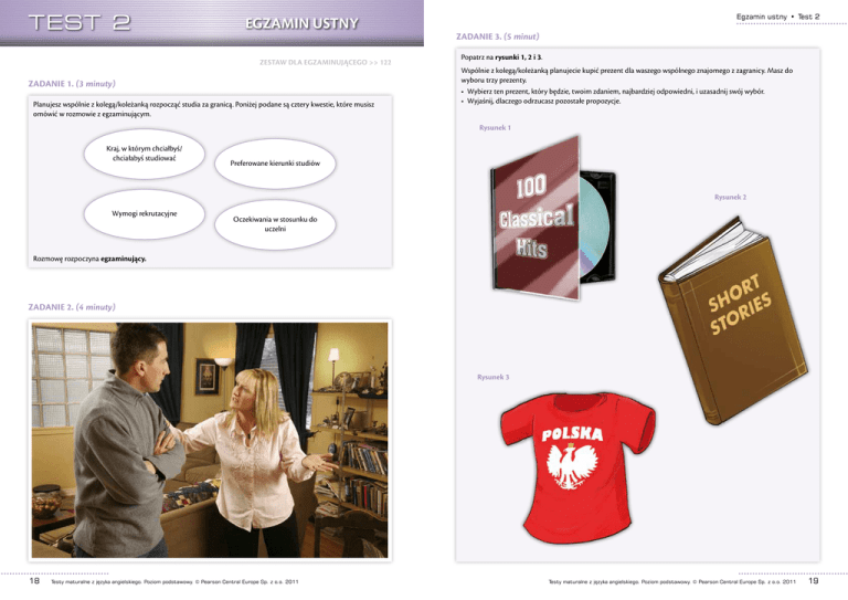 TEST 2 EGZAMIN USTNY ZESTAW DLA EGZAMINUJĄCEGO >> 122 Zadanie 1. (3 minuty) Planujesz wspólnie z kolegą/koleżanką rozpocząć studia za granicą. Poniżej podane są cztery kwestie, które musisz omówić w rozmowie z egzaminującym. Egzamin ustny • Test 2 Zadanie 3. (5 minut) Popatrz na rysunki 1, 2 i 3. Wspólnie z kolegą/koleżanką planujecie kupić prezent dla waszego wspólnego znajomego z zagranicy. Masz do wyboru trzy prezenty. • Wybierz ten prezent, który będzie, twoim zdaniem, najbardziej odpowiedni, i uzasadnij swój wybór. • Wyjaśnij, dlaczego odrzucasz pozostałe propozycje. Rysunek 1 Kraj, w którym chciałbyś/ chciałabyś studiować Preferowane kierunki studiów Rysunek 2 Wymogi rekrutacyjne Oczekiwania w stosunku do uczelni Rozmowę rozpoczyna egzaminujący. Zadanie 2. (4 minuty) Rysunek 3 18 Testy maturalne z języka angielskiego. Poziom podstawowy. © Pearson Central Europe Sp. z o.o. 2011 Testy maturalne z języka angielskiego. Poziom podstawowy. © Pearson Central Europe Sp. z o.o. 2011 19
