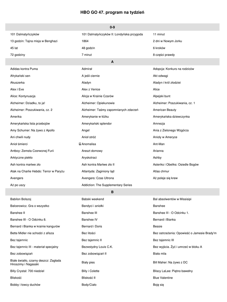 HBO GO 47. program na tydzień 0-9 101 Dalmatyńczyków 101 Dalmatyńczyków II: Londyńska przygoda 11 minut 13 godzin: Tajna misja w Benghazi 1864 2 dni w Nowym Jorku 45 lat 48 godzin 6 kroków 72 godziny 7 minut 8 części prawdy A Adidas kontra Puma Admirał Adopcja: Konkurs na rodziców Afrykański sen A jeśli ciernie Akt odwagi Akuszerka Aladyn Aladyn i król złodziei Alex i Eve Alex z Venice Alice Alice: Kontynuacja Alicja w Krainie Czarów Alpejski bunt Alzheimer: Dziadku, to ja! Alzheimer: Opiekunowie Alzheimer: Poszukiwania, cz. 1 Alzheimer: Poszukiwania, cz. 2 Alzheimer: Taśmy zapomnianych zdarzeń American Beauty Amerika Amerykanie w łóżku Amerykańska dziewczynka Amerykańska lista przebojów Amerykański splendor Amnezja Amy Schumer: Na żywo z Apollo Angel Ania z Zielonego Wzgórza Ani chwili nudy Anioł stróż Anioły w Ameryce Anioł śmierci Anomalisa Ant-Man Antboy: Zemsta Czerwonej Furii Areszt domowy Arianna Arktyczne piekło Aryskotraci Ashby Ash kontra martwe zło Ash kontra Martwe zło II Asteriks i Obeliks: Osiedle Bogów Atak na Charlie Hebdo: Terror w Paryżu Atlantyda: Zaginiony ląd Atlas chmur Avengers Avengers: Czas Ultrona Aż poleje się krew Aż po uszy Addiction: The Supplementary Series B Babilon Bolszoj Babski weekend Bal absolwentów w Missisipi Balcerowicz. Gra o wszystko Bandyci i aniołki Banshee Banshee II Banshee III Banshee III - O Odcinku 1. Banshee III - O Odcinku 8. Banshee IV Bernard i Bianka Bernard i Bianka w krainie kangurów Bernard i Doris Bessie Bette Midler nie schodzi z afisza Bez litości Bez ostrzeżenia: Opowieść o Jamesie Brady'm Bez tajemnic Bez tajemnic II Bez tajemnic III Bez tajemnic III - materiał specjalny Bezwstydny Louis C.K. Bez wyjścia. Żyć i umrzeć w bloku A Bez zobowiązań Bez zobowiązań II Biała mila Białe światło, czarny deszcz: Zagłada Hiroszimy i Nagasaki Biały pies Bill Maher: Na żywo z DC Billy Crystal: 700 niedziel Billy i Colette Bliscy LaLee: Piętno bawełny Bliskość Bliskość II Blue Valentine Bobby i łowcy duchów Body/Ciało Boję się Brand: Nowe wcielenie Britannic w niebezpieczeństwie Brudna wojna Bukareszt: Rok smoka Bumerang Bunt na Bounty Byzantium Była sobie dziewczyna Była sobie dziewczynka Było, minęło Bóg to większy Elvis Bóg zemsty Będę w domu na Święta C Carandiru Carnivale Carnivale II Carrie Carrington Cena honoru Cena pragnień Cena sukcesu Charing Cross 84 Chce się żyć Chemia Cherokee Kid Chicago Chuck Norris kontra komunizm Chętni na kasę Chłopaki Chłopiec ze skazą Cienki Bolek Cień mgły Cinema, mon amour Cinema Verite Ciężkie czasy na Long Island Cmentarz Narodowy w Arlington: Kwatera sześćdziesiąta Co było, a nie jest Control Controra: Dom pełen cieni Cop Land Coś jest nie tak z ciocią Diane Creed: Narodziny legendy Cromwell Cudowny dzień Cudowny świat Cyberszantaż Czarni bracia Czarny tygrys Czasem w kwietniu Czas przemian Czas próby Czekając na sobotę Czekam na ciebie w Laramie Czekolada Czekoladowe miasto Cześć, Carter Cześć, pajacu Czterdziesty pierwszy Czterej bracia Cztery małe dziewczynki Cztery noce z Anną Czy ktoś widział Andy'ego? Czysta krew Czysta krew II Czysta krew III Czysta krew IV Czysta krew V Czysta krew VI Czysta krew VII Czysta krew VII: blog Jessiki Czysta krew VII: blog Jessiki Czysta krew VII: blog Jessiki Czytadło Częstotliwość Człowiek ptak Człowiek z bieguna Cathouse Cathouse II. Crashbox D Daleko za słońcem Darling I Lowe Ju Darwin i wrogowie ewolucji David McCullough maluje słowami Dawno temu w trawie Debiutanci Decydujący głos Deep Love Demony z Abu Ghraib Denat Detektyw Detektyw II Diabelskie polowanie Diagnoza Dla Nedy Dla waszego dobra Dobra robota: Nowojorscy strażacy Dobre zabijanie Dobry dinozaur Dochodzenie Do końca Dolina Krzemowa Dolina Krzemowa II Dolina Krzemowa III Dom Saddama Dom na końcu ulicy Dom snów Do nieba Doug Zabawny Dowód Droga ku wojnie Druga wojna secesyjna Duch salsy Duchy z Enfield, cz. 1 Duchy z Enfield, cz. 2 Duet na jeden instrument Dumbo Dumni alfonsi i ich pokorne prostytutki Dumni i wściekli Dwa światy: Historia miłosna Dyrektor naczelny Dziadek i ja Dzieci Boga: zagubione i odnalezione Dzieciaki mojej siostry na tropie złota Dzieci niebios Dziecięcy ogród poezji Dzieciństwo Dziecko diabła Dziecko miłości Dziedzictwo Ferramontich Dziedzictwo grzechu: Historia Williama Coita Dziedziczka egzekucji Dziennik panny służącej Dziewczyna do towarzystwa Dziewczyna w rzece: Cena wybaczenia Dziewczyna z książek Dziewczyna z pistoletem Dziewczyna z plakatu Dziewczyna z szafy Dziewczyny Dziewczyny II Dziewczyny III Dziewczyny IV Dziewczyny V Dziewczyny V - Wizyta Na Planie Dziewczyny V: Elijah Dziewczyny V: Marine Dziewczyny V: Ray Dziewczyny V: Shoshanna Dzień, w którym narodziliśmy się na nowo Dzień kobiet Dzień po Dzień sądu Dzika jak natura Dzikie historie Dziękuję, panie prezydencie: Helen Thomas w Białym Domu Długa noc E Ebola Eden Eden Edukacja Dee Dee Ricks Edukacja Mohammada Husseina Edukacja dla opornych Einstein i Eddington Ekipa Ekipa II Ekipa III Ekipa IV Ekipa V Ekipa VI Ekipa VII Ekipa VIII El Diablo Ella zaklęta Emma Emmy 2016: Ceremonia rozdania nagród Empire Falls, cz. 1 Empire Falls, cz. 2 Endorfiny Epitafia II Equilibrium Europejskie Nagrody Filmowe 2015 Eurotrip Eva F Fabryka Triangle: Pamięć o pożarze Fabryki śmierci Faceci do wynajęcia Falcone Fantazja Fantazja 2000 Fałszywy trop Felix, Net i Nika oraz teoretycznie możliwa katastrofa Feniks Ferrell na boisku Figurantka Figurantka Figurantka III Figurantka IV Figurantka V Filmy i gwiazdy VIII Flight of the Conchords Flight of the Conchords II Flubber Fort Apache, Bronx Fort Bliss Fortuna Frajer Francuska krew Frankenweenie Freddie Roach Freistatt Frida Funny or Die prezentuje Funny or Die prezentuje II Futbol z Shaolin Fúsi G Gang szklanych kulek Garderobiany Gdy milkną fanfary Gdzie jesteś, Amando? Generation Kill: Czas wojny Genesis Poti
