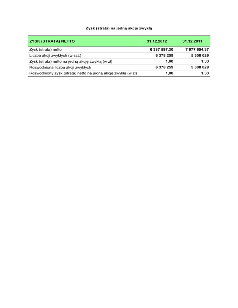 Zysk (strata) na jedną akcję zwykłą ZYSK (STRATA) NETTO Zysk (strata) netto Liczba akcji zwykłych (w szt.) Zysk (strata) netto na jedną akcję zwykłą (w zł) Rozwodniona liczba akcji zwykłych Rozwodniony zysk (strata) netto na jedną akcję zwykłą (w zł) 31.12.2012 31.12.2011 6 387 597,30 7 077 654,37 6 378 259 5 308 029 1,00 1,33 6 378 259 5 308 029 1,00 1,33