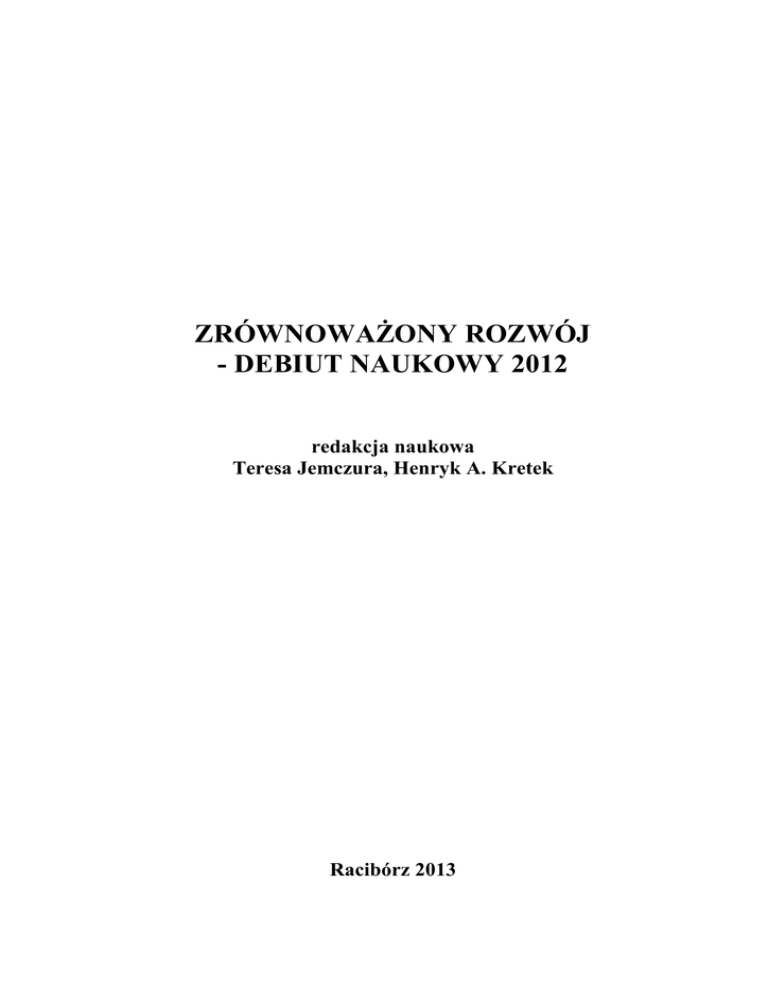ZRÓWNOWAŻONY ROZWÓJ - DEBIUT NAUKOWY 2012 redakcja naukowa Teresa Jemczura, Henryk A. Kretek Racibórz 2013 Rada Wydawnicza Państwowej Wyższej Szkoły Zawodowej w Raciborzu: Przewodniczący: prof. dr hab. Joachim Raczek Członkowie: prof. nadzw. dr hab. Michał Szepelawy, prof. nadzw. dr hab. Jerzy Pośpiech, prof. nadzw. dr hab. Marian Kapica, prof. nadzw. dr hab. Gabriela Kapica, prof. dr hab. Mieczysław Balowski, prof. nadzw. dr hab. Ryszard Gmoch, prof. nadzw. dr hab. Leszek Karczewski, prof. nadzw. dr hab. inż. Andrzej Sokołowski, prof. nadzw. adi. II st. Aleksander Ostrowski, prof. nadzw. dr hab. Grzegorz Juras, doc. dr Daniel Vogel Recenzenci: prof. nadzw. dr hab. Paweł Czarnecki, Нелля Ничкало - aкадемік-секретар Відділення професійної освіти і освіти дорослих НАПН України, доктор педагогічних наук, професор, дійсний член НАПН України Tłumaczenie ukraińsko-polskie: mgr Aleksandra Bratczuk, Лілія Потапенко PhD Projekt okładki: Roman Nowak Opracowanie techniczne: Janusz Krajewski Druk i oprawa: ATB STUDIO, ul. Ks. Janusza 10a, 43-410 Zebrzydowice Dystrybucja: „Skrypciarnia” PWSZ Racibórz ul. Słowackiego 55, 47-400 Racibórz www.pwsz.raciborz.edu.pl (zakładka „Wydawnictwo”) ISBN 978-83-60730-65-2 Copyright © by Wydawnictwo Państwowej Wyższej Szkoły Zawodowej w Raciborzu, 2013 Wszelkie prawa zastrzeżone przez Wydawnictwo Państwowej Wyższej Szkoły Zawodowej w Raciborzu. Żadna część tej pracy, jak i całość, nie może być powielana czy rozpowszechniana w jakiejkolwiek formie i w jakikolwiek sposób, bądź elektroniczny, bądź mechaniczny, włącznie z fotokopiowaniem, skanowaniem, nagrywaniem na wszelkie nośniki elektroniczne lub przy użyciu innych systemów, bez pisemnej zgody wydawcy. SPIS TREŚCI Wprowadzenie ........................................................................................................ 7 ROZDZIAŁ I – WIELOASPEKTOWOŚĆ ZRÓWNOWAŻONEGO ROZWOJU 1.1. Strategie globalnej gospodarki a regionalizacja.......................................... 18 1.1.1. Filozofia zrównoważonego rozwoju w warunkach Gospodarki Opartej na Wiedzy – Marcin Nowak ......................................................................................... 19 1.1.2. Inteligentna specjalizacja regionów w strategii Europa 2020 a zrównoważony rozwój – Patrycja Mich ......................................................................................... 26 1.1.3. „Ciemna energia” ładu międzynarodowego – czyli wbudowana niezrównoważoność systemu globalnego, jej skutki i przykładowe propozycje zmian – Jacek Sobański ........................................................................................ 35 1.1.4. Zrównoważony rozwój w Polsce: wczoraj, dziś i jutro. Tendencje, zagrożenia – Natalia Lechowicz, Sabina Waluś .......................................................... 43 1.1.5. Zrównoważony rozwój – szansą dla Polski? – Jarosław Gorący ..................................................................................... 53 1.2. Prawo i polityka instrumentami procesów zmian ...................................... 60 1.2.1. Prawo - narzędziem w rękach prawodawców w okresie “rewolucji zrównoważonego rozwoju”? – Joanna Żak .............................................................................................. 61 1.2.2. Przyjazne instrumenty prawa wyborczego w świetle założeń zrównoważonego rozwoju – Agata Pyrzyńska .......................................... 69 1.2.3. Zrównoważony rozwój w ujęciu alterglobalistycznym i jego chadecka krytyka – Hubert Staśkiewicz .................................................................................. 79 1.2.4. Publicznoprawne instrumenty zwiększania efektywności gospodarki wodnej w Polsce przy poszanowaniu zasady zrównoważonego rozwoju – problematyka zbiorników retencyjnych – Anna Kamińska ....................................................................................... 85 1.2.5. Wpływ harmonizacji podatkowej na zrównoważony rozwój systemów podatkowych w Unii Europejskiej – Edyta Banach .......................................................................................... 94 ZRÓWNOWAŻONY ROZWÓJ - DEBIUT NAUKOWY 2012 4 –––––––––––––––––––––––––––––––––––––––––––––––––––––––––––––––––––––––––––––––––––––– 1.3. Aspekt społeczny w procesach transformacji .......................................... 101 1.3.1. Zrównoważony rozwój – przyczynek powstania World Class University of Poland –Adam Trawiński ..................................................................................... 102 1.3.2. Strategiczna rola działu zasobów ludzkich w realizacji koncepcji zrównoważonego rozwoju – Justyna Cyga ......................................................................................... 110 1.3.3. Europejski homo sustinens w trzech wymiarach – Izabela Bal ............................................................................................ 123 1.3.4. Wpływ nadzoru korporacyjnego na realizację koncepcji zrównoważonego rozwoju – Łukasz Żabski ........................................................................................ 134 1.3.5. Europejski Instrument Sąsiedztwa i Partnerstwa na wschodniej granicy Unii Europejskiej – Emilia Jankowska ................................................................................. 144 1.3.6. Ogląd procesów transformacji ziem górnego śląska i śląska opolskiego w kontekście zrównoważonego rozwoju. Od tradycji do wizji – Jolanta Szulakowska-Kulawik .............................................................