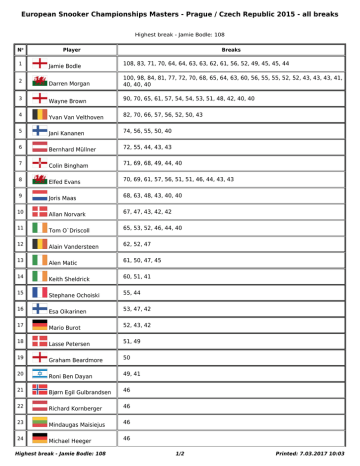 European Snooker Championships Masters - Prague / Czech Republic 2015 - all breaks Highest break - Jamie Bodle: 108 No Player 1 Jamie Bodle 108, 83, 71, 70, 64, 64, 63, 63, 62, 61, 56, 52, 49, 45, 45, 44 2 Darren Morgan 100, 98, 84, 81, 77, 72, 70, 68, 65, 64, 63, 60, 56, 55, 55, 52, 52, 43, 43, 43, 41, 40, 40, 40 3 Wayne Brown 90, 70, 65, 61, 57, 54, 54, 53, 51, 48, 42, 40, 40 4 Yvan Van Velthoven 82, 70, 66, 57, 56, 52, 50, 43 5 Jani Kananen 74, 56, 55, 50, 40 6 Bernhard Müllner 72, 55, 44, 43, 43 7 Colin Bingham 71, 69, 68, 49, 44, 40 8 Elfed Evans 70, 69, 61, 57, 56, 51, 51, 46, 44, 43, 43 9 Joris Maas 68, 63, 48, 43, 40, 40 10 Allan Norvark 67, 47, 43, 42, 42 11 Tom O`Driscoll 65, 53, 52, 46, 44, 40 12 Alain Vandersteen 62, 52, 47 13 Alen Matic 61, 50, 47, 45 14 Keith Sheldrick 60, 51, 41 15 Stephane Ochoiski 55, 44 16 Esa Oikarinen 53, 47, 42 17 Mario Burot 52, 43, 42 18 Lasse Petersen 51, 49 19 Graham Beardmore 50 20 Roni Ben Dayan 49, 41 21 Bjørn Egil Gulbrandsen 46 22 Richard Kornberger 46 23 Mindaugas Maisiejus 46 24 Michael Heeger 46 Highest break - Jamie Bodle: 108 Breaks 1/2 Printed: 7.03.2017 10:03 European Snooker Championships Masters - Prague / Czech Republic 2015 - all breaks No Player Breaks 25 Piotr Murat 46 26 Juha Lehto 44, 40 27 Robert Watkins 42, 41 28 Asgeir Gudbjartsson 40 Highest break - Jamie Bodle: 108 2/2 Printed: 7.03.2017 10:03