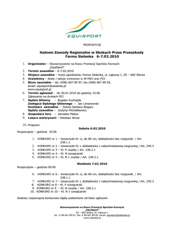 PROPOZYCJE Halowe Zawody Regionalne w Skokach Przez Przeszkody Farma Sielanka 6-7.02.2010 1. Organizator – Stowarzyszenie na Rzecz Promocji Sportów Konnych 2. 3. 4. 5. 6. 7. 8. 9. „EquiSport" Termin zawodów – 6-7.02.2010 Miejsce zawodów – kryta ujeżdżalnia, Farma Sielanka, ul. Łąkowa 1, 05 – 660 Warka Uczestnicy – kluby i sekcje zrzeszone w W-MZJ oraz PZJ Biuro zawodów – tel. (048) 667 89 07, fax (048) 667 89 05, email: [email protected] www.equisport.pl Termin zgłoszeń - do 30.01.2010 do godziny 15.00 Zgłoszenia na drukach PZJ Sędzia Główny - Bogdan Kuchejda Zastępca Sędziego Głównego – Jan Limanowski Komisarz zawodów – Sylwia Garbacz-Bogacz Sędzia zawodów – Justyna Michałkiewicz Gospodarz toru – Jarosław Płatos Lekarz weterynarii – Wiesław Wnuk 10. Program: Sobota 6.02.2010 Rozpoczęcie – godzina 10.00 1. KONKURS nr 1 – towarzyski Kl. LL do 80 cm, dokładności bez rozgrywki / Art. 238.1.1 2. KONKURS nr 2 – towarzyski Kl. L dokładności z natychmiastową rozgrywką / Art. 245.3 3. KONKURS nr 3 – Kl. P zwykły / Art. 238.2.1 4. KONKURS nr 4 – Kl. N szwajcarski 5. KONKURS nr 5 – Kl. N 1 zwykły / Art. 238.2.1 Niedziela 7.02.2010 Rozpoczęcie – godzina 09.00 6. KONKURS nr 6 – towarzyski Kl. LL do 80 cm, dokładności bez rozgrywki / Art. 238.1.1 7. KONKURS nr 7 – towarzyski Kl. L dokładności z natychmiastową rozgrywką / Art. 245.3 8. KONKURS nr 8 – Kl. P szwajcarski 9. KONKURS nr 9 – Kl. N zwykły / Art. 238.2.1 10. KONKURS nr 10 – Kl. N 1 szwajcarski Godziny rozpoczęcia konkursów będą uzależnione od ilości zgłoszeń. Stowarzyszenie na Rzecz Promocji Sportów Konnych „EquiSport” 05 – 660 Warka, Ul. Łąkowa 1 tel.: 0 48 667 89 07, fax: 0 48 667 89 05, email: [email protected] www.sielanka.pl Warunki techniczne: - Prosimy o przedstawienie dokumentów w loży sędziowskiej i wniesienie opłat w biurze zawodów na min 1 godzinę przed rozpoczęciem konkursu. - Zmiany na listach startowych możliwe są nie później niż na godzinę przed konkursem. Za zmianę po tym terminie pobierana będzie opłata w wysokości 10 PLN. - opłata organizacyjna – 100 zł od konia za dwa dni - 60 zł od konia za jeden dzień - startowe od konia: konkurs kl. P – 10 zł konkurs kl. N – 15 zł konkurs kl. C – 20 zł - opłata za boks – 150 PLN całe zawody, 75 PLN jeden dzień (organizator dysponuje ograniczoną ilością boksów - 120 boksów) - decyduje kolejność zgłoszeń; Zgłoszenie na dwa dni zawodów nie jest równoznaczne z rezerwacją boksów. - podłączenie koniowozu do prądu – 50 zł. (Prosimy o informację na zgłoszeniu) - zawody będą rozgrywane zgodnie z przepisami PZJ; - organizator nie ponosi odpowiedzialności za wypadki, kradzieże oraz szkody mogące mieć miejsce podczas zawodów i transportu; - dla zwycięzców konkursów Zawodów Regionalnych przewidziane są nagrody pieniężne - w konkursach klasy P, N-1, N (PULA NAGRÓD – 2000 zŁ plus wpływy z opłat startowych), puchary, flot dla koni (25% uczestników w konkursie) - organizator zastrzega sobie prawo do ewentualnych zmian w programie zawodów. - Konkursy 1,2,6,7 są konkursami towarzyskimi. Przewidziane są nagrody rzeczowe, flot dla koni (25% uczestników w konkursie) Zawodników obowiązują aktualne badania lekarskie, a konie min. Karta identyfikacyjna konia z aktualnymi szczepieniami. - Obsługa medyczna IZI-MED / karetka RW/ Noclegi: Hotel Sielanka Nad Pilicą****: Rezerwacje: tel.: 048 666 16 00, email: [email protected] - Hotel Pułaski, ul. Warszawska 45, 05-660 Warka [email protected] tel. 0 48 667 24 21 fax 0 48 667 24 21 - Zajazd u Jankiela / przy trasie Warka-Kozienice / tel. 0 609 148 376 ; 0 48 670 10 55 - Hotel Janpom, ul. Grójecka 26, 05-660 Warka tel. 0 48 667 00 78 PROSIMY O CZYTELNE, PISEMNE ZGŁASZANIE KONI I ZAWODNIKÓW DO KONKURSÓW. PROSIMY O PODAWANIE WSZYSTKICH DANYCH ZAWODNIKÓW ORAZ KONI. ZGŁOSZENIA NIEPEŁNE NIE BĘDĄ PRZYJMOWANE. Stowarzyszenie na Rzecz Promocji Sportów Konnych „EquiSport” 05 – 660 Warka, Ul. Łąkowa 1 tel.: 0 48 667 89 07, fax: 0 48 667 89 05, email: [email protected] www.sielanka.pl