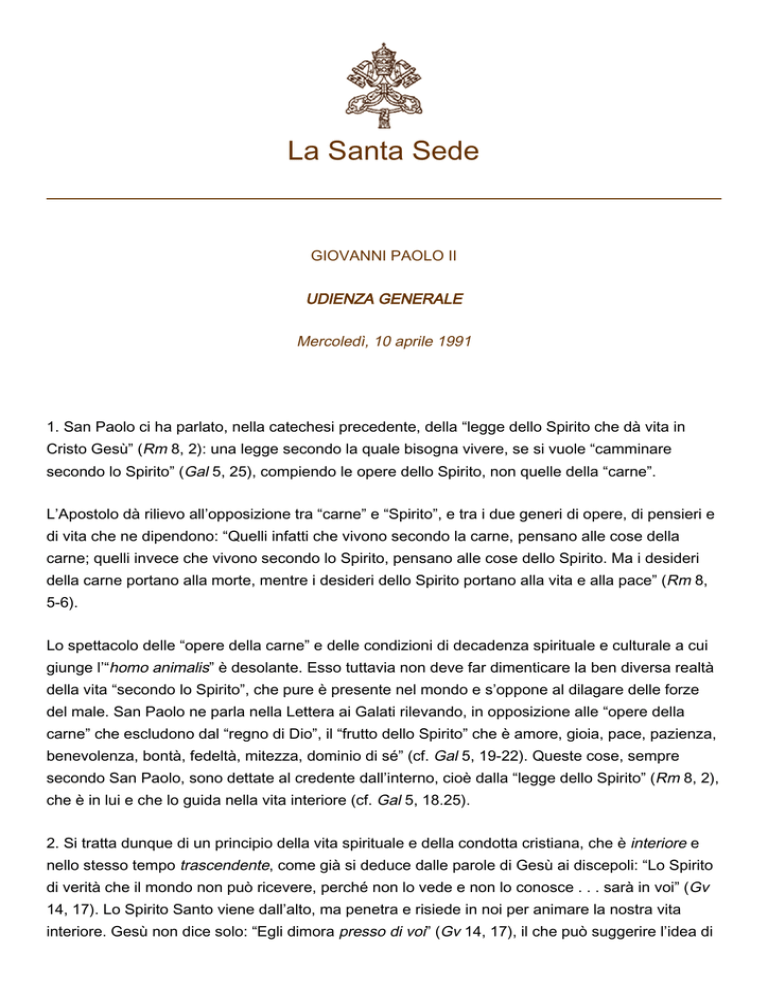 La Santa Sede GIOVANNI PAOLO II UDIENZA GENERALE Mercoledì, 10 aprile 1991 1. San Paolo ci ha parlato, nella catechesi precedente, della “legge dello Spirito che dà vita in Cristo Gesù” (Rm 8, 2): una legge secondo la quale bisogna vivere, se si vuole “camminare secondo lo Spirito” (Gal 5, 25), compiendo le opere dello Spirito, non quelle della “carne”. L’Apostolo dà rilievo all’opposizione tra “carne” e “Spirito”, e tra i due generi di opere, di pensieri e di vita che ne dipendono: “Quelli infatti che vivono secondo la carne, pensano alle cose della carne; quelli invece che vivono secondo lo Spirito, pensano alle cose dello Spirito. Ma i desideri della carne portano alla morte, mentre i desideri dello Spirito portano alla vita e alla pace” (Rm 8, 5-6). Lo spettacolo delle “opere della carne” e delle condizioni di decadenza spirituale e culturale a cui giunge l’“homo animalis” è desolante. Esso tuttavia non deve far dimenticare la ben diversa realtà della vita “secondo lo Spirito”, che pure è presente nel mondo e s’oppone al dilagare delle forze del male. San Paolo ne parla nella Lettera ai Galati rilevando, in opposizione alle “opere della carne” che escludono dal “regno di Dio”, il “frutto dello Spirito” che è amore, gioia, pace, pazienza, benevolenza, bontà, fedeltà, mitezza, dominio di sé” (cf. Gal 5, 19-22). Queste cose, sempre secondo San Paolo, sono dettate al credente dall’interno, cioè dalla “legge dello Spirito” (Rm 8, 2), che è in lui e che lo guida nella vita interiore (cf. Gal 5, 18.25). 2. Si tratta dunque di un principio della vita spirituale e della condotta cristiana, che è interiore e nello stesso tempo trascendente, come già si deduce dalle parole di Gesù ai discepoli: “Lo Spirito di verità che il mondo non può ricevere, perché non lo vede e non lo conosce . . . sarà in voi” (Gv 14, 17). Lo Spirito Santo viene dall’alto, ma penetra e risiede in noi per animare la nostra vita interiore. Gesù non dice solo: “Egli dimora presso di voi” (Gv 14, 17), il che può suggerire l’idea di 2 una presenza che è soltanto vicina, ma aggiunge che si tratta di una presenza dentro di noi. San Paolo, a sua volta, augura agli Efesini che il Padre conceda loro “di essere potentemente rafforzati dal suo Spirito nell’uomo interiore” (Ef 3, 16): nell’uomo cioè che non si accontenta di una vita esterna, spesso superficiale, ma intende vivere nelle “profondità di Dio”, scrutate dallo Spirito Santo (cf. 1 Cor 2, 10). La distinzione fatta da Paolo circa l’uomo “psichico” e l’uomo “spirituale” (cf. 1 Cor 2, 13-14) ci aiuta a capire la differenza e la distanza tra la maturazione connaturale alle capacità dell’anima umana e la maturità propriamente cristiana, che implica lo sviluppo della vita dello Spirito, la maturazione della fede, della speranza, della carità. La coscienza di questa Radice divina della vita spirituale, che dall’intimo dell’anima si espande in tutti i settori dell’esistenza, anche esterni e sociali, è un aspetto fondamentale e sublime dell’antropologia cristiana. Fondamento di tale coscienza è la verità di fede per cui credo che lo Spirito Santo abita in me (1 Cor 3, 16), prega in me (Rm 8, 26; Gal 4, 6), mi guida (Rm 8, 14) e fa sì che Cristo viva in me (Gal 2, 20). 3. Anche la similitudine, usata da Gesù nel colloquio con la Samaritana al “pozzo di Giacobbe”, circa l’“acqua viva” che egli darà a chi crede, acqua che “diventerà in lui sorgente che zampilla per la vita eterna” (Gv 4, 14), significa la scaturigine interiore della vita spirituale. È quanto chiarisce Gesù stesso in occasione della “festa delle Capanne” (cf. Gv 7, 2), quando, “levatosi in piedi, esclamò ad alta voce: “Chi ha sete venga a me e beva chi crede in me” come dice la Scrittura (cf. Is 55, 1): fiumi d’acqua viva sgorgheranno dal suo seno”. E l’evangelista Giovanni commenta: “Questo egli disse riferendosi allo Spirito Santo che avrebbero ricevuto i credenti in lui” (Gv 7, 3739). Nel credente lo Spirito Santo sviluppa tutto il dinamismo della grazia che dà la vita nuova, e delle virtù che traducono questa vitalità in frutti di bontà. Dal “seno” del credente lo Spirito Santo opera anche come fuoco, secondo l’altra similitudine usata dal Battista a proposito del battesimo: “Egli vi battezzerà in Spirito Santo e fuoco” (Mt 3, 11); e da Gesù stesso circa la sua missione messianica: “Sono venuto a portare il fuoco sulla terra” (Lc 12, 49). Lo Spirito suscita perciò una vita animata da quel fervore che San Paolo raccomandava nella lettera ai Romani: “Siate ferventi nello Spirito” (Rm 12, 11). È la “fiamma viva di amore” che purifica, illumina, brucia e consuma, come ha spiegato così bene San Giovanni della Croce. 4. Nel credente si sviluppa così, sotto l’azione dello Spirito Santo, una santità originale, che assume, eleva e porta a perfezionamento, senza distruggerla, la personalità di ciascuno. Così ogni santo ha la sua fisionomia propria. Stella differt a stella, si può dire con San Paolo: “Ogni stella differisce dall’altra nello splendore” (1 Cor 15, 41): non solo nella “futura risurrezione”, a cui si riferisce l’Apostolo, ma anche nella presente condizione dell’uomo, che non è più solo psichico (dotato di vita naturale), ma spirituale (animato dallo Spirito Santo) (cf. 1 Cor 15, 44ss.). La santità sta nella perfezione dell’amore. Essa tuttavia varia secondo la molteplicità di aspetti che 3 l’amore prende nelle diverse condizioni della vita personale. Sotto l’azione dello Spirito Santo ognuno vince nell’amore l’istinto dell’egoismo, e sviluppa le forze migliori nel suo modo originale di donarsi. Quando la forza espressiva ed espansiva dell’originalità è particolarmente potente, lo Spirito Santo fa sì che intorno a tali persone (anche se a volte rimangono nascoste) 