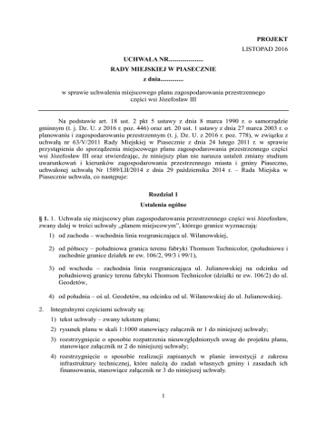 PROJEKT LISTOPAD 2016 UCHWAŁA NR..................... RADY MIEJSKIEJ W PIASECZNIE z dnia.............. w sprawie uchwalenia miejscowego planu zagospodarowania przestrzennego części wsi Józefosław III Na podstawie art. 18 ust. 2 pkt 5 ustawy z dnia 8 marca 1990 r. o samorządzie gminnym (t. j. Dz. U. z 2016 r. poz. 446) oraz art. 20 ust. 1 ustawy z dnia 27 marca 2003 r. o planowaniu i zagospodarowaniu przestrzennym (t. j. Dz. U. z 2016 r. poz. 778), w związku z uchwałą nr 63/V/2011 Rady Miejskiej w Piasecznie z dnia 24 lutego 2011 r. w sprawie przystąpienia do sporządzenia miejscowego planu zagospodarowania przestrzennego części wsi Józefosław III oraz stwierdzając, że niniejszy plan nie narusza ustaleń zmiany studium uwarunkowań i kierunków zagospodarowania przestrzennego miasta i gminy Piaseczno, uchwalonej uchwałą Nr 1589/LII/2014 z dnia 29 października 2014 r. – Rada Miejska w Piasecznie uchwala, co następuje: Rozdział 1 Ustalenia ogólne § 1. 1. Uchwala się miejscowy plan zagospodarowania przestrzennego części wsi Józefosław, zwany dalej w treści uchwały „planem miejscowym”, którego granice wyznaczają: 1) od zachodu – wschodnia linia rozgraniczająca ul. Wilanowskiej, 2) od północy – południowa granica terenu fabryki Thomson Technicolor, (południowe i zachodnie granice działek nr ew. 106/2, 99/3 i 99/1), 3) od wschodu – zachodnia linia rozgraniczająca ul. Julianowskiej na odcinku od południowej granicy terenu fabryki Thomson Technicolor (działki nr ew. 106/2) do ul. Geodetów, 4) od południa – oś ul. Geodetów, na odcinku od ul. Wilanowskiej do ul. Julianowskiej. 2. Integralnymi częściami uchwały są: 1) tekst uchwały – zwany tekstem planu; 2) rysunek planu w skali 1:1000 stanowiący załącznik nr 1 do niniejszej uchwały; 3) rozstrzygnięcie o sposobie rozpatrzenia nieuwzględnionych uwag do projektu planu, stanowiące załącznik nr 2 do niniejszej uchwały; 4) rozstrzygnięcie o sposobie realizacji zapisanych w planie inwestycji z zakresu infrastruktury technicznej, które należą do zadań własnych gminy i zasadach ich finansowania, stanowiące załącznik nr 3 do niniejszej uchwały. 1 § 2. 1. W niniejszej uchwale ustala się: 1) przeznaczenie terenów oraz linie rozgraniczające tereny o różnym przeznaczeniu lub różnych zasadach zagospodarowania; 2) zasady ochrony i kształtowania ładu przestrzennego; 3) zasady ochrony środowiska i przyrody oraz granice i sposoby zagospodarowania terenów lub obiektów podlegających ochronie na podstawie odrębnych przepisów; 4) zasady kształtowania zabudowy oraz wskaźniki zagospodarowania terenu, w tym: maksymalną i minimalną intensywność zabudowy jako wskaźnik powierzchni całkowitej zabudowy, w odniesieniu do powierzchni działki budowlanej, minimalny udział procentowy powierzchni biologicznie czynnej w odniesieniu do powierzchni działki budowlanej, maksymalną wysokość zabudowy, minimalną liczbę miejsc do parkowania, w tym miejsca przeznaczone na parkowanie pojazdów zaopatrzonych w kartę parkingową, linie zabudowy i gabaryty obiektów; 5) zasady i warunki scalania i podziału nieruchomości; 6) szczególne warunki i ograniczenia w zagospodarowaniu terenów; 7) zasady modernizacji, rozbudowy i budowy systemu komunikacji; 8) zasady modernizacji, rozbudowy i budowy systemów infrastruktury technicznej, 9) sposób i termin tymczasowego zagospodarowania, urządzania i użytkowania terenów; 10) stawkę procentową, na podstawie której ustala się opłatę związaną ze wzrostem wartości nieruchomości; 11) minimalną powierzchnię nowo wydzielanych działek budowlanych. 2. W niniejszej uchwale nie ustala się: 1) zasad ochrony dziedzictwa kulturowego i zabytków, w tym krajobrazów kulturowych oraz dóbr kultury współczesnej, z uwagi na brak w granicach obszaru objętego planem takich obiektów i terenów; 2) wymagań, wynikających z potrzeb kształtowania przestrzeni publicznych, z uwagi na brak w granicach obszaru objętego planem ustaleń w tym zakresie w Studium Uwarunkowań i Kierunków Zagospodarowania Przestrzennego Miasta i Gminy Piaseczno; 3) granic i sposobów zagospodarowania terenów górniczych, obszarów szczególnego zagrożenia powodzią oraz obszarów osuwania się mas ziemnych, z uwagi na brak w granicach obszaru objętego planem takich obiektów i terenów. § 3. Ilekroć w przepisach niniejszej uchwały jest mowa o: 1) detalu urbanistycznym – należy przez to rozumieć elementy, służące rozwiązaniu styku przestrzeni otwartej i zamkniętej (budynku) oraz wyposażenie terenów niezabudowanych, mające na celu nadanie im cech indywidualnych, np.: elementy związane z wypoczynkiem i zabawą – ławki, stoliki, huśtawki, przeplotnie itp., oświetlenie terenu, mury oporowe, schody terenowe, rampy, donice, pergole, ogrodzenia, balustrady, kosze na śmieci, elementy plastyczne – rzeźby, fontanny, oczka wodne itp.; 2 2) działce własnej – należy przez to rozumieć działkę ewidencyjną lub zespół działek ewidencyjnych, w tym działkę budowlaną, w stosunku do których inwestor lub użytkownik posiada prawo do dysponowania nieruchomością na cele budowlane; 3) froncie działki budowlanej – granicę działki budowlanej, która przylega bezpośrednio do drogi publicznej lub wewnętrznej, z której działka ta jest obsługiwana komunikacyjnie; 4) liniach rozgraniczających – należy przez to rozumieć linie, wyznaczające tereny przeznaczone dla różnych funkcji lub o różnych zasadach zagospodarowania, w tym tereny komunikacji; 5) liniach zabudowy nieprzekraczalnych – należy przez to rozumieć linie, ograniczające obszar, na którym dopuszcza się wznoszenie budynków oraz określonych w ustaleniach planu rodzajów budowli naziemnych i podziemnych, nie będących liniami przesyłowymi i sieciami uzbrojenia terenu; 6) liniach zabudowy obowiązujących – należy przez to rozumieć wyznaczone na działce linie, w