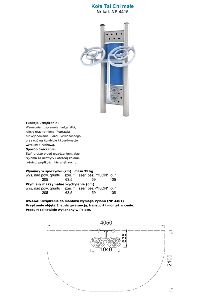 Koła Tai Chi małe Nr kat. NP 4415 Funkcje urządzenia: Wzmacnia i usprawnia nadgarstki, łokcie oraz ramiona. Poprawia funkcjonowanie układu krwionośnego oraz ogólną kondycję i koordynację wzrokowo-ruchową. Sposób ćwiczenia: Stań prosto przed urządzeniem, złap rękoma za uchwyty i obracaj kołami, różnicuj prędkość i kierunek ruchu. Wymiary w spoczynku (cm) wys. nad pow. gruntu 205 masa 35 kg szer. * 63,5 szer. bez PYLON* dł. * 59 105 Wymiary maksymalne wychylenie (cm) wys. nad pow. gruntu 205 szer. * 63,5 szer. bez PYLON* dł. * 59 105 UWAGA: Urządzenie do montażu wymaga Pylonu (NP 4401) Urządzenie objęte 3 letnią gwarancją, transport i montaż w cenie. Produkt całkowicie wykonany w Polsce.