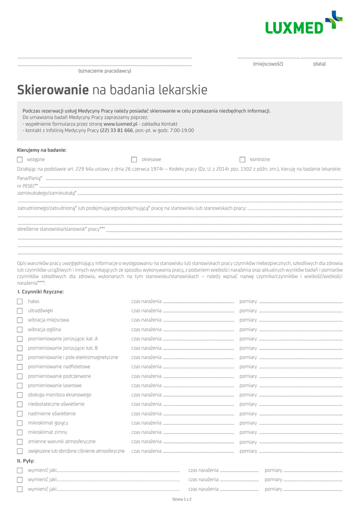 ....................................................................................................................................................................... ....................................................................................................................................................................... (oznaczenie pracodawcy) .........................................................., ........................................ (miejscowość) (data) Skierowanie na badania lekarskie Podczas rezerwacji usług Medycyny Pracy należy posiadać skierowanie w celu przekazania niezbędnych informacji. Do umawiania badań Medycyny Pracy zapraszamy poprzez: - wypełnienie formularza przez stronę www.luxmed.pl - zakładka Kontakt - kontakt z Infolinią Medycyny Pracy (22) 33 81 666, pon.-pt. w godz. 7:00-19:00 Kierujemy na badanie: wstępne okresowe kontrolne Działając na podstawie art. 229 §4a ustawy z dnia 26 czerwca 1974r – Kodeks pracy (Dz. U. z 2014r poz. 1502 z późn. zm.), kieruję na badanie lekarskie: Pana/Panią* ............................................................................................................................................................................................................................................................................................ nr PESEL** ................................................................................................................................................................................................................................................................................................... zamieszkałego/zamieszkałą* .............................................................................................................................................................................................................................................................. ....................................................................................................................................................................................................................................................................................................................... zatrudnionego/zatrudnioną* lub podejmującego/podejmującą* pracę na stanowisku lub stanowiskach pracy: ............................................................................................ ....................................................................................................................................................................................................................................................................................................................... ....................................................................................................................................................................................................................................................................................................................... określenie stanowiska/stanowisk* pracy*** .................................................................................................................................................................................................................................. ....................................................................................................................................................................................................................................................................................................................... ....................................................................................................................................................................................................................................................................................................................... ....................................................................................................................................................................................................................................................................................................................... Opis warunków pracy uwzględniający informacje o występowaniu na stanowisku lub stanowiskach pracy czynników niebezpiecznych, szkodliwych dla zdrowia lub czynników uciążliwych i innych wynikających ze sposobu wykonywania pracy, z podaniem wielkości narażenia oraz aktualnych wyników badań i pomiarów czynników szkodliwych dla zdrowia, wykonanych na tym stanowisku/stanowiskach – należy wpisać nazwę czynnika/czynników i wielkość/wielkości narażenia****: I. Czynniki fizyczne: hałas czas narażenia ................................................................................................................................................................................ pomiary pomiary ultradźwięki czas narażenia ................................................................................................................................................................................ pomiary pomiary wibracja miejscowa czas narażenia ................................................................................................................................................................................ pomiary pomiary wibracja ogólna czas narażenia ................................................................................................................................................................................ pomiary pomiary promieniowanie jonizujące: kat. A czas narażenia ................................................................................................................................................................................ pomiary pomiary promieniowanie jonizujące: kat. B czas narażenia ..............................