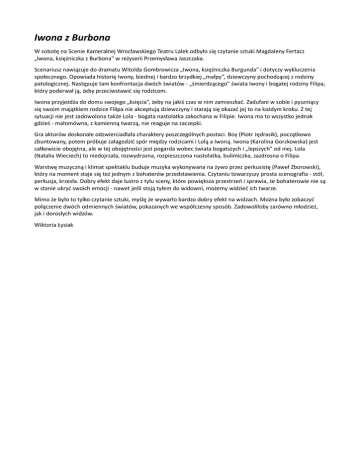 Iwona z Burbona W sobotę na Scenie Kameralnej Wrocławskiego Teatru Lalek odbyło się czytanie sztuki Magdaleny Fertacz „Iwona, księżniczka z Burbona" w reżyserii Przemysława Jaszczaka. Scenariusz nawiązuje do dramatu Witolda Gombrowicza „Iwona, księżniczka Burgunda" i dotyczy wykluczenia społecznego. Opowiada historię Iwony, biednej i bardzo brzydkiej „małpy”, dziewczyny pochodzącej z rodziny patologicznej. Następuje tam konfrontacja dwóch światów - „śmierdzącego" świata Iwony i bogatej rodziny Filipa, który poderwał ją, żeby przeciwstawić się rodzicom. Iwona przyjeżdża do domu swojego „księcia”, żeby na jakiś czas w nim zamieszkać. Zadufani w sobie i pyszniący się swoim majątkiem rodzice Filipa nie akceptują dziewczyny i starają się okazać jej to na każdym kroku. Z tej sytuacji nie jest zadowolona także Lola - bogata nastolatka zakochana w Filipie. Iwona ma to wszystko jednak gdzieś - małomówna, z kamienną twarzą, nie reaguje na zaczepki. Gra aktorów doskonale odzwierciadlała charaktery poszczególnych postaci. Boy (Piotr Jędrasik), początkowo zbuntowany, potem próbuje załagodzić spór między rodzicami i Lolą a Iwoną. Iwona (Karolina Gorzkowska) jest całkowicie obojętna, ale w tej obojętności jest pogarda wobec świata bogatszych i „lepszych” od niej. Lola (Natalia Wieciech) to niedojrzała, rozwydrzona, rozpieszczona nastolatka, bulimiczka, zazdrosna o Filipa. Warstwę muzyczną i klimat spektaklu buduje muzyka wykonywana na żywo przez perkusistę (Paweł Zborowski), który na moment staje się też jednym z bohaterów przedstawienia. Czytaniu towarzyszy prosta scenografia - stół, perkusja, krzesła. Dobry efekt daje lustro z tyłu sceny, które powiększa przestrzeń i sprawia, że bohaterowie nie są w stanie ukryć swoich emocji - nawet jeśli stoją tyłem do widowni, możemy widzieć ich twarze. Mimo że było to tylko czytanie sztuki, myślę że wywarło bardzo dobry efekt na widzach. Można było zobaczyć połączenie dwóch odmiennych światów, pokazanych we współczesny sposób. Zadowoliłoby zarówno młodzież, jak i dorosłych widzów. Wiktoria Łysiak